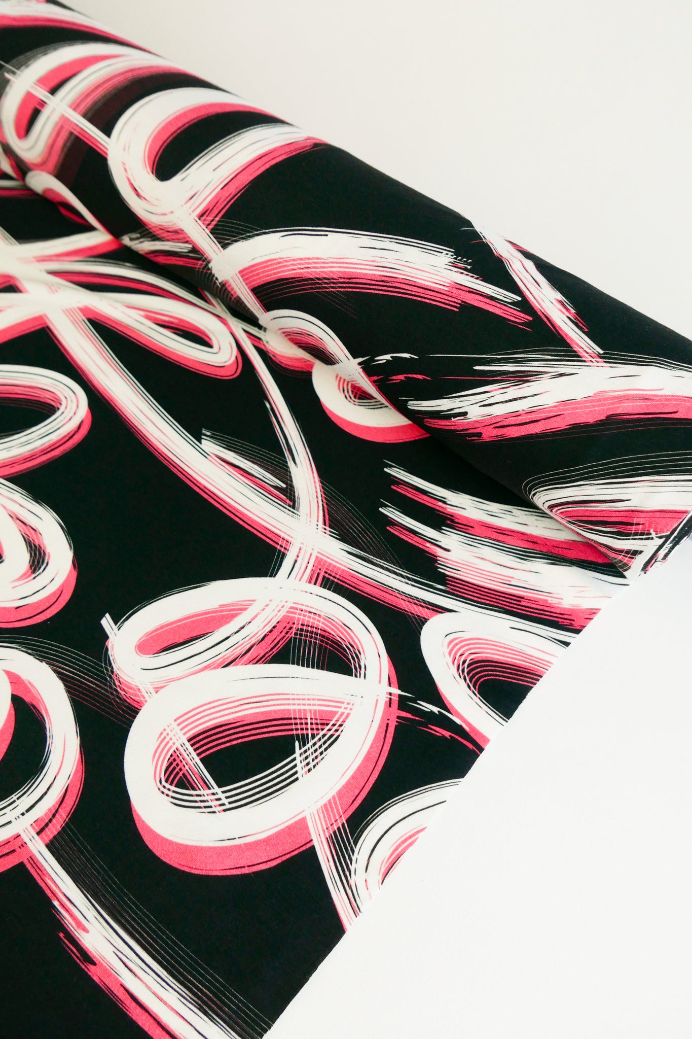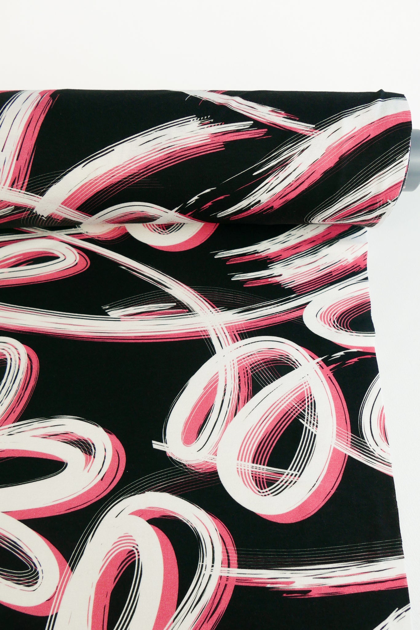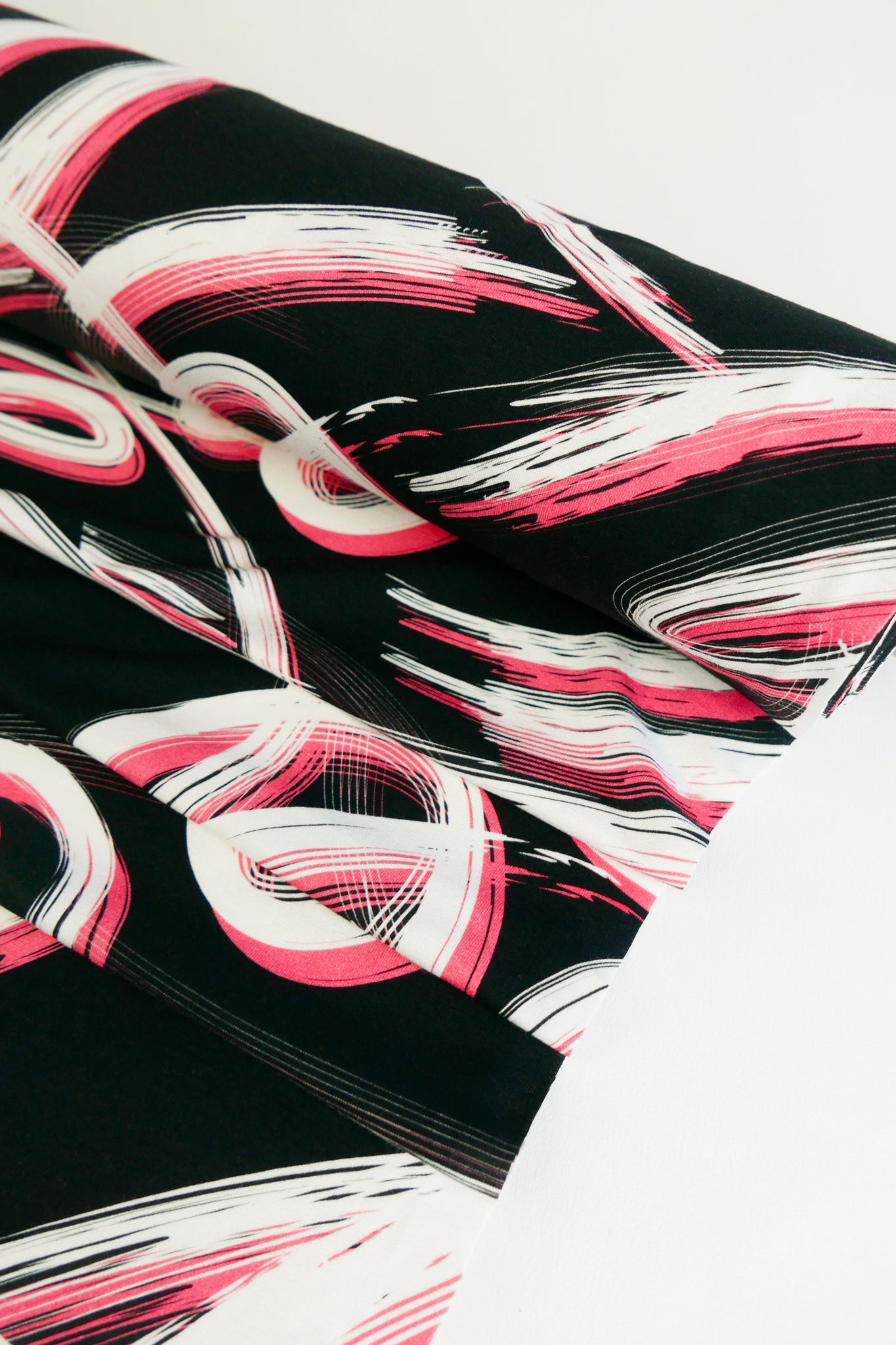 Dublin is an extravagant printed viscose knit in a lolly colourway. Lightweight and full of drape, it's perfect to recreate those vintage DVF pieces. It features a vibrant print in lolly pink and black on an off-white base cloth. Anti-pill and anti-curl, Dublin is completely opaque with four-way stretch. It would make the perfect form-fitting dress, a colourful turtleneck layering piece, a show-stopping bias-cut piece or the cutest lounge set.