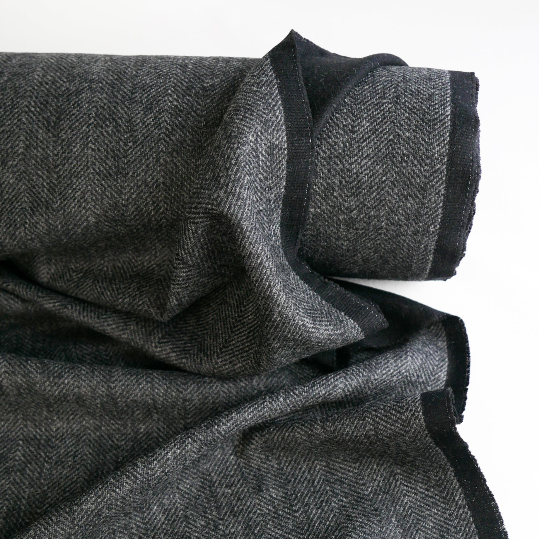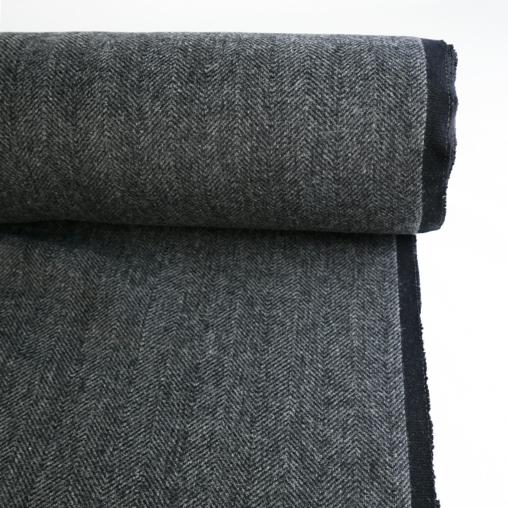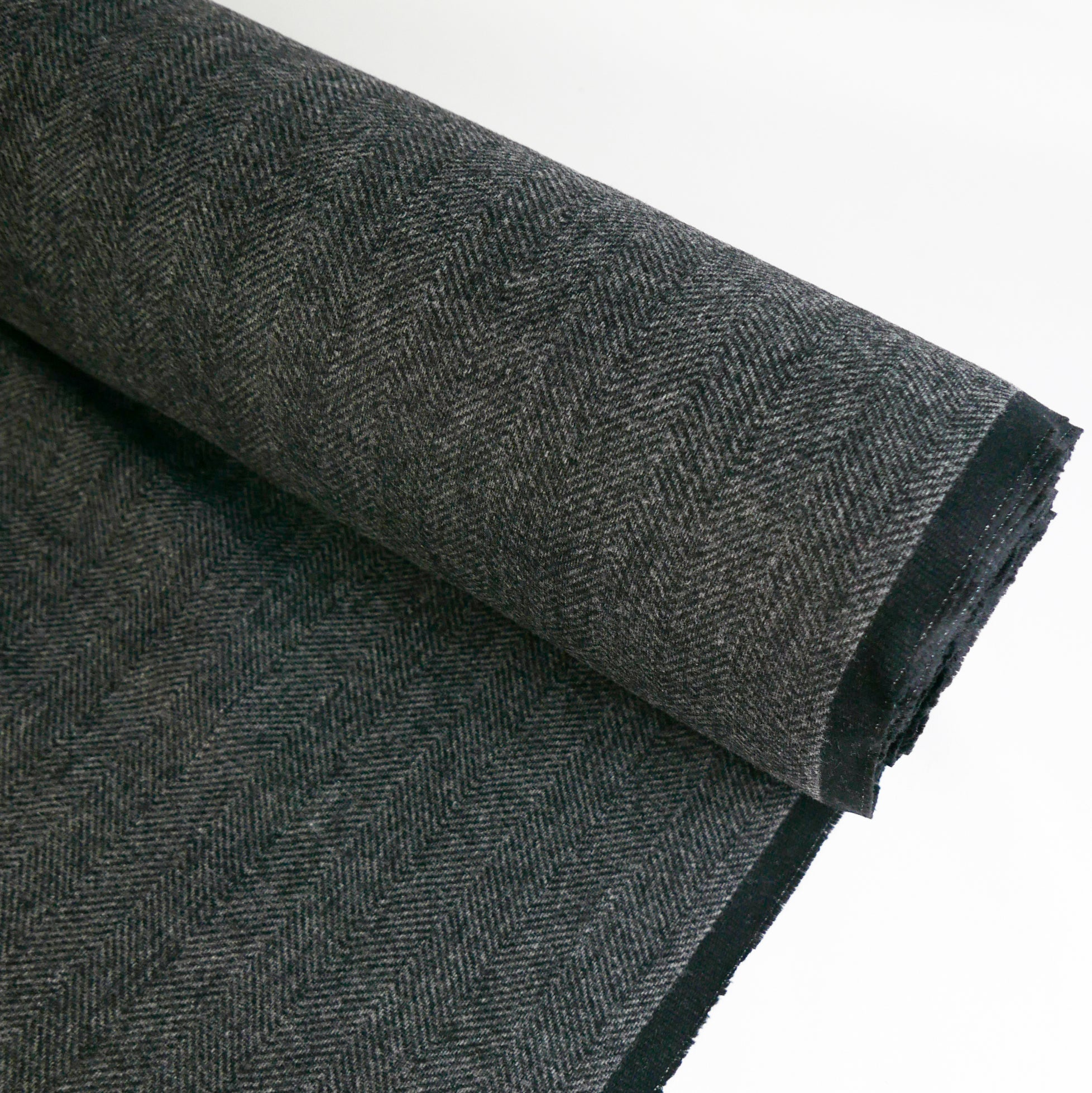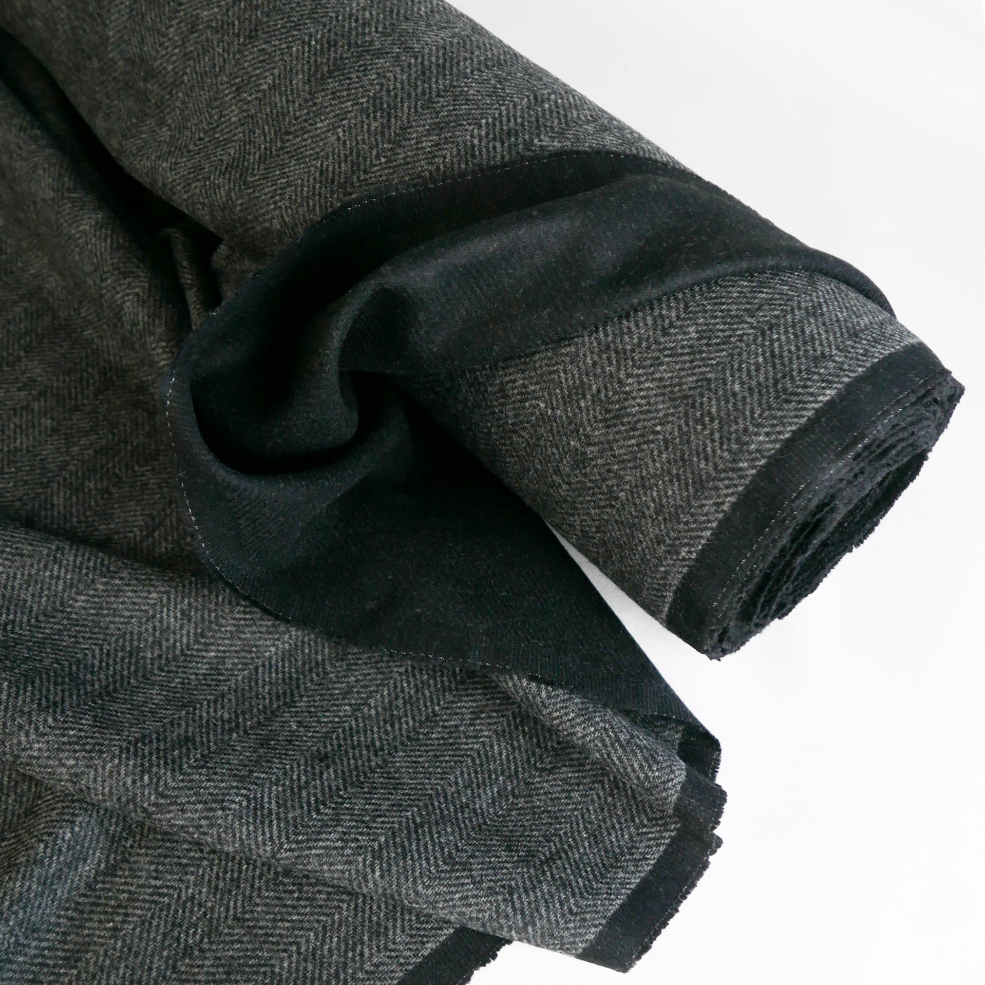 Lollino is a stunning tactile wool coating. It is double-faced, one side featuring a classic herringbone design in charcoal and the reverse plain black. It is bouncy and soft to handle, holds structure well and is very tactile and fun. Being midweight, it would make up into an incredible winter jacket.