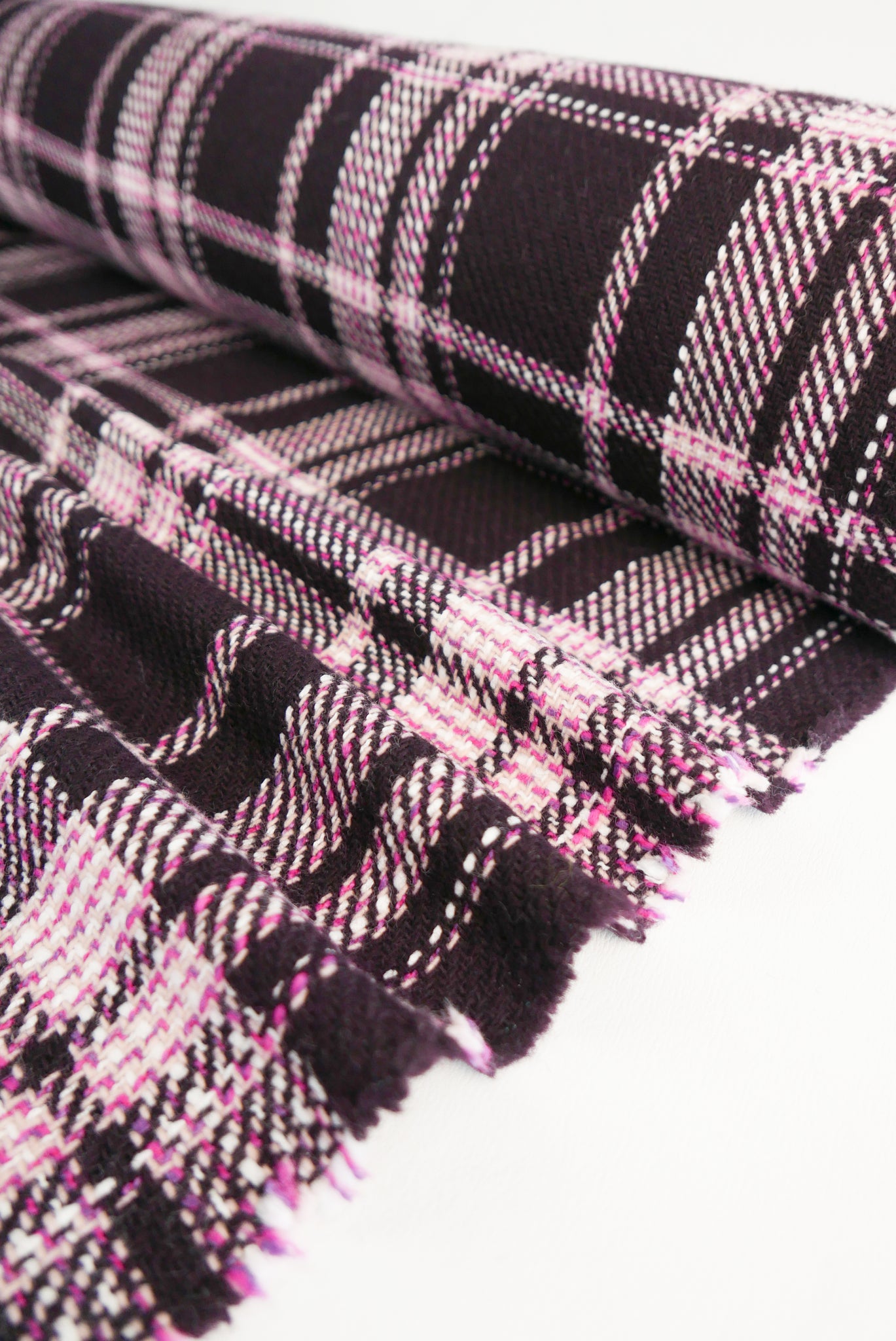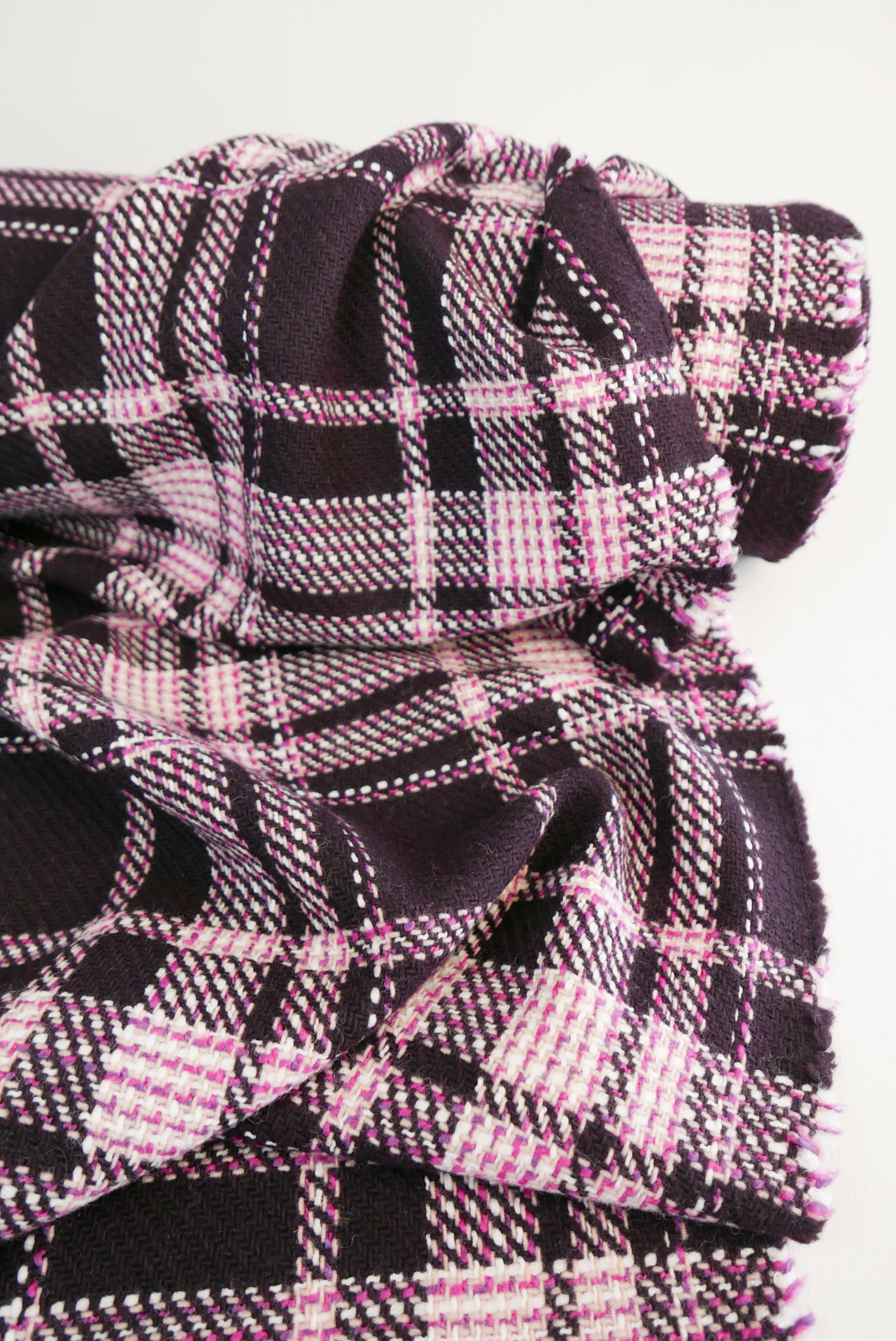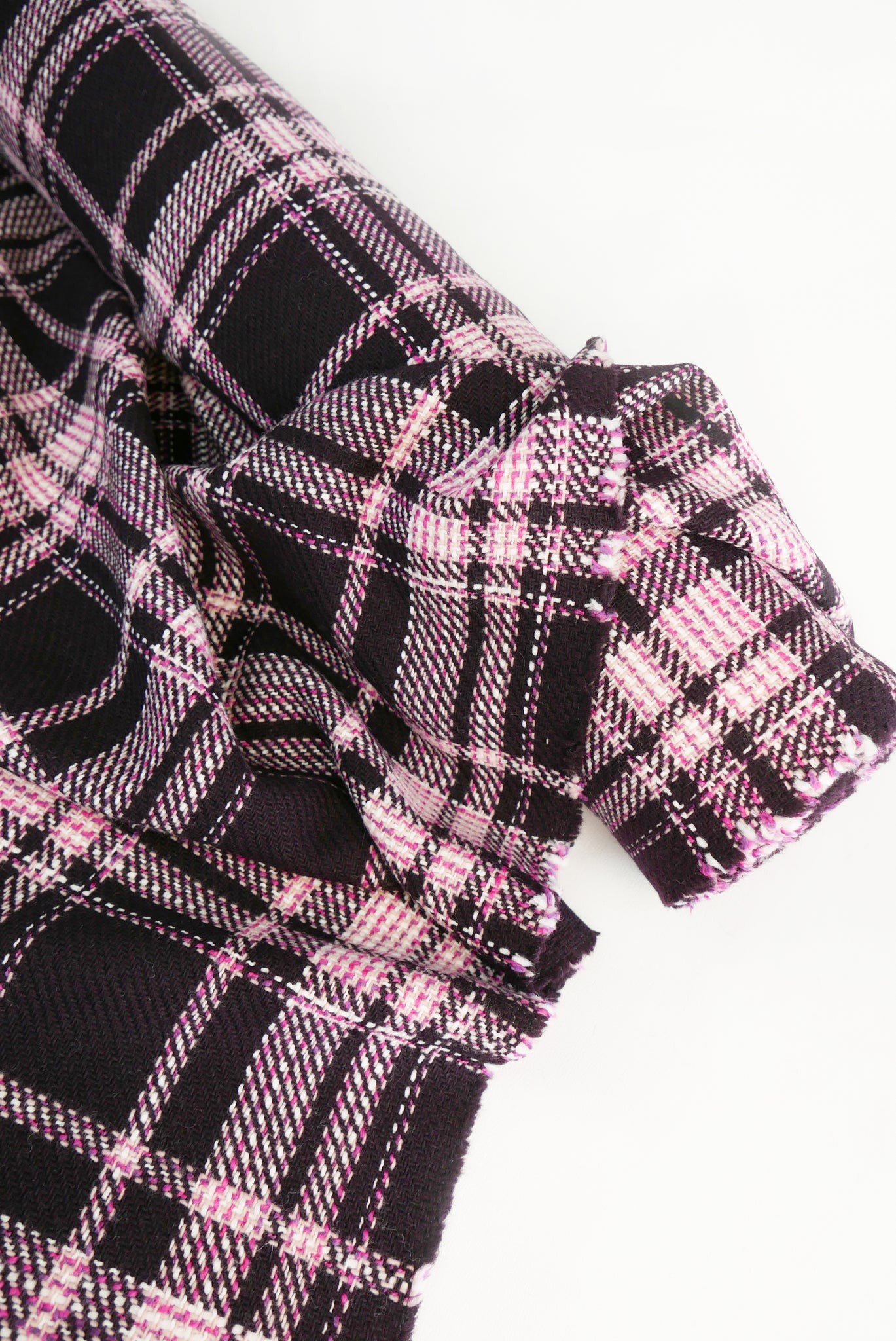 Meringue is a fabulous wool boucle with a contrasting fuchsia and marshmallow check design against a deep aubergine base. It's incredibly tactile and fun, reminiscent of couture boucle designs by Chanel. Midweight with gently structured drape, it has a subtle natural stretch due to its loose weave and would make up into an incredible winter jacket, coat or skirt.