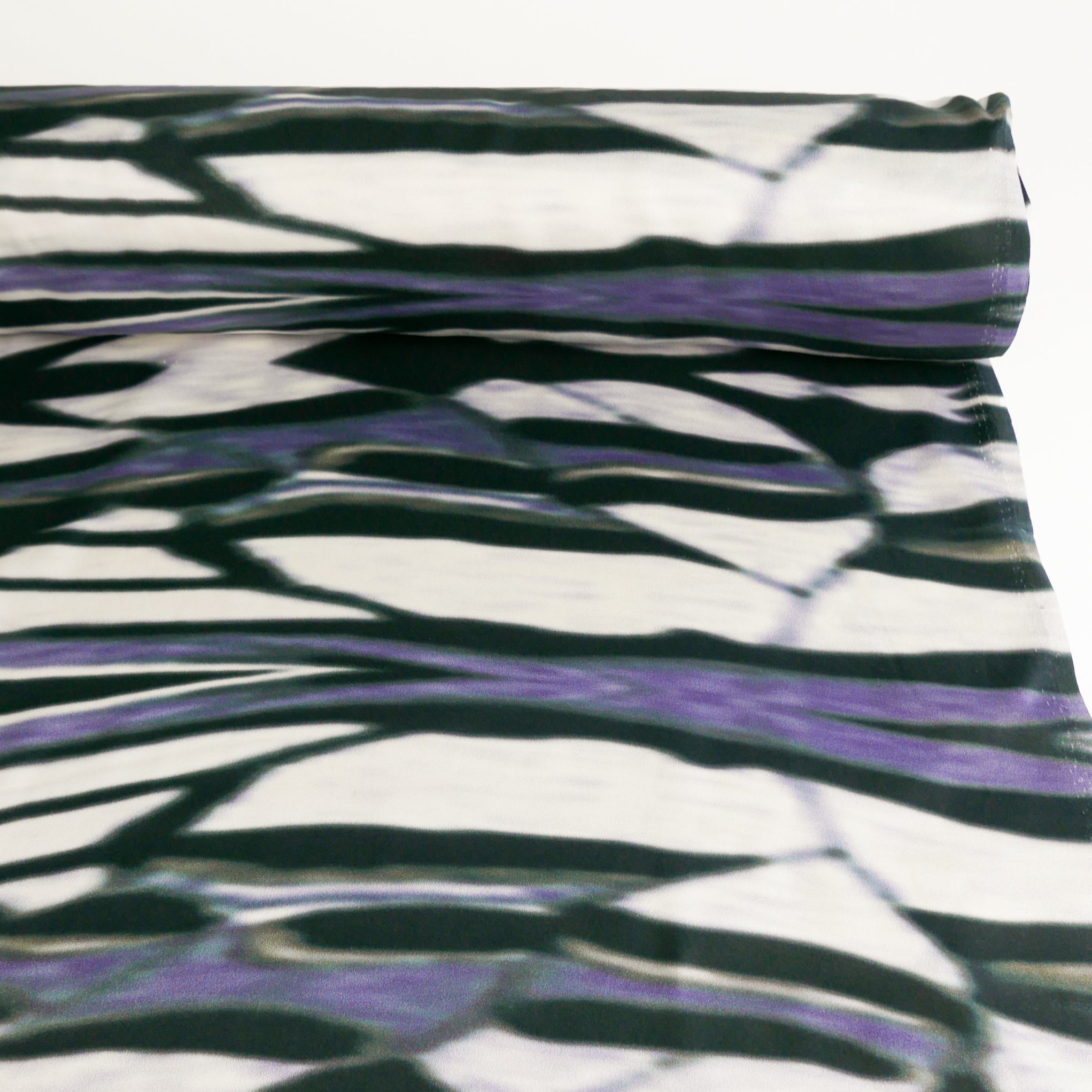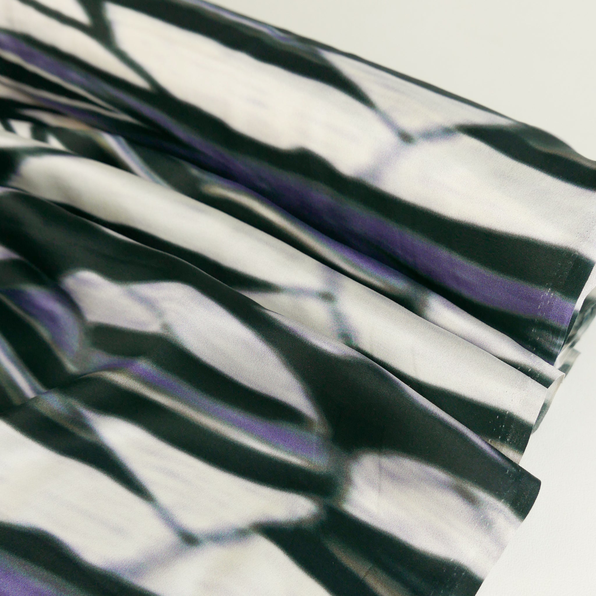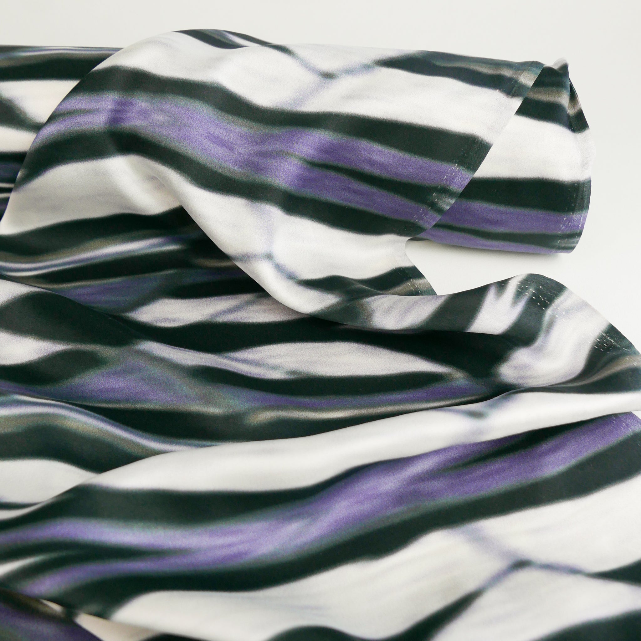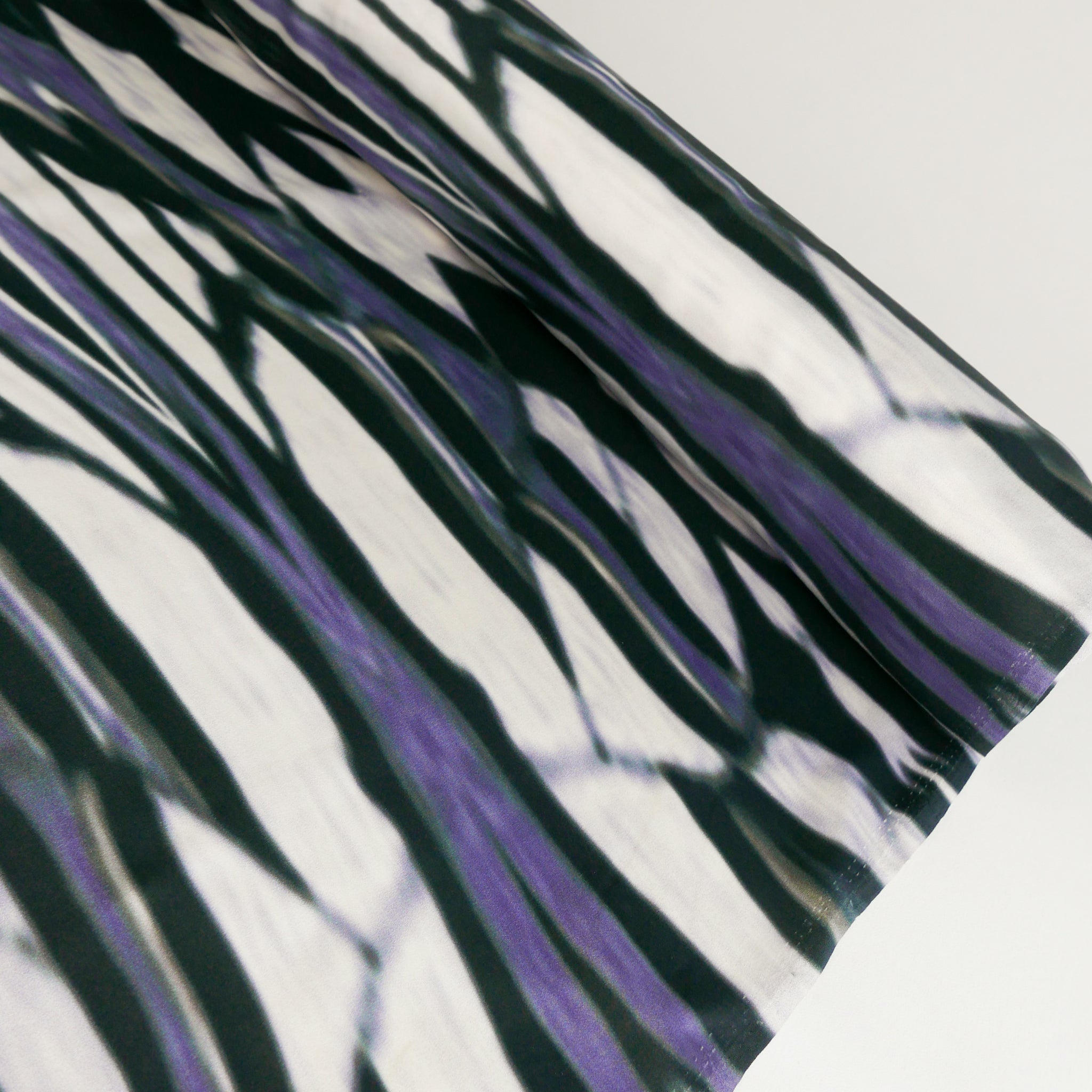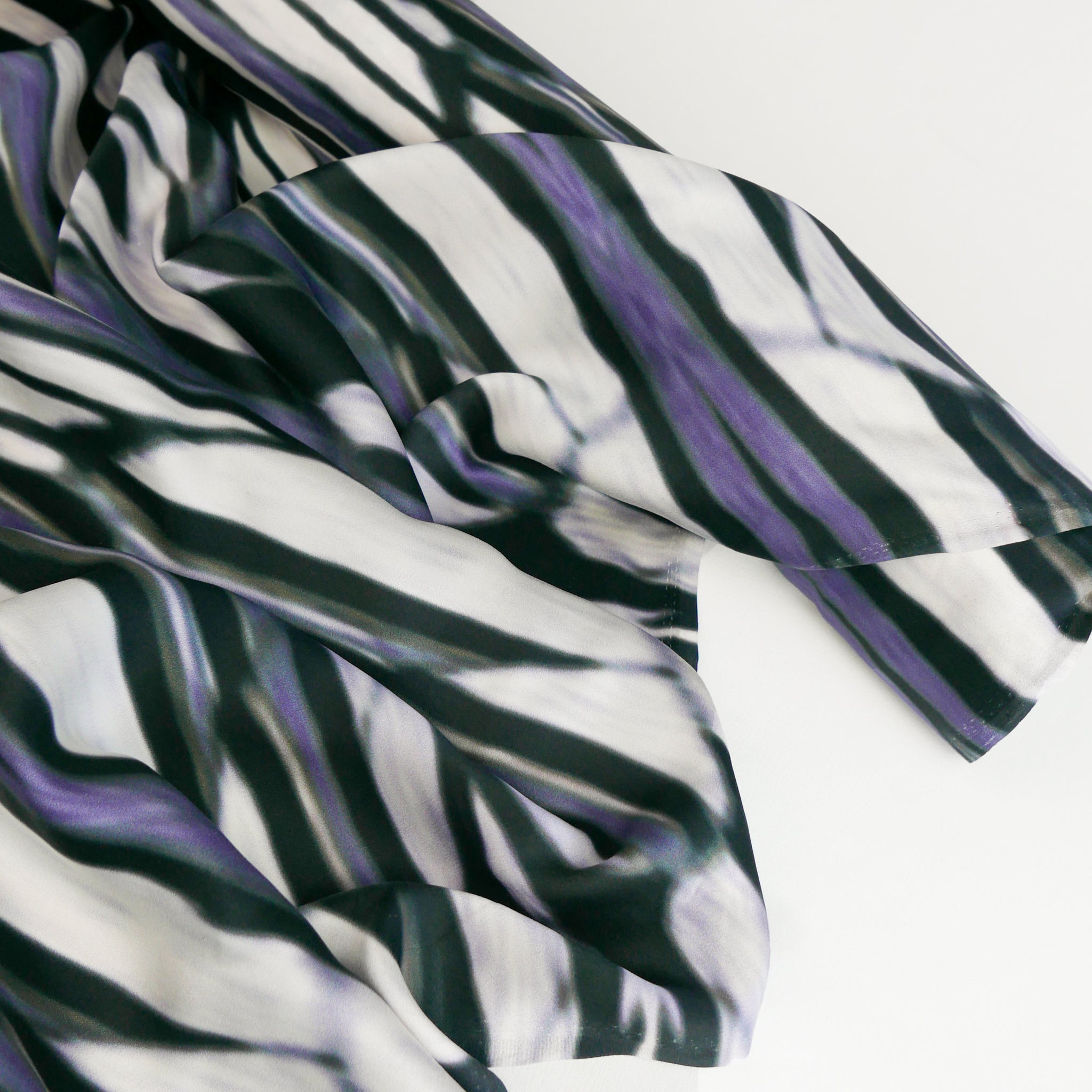 This is a luxurious, pure silk satin. It features a striking print in black, purple and white with hints of green throughout. It has a wonderfully soft feel and a fluid drape that makes it perfect for garments with movement, like dresses, blouses, and skirts.