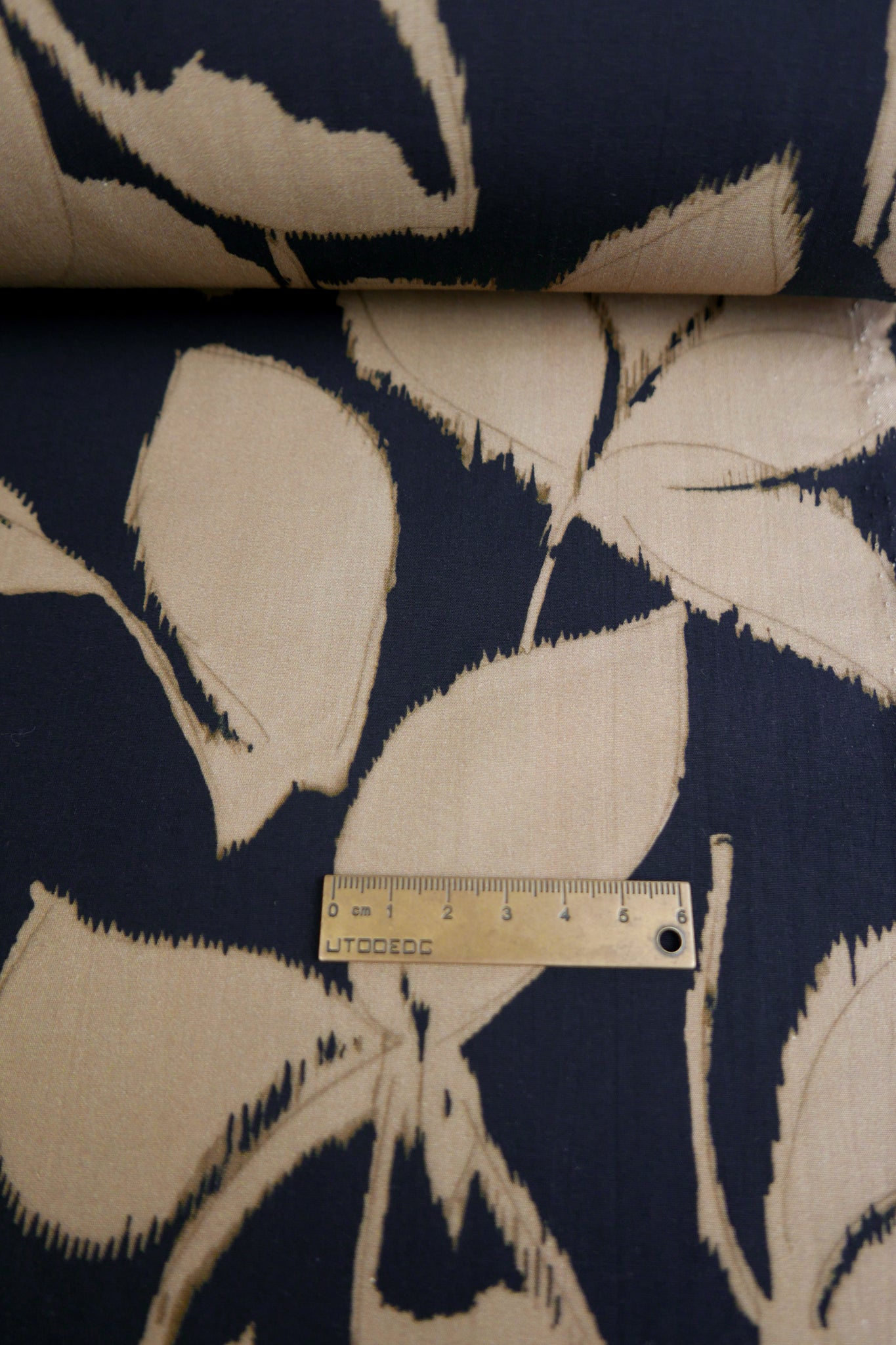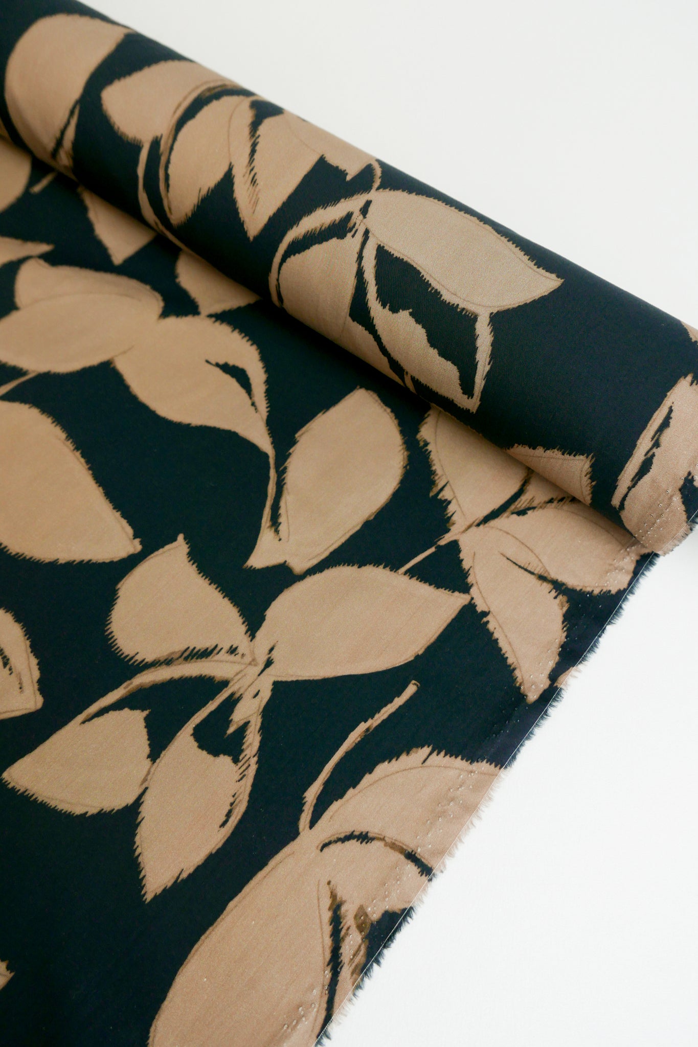 Freesia is a crisp printed cotton from Lyon, France, featuring a large printed leaf design in tea on a black cloth. It's crisp, structured and the ideal shirting weight cotton for summer garments. Completely opaque, Freesia would make up well as a shirt, skirt, trousers, dress and even striking bed wear.
