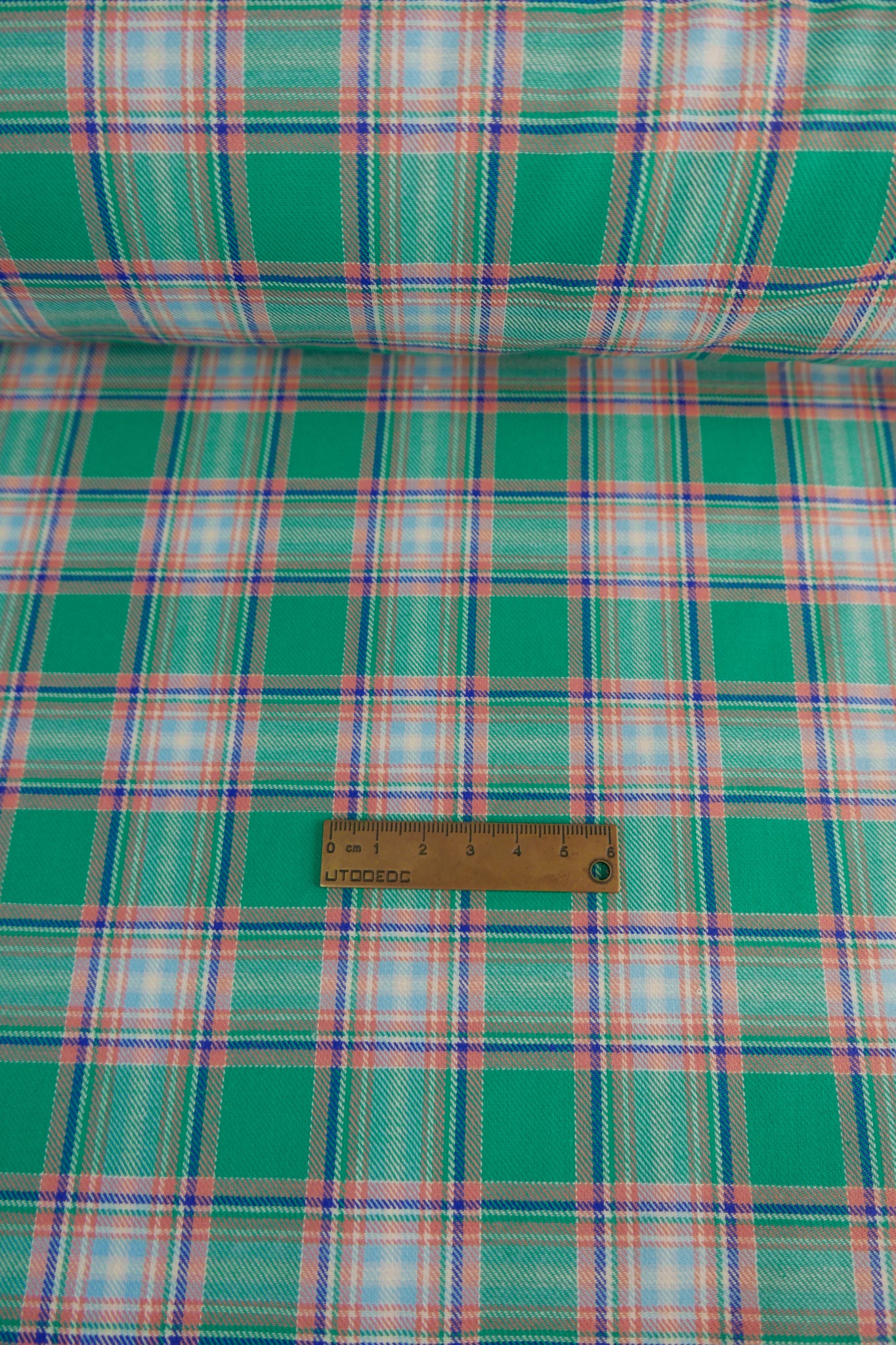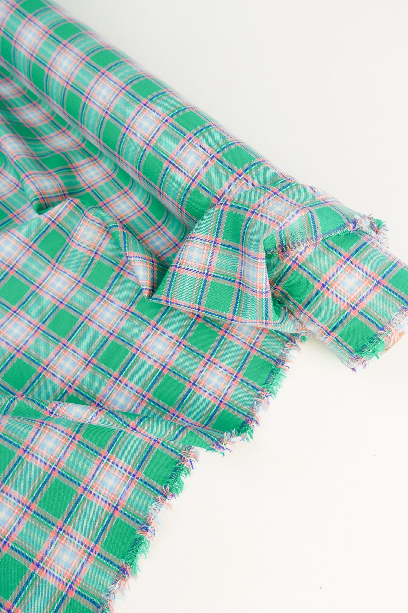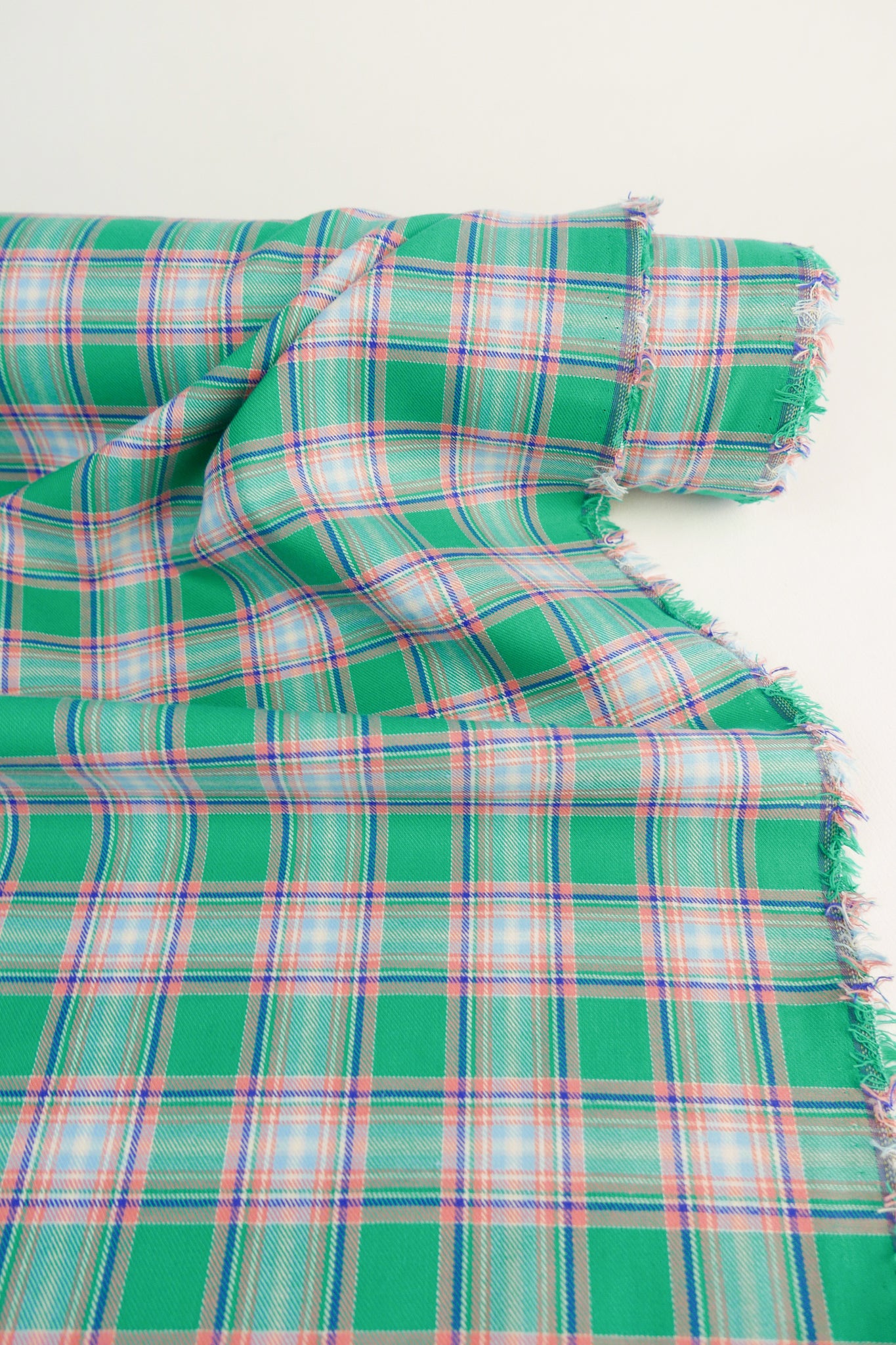 Oliver cotton flannel features a woven plaid design in pink, blue, and off-white on a bright mint green coloured cloth. Soft to the touch and double-faced, it's midweight, holds soft structure, and is perfect for making jackets, shirts, and trousers.
