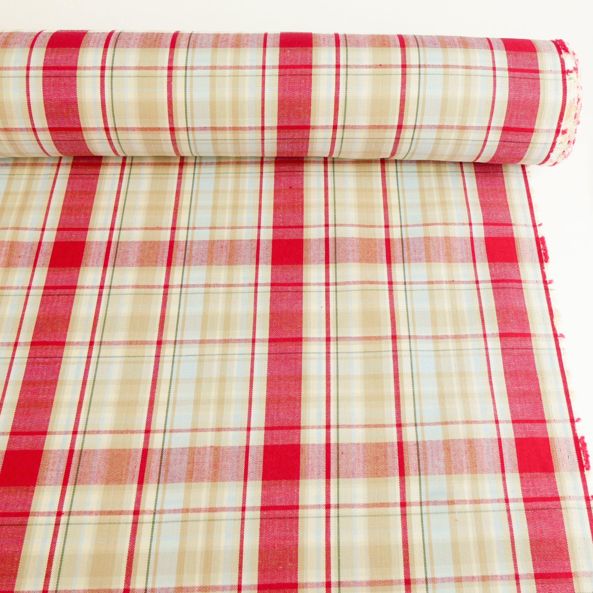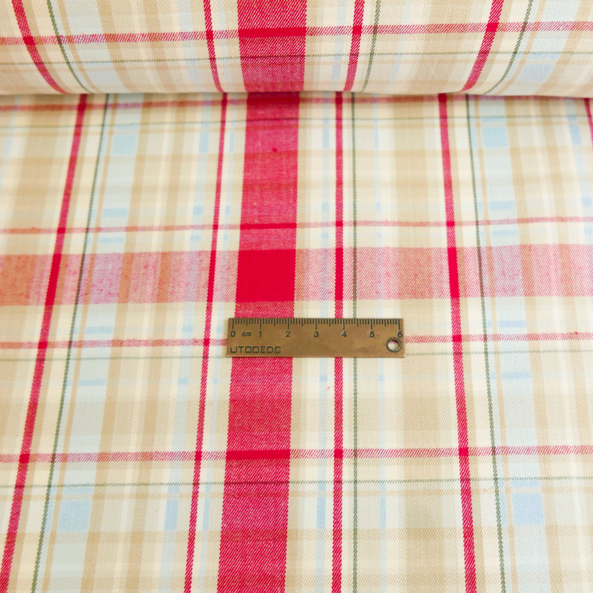 Laurent is a vibrant French cotton featuring a check design in raspberry, soft beige, light blue, and cream. It's midweight, with a fine twill and smooth hand feel. Completely opaque and holding good structure, Laurent will make into striking shirts, dresses, summer pants and skirts that you won't want to take off.