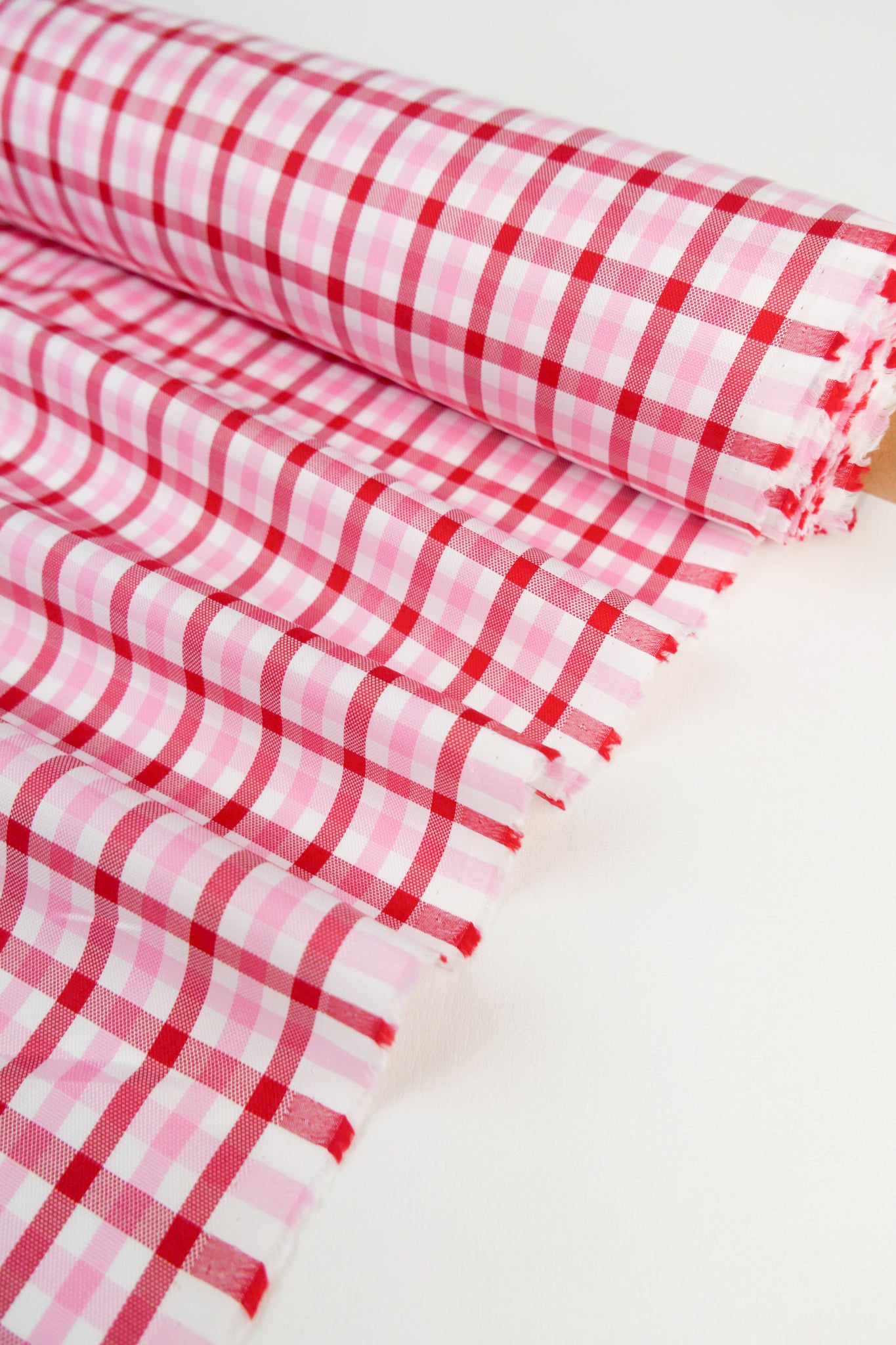 Shibuya is a vibrant Japanese cotton shirting with a Karami weave, a Japanese textile technique where warp yarns are twisted around each other to create open spaces in the fabric, creating a breathable and lightweight material. It features a check design in baby pink, red and off-white. Lightweight, it has a soft, smooth finish and holds soft structure. Completely opaque, Shibuya will make into striking shirts, dresses, summer pants and skirts that you won't want to take off.