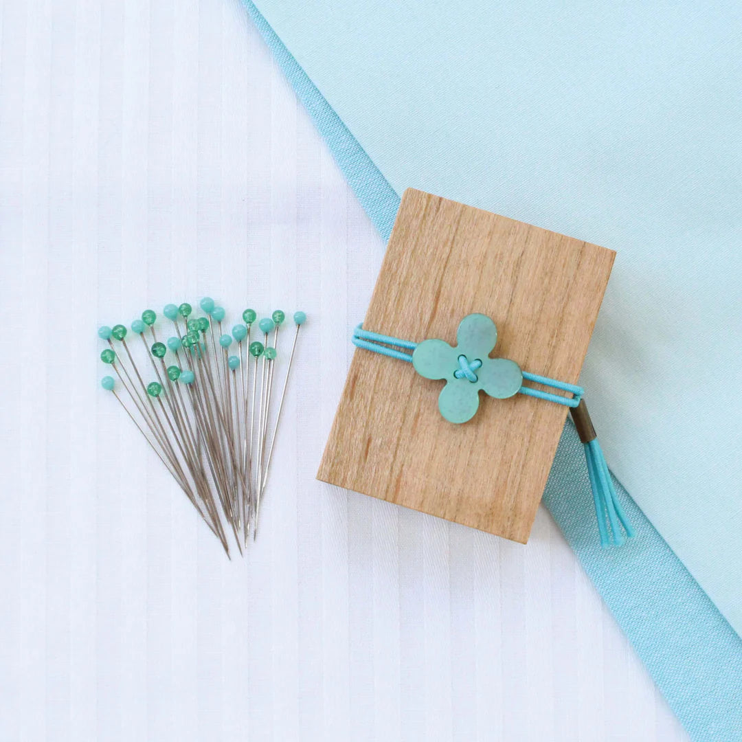 Beautiful sewing pins enclosed in a compact cherry-wood box. 30 pins are included, featuring colour-coordinated translucent and opaque glass pinheads. These pins are supple yet durable and are manufactured in Hiroshima, a city with a 300-year history of high-quality needle production. Rigorous quality control ensures unified thickness and length of pins and their ability to pierce cloth with ease. The small glass top provides more versatility.