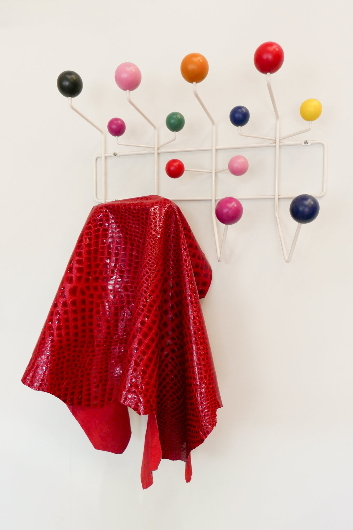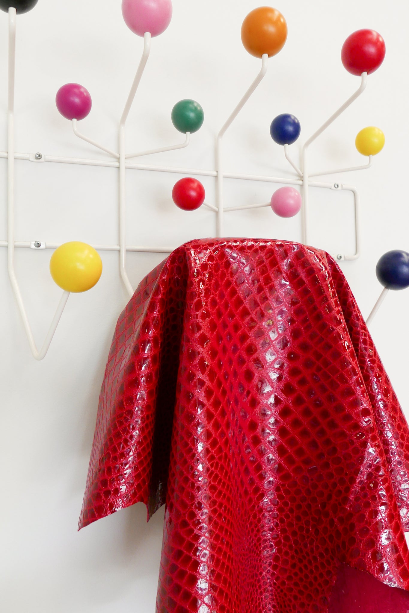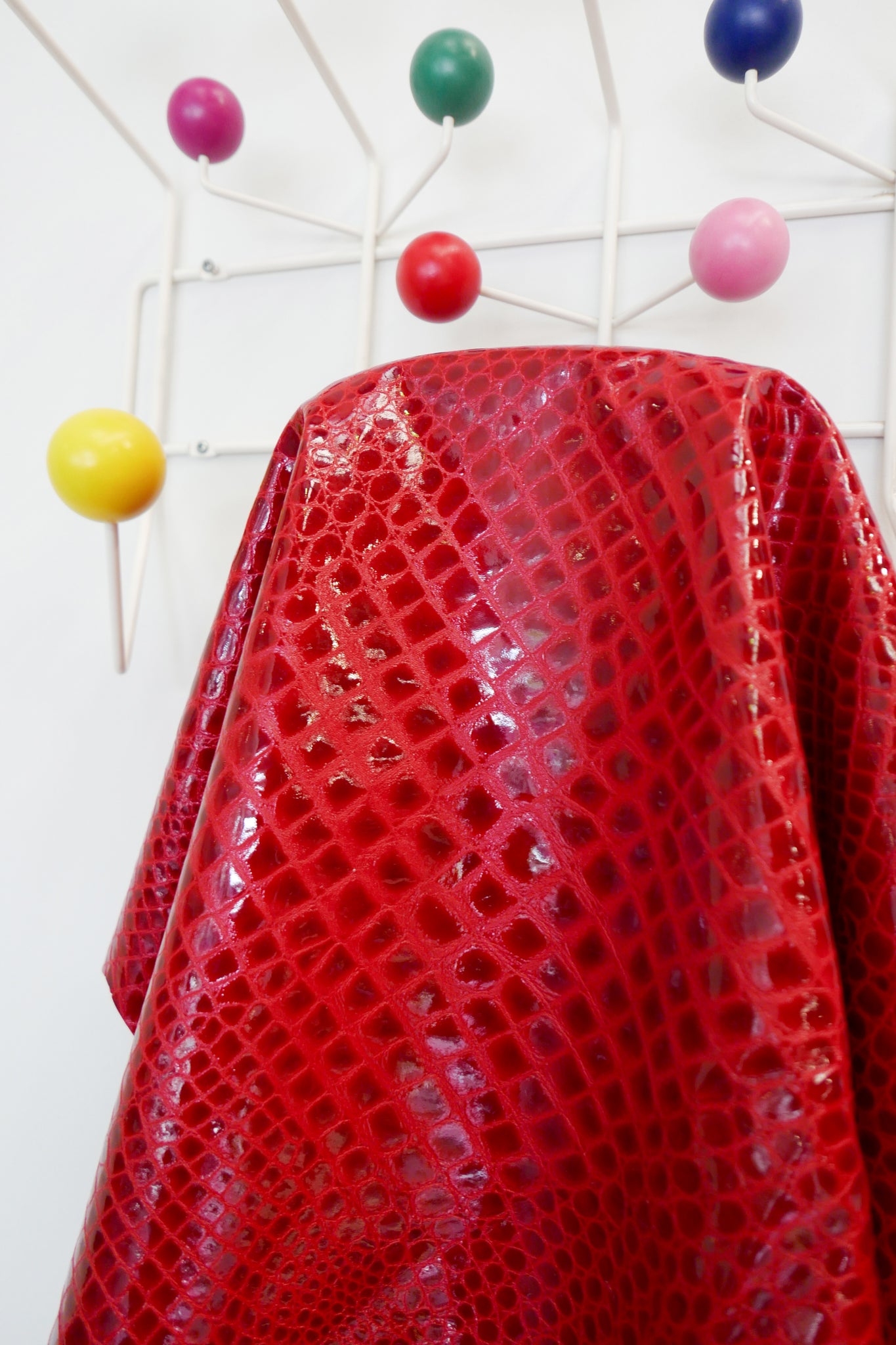 A Drapers staff favourite, this is a very special Italian lamb hide. With a shiny, laminated finish in cherry red croc and a smooth suede on the reverse, it is lightweight and holds structure beautifully. Pliable and soft, it's perfect for eventwear, accessories, bags and more.