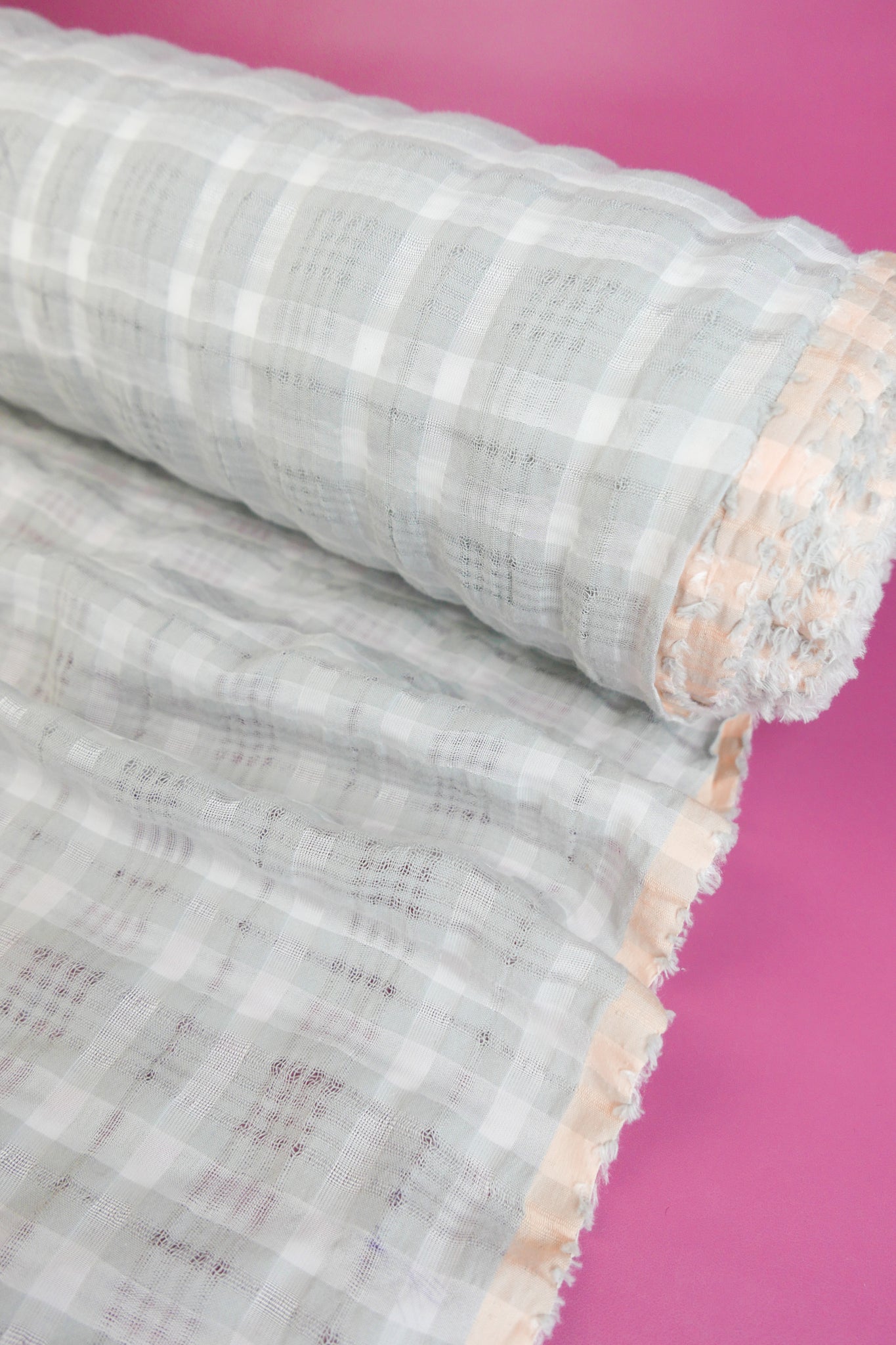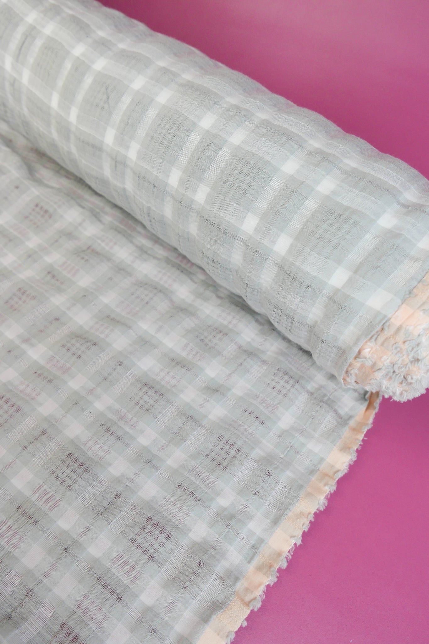 This linen cotton is a unique seersucker. Featuring a timeless yarn-dyed check design in dove grey and off-white, it has a softly puckered texture. Lightweight and semi-opaque, this is the perfect summer fabric. It's ideal for breathable shirts, dresses, summer pants and skirts that you won't want to take off.