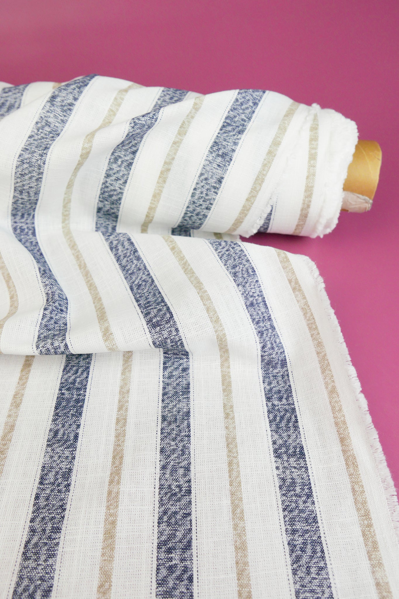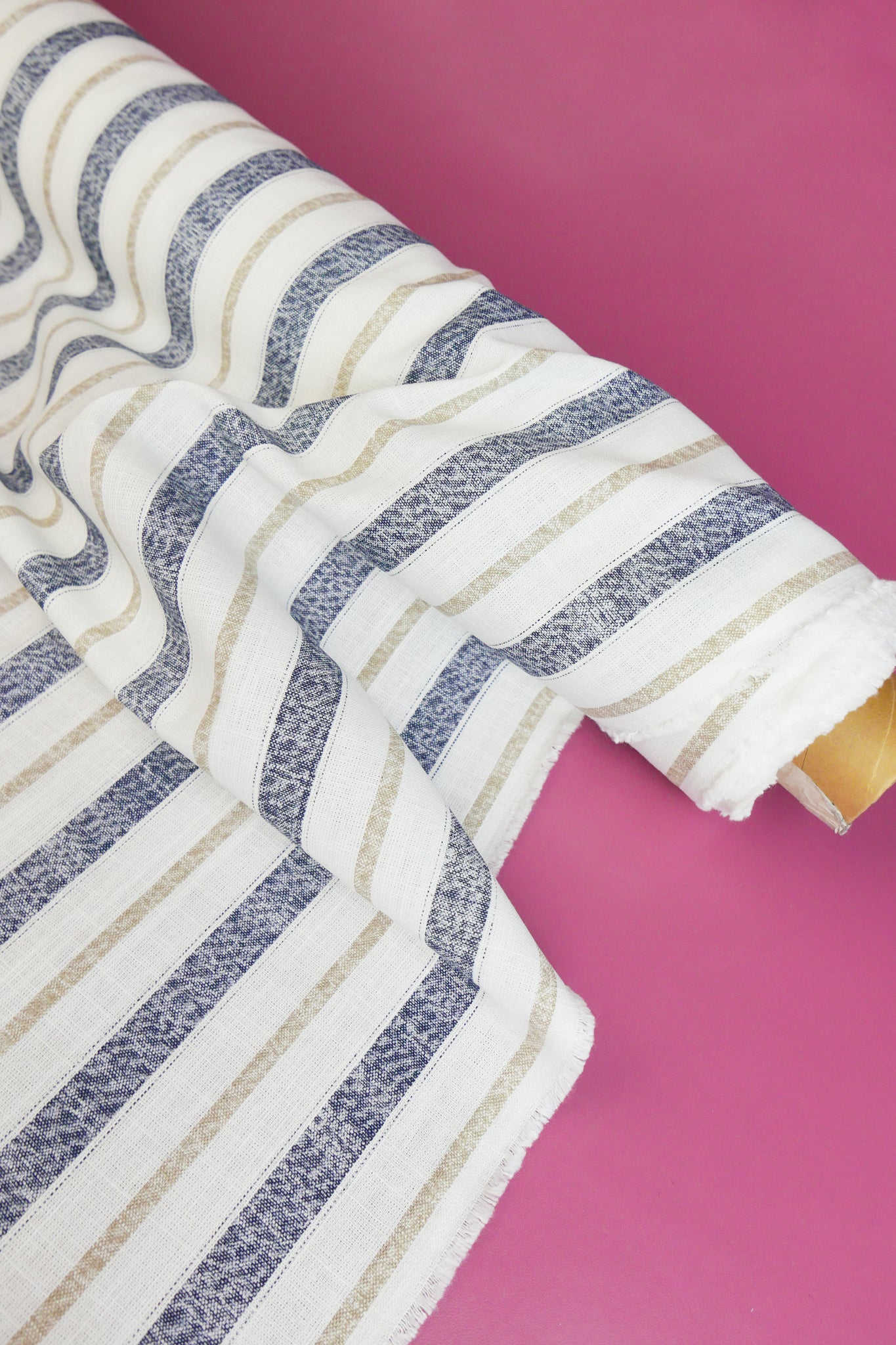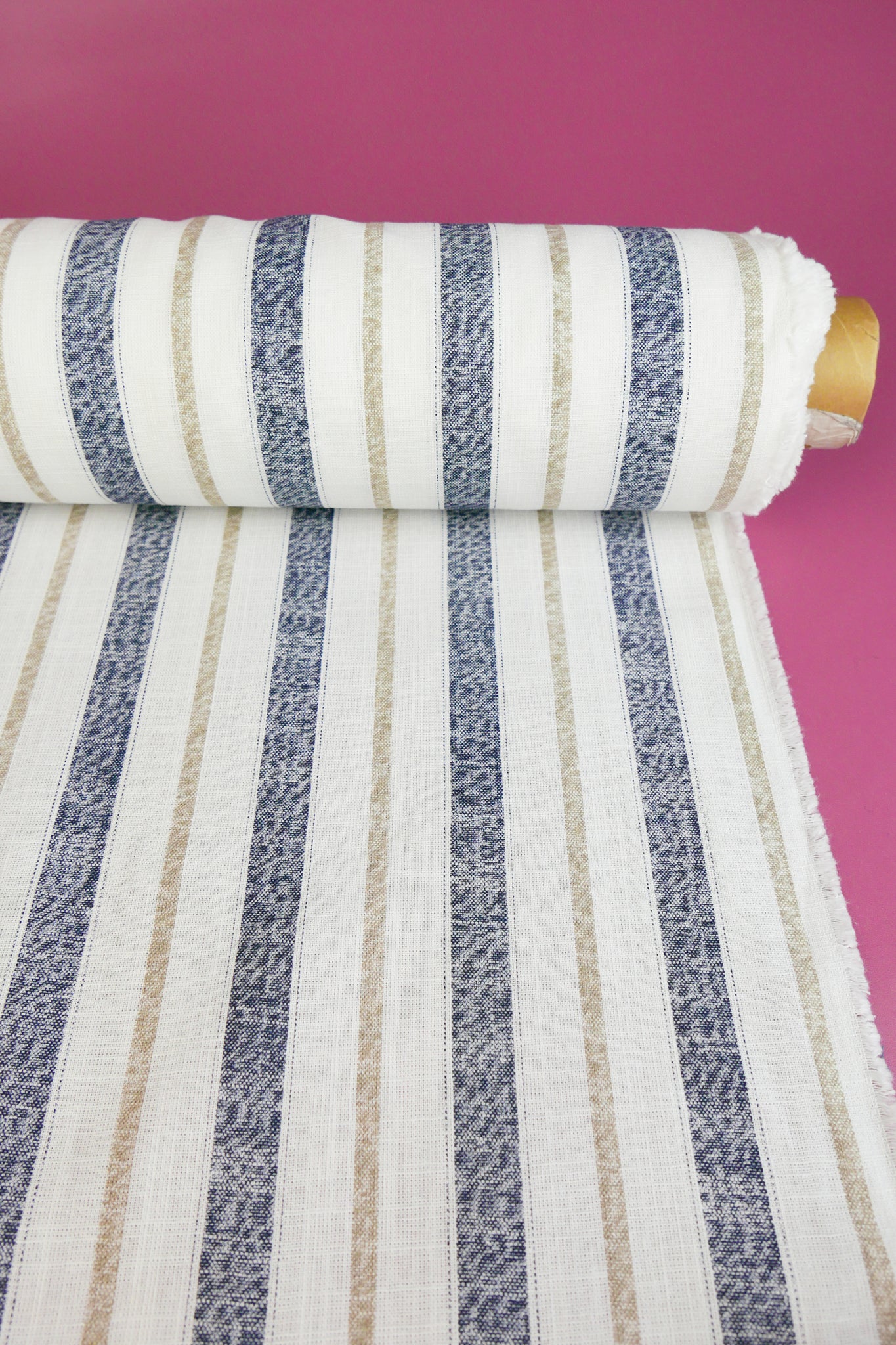 Simon is a classic midweight linen with slubs throughout, with a printed stripe design in navy and beige on an off-white cloth. Mostly opaque, it has a summery, everyday quality to it with good structure. Perfect for summer-weight dresses, blouses and skirts.