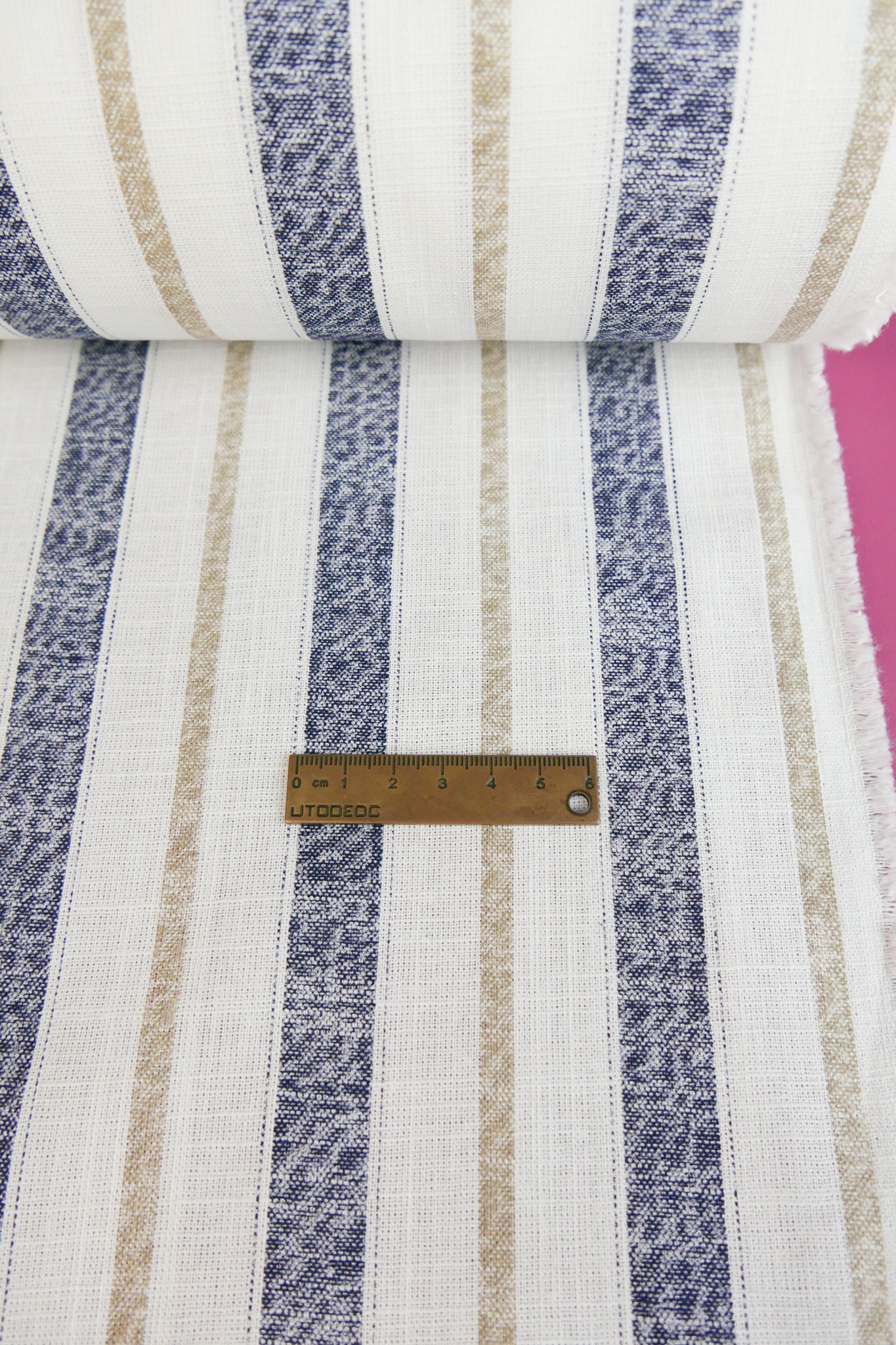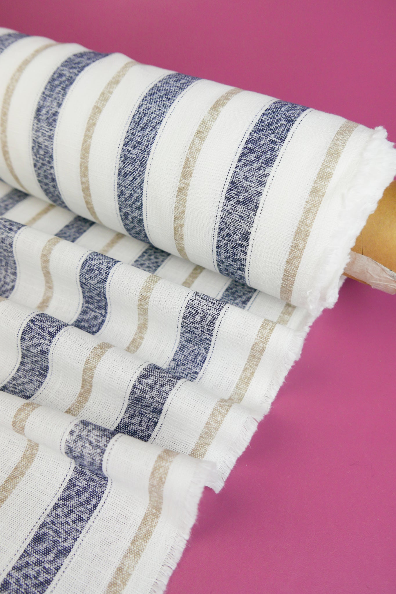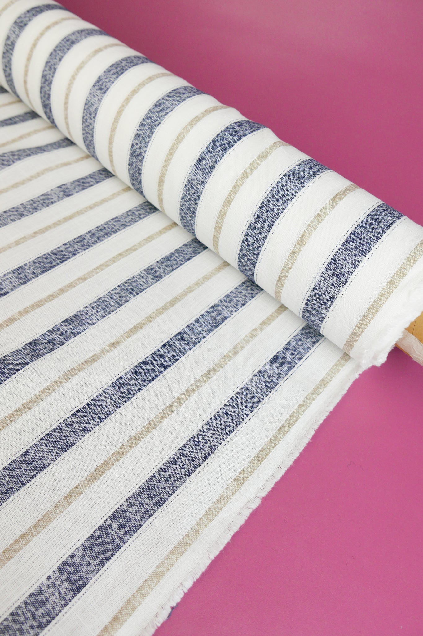 Simon is a classic midweight linen with slubs throughout, with a printed stripe design in navy and beige on an off-white cloth. Mostly opaque, it has a summery, everyday quality to it with good structure. Perfect for summer-weight dresses, blouses and skirts.