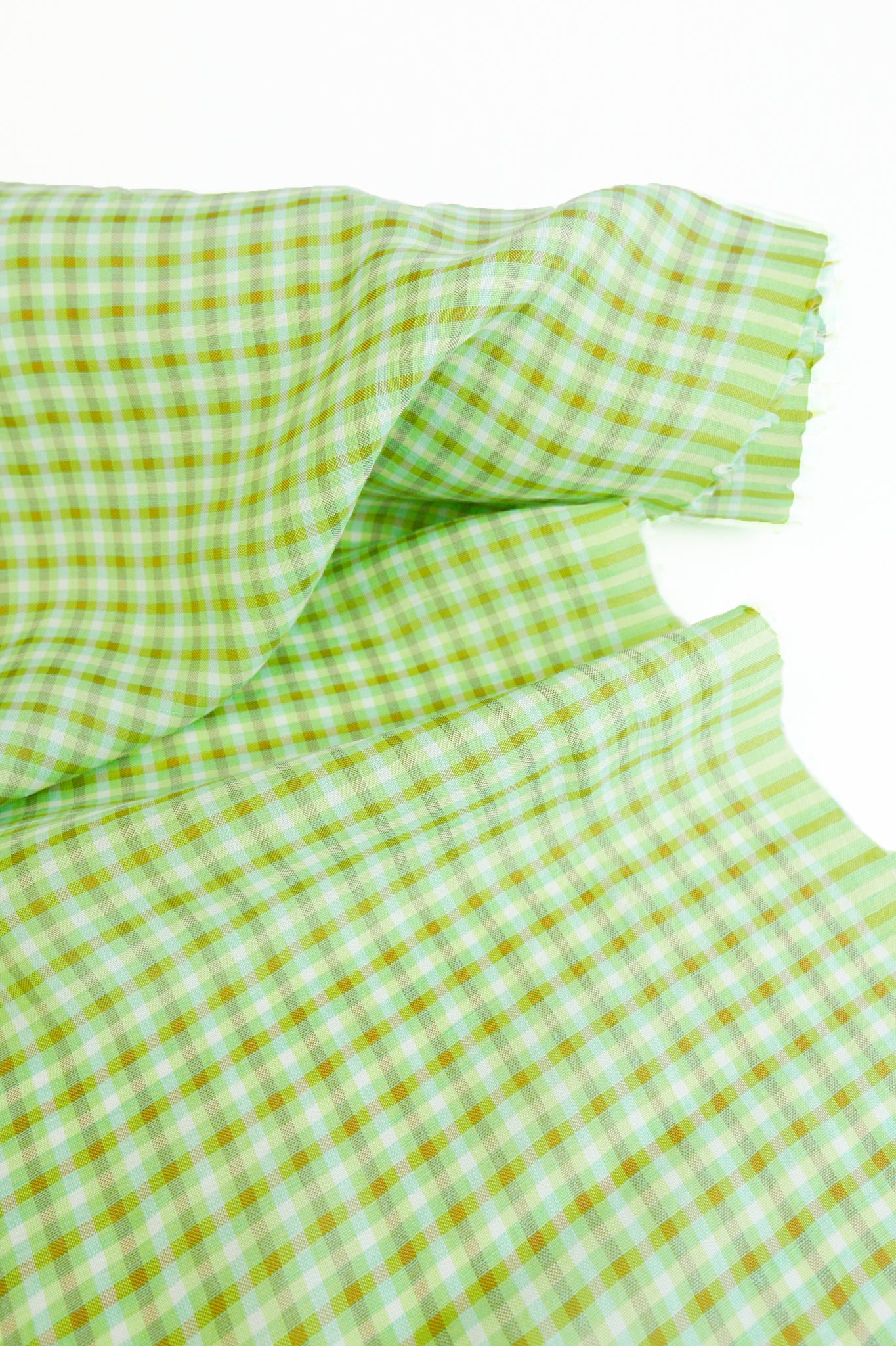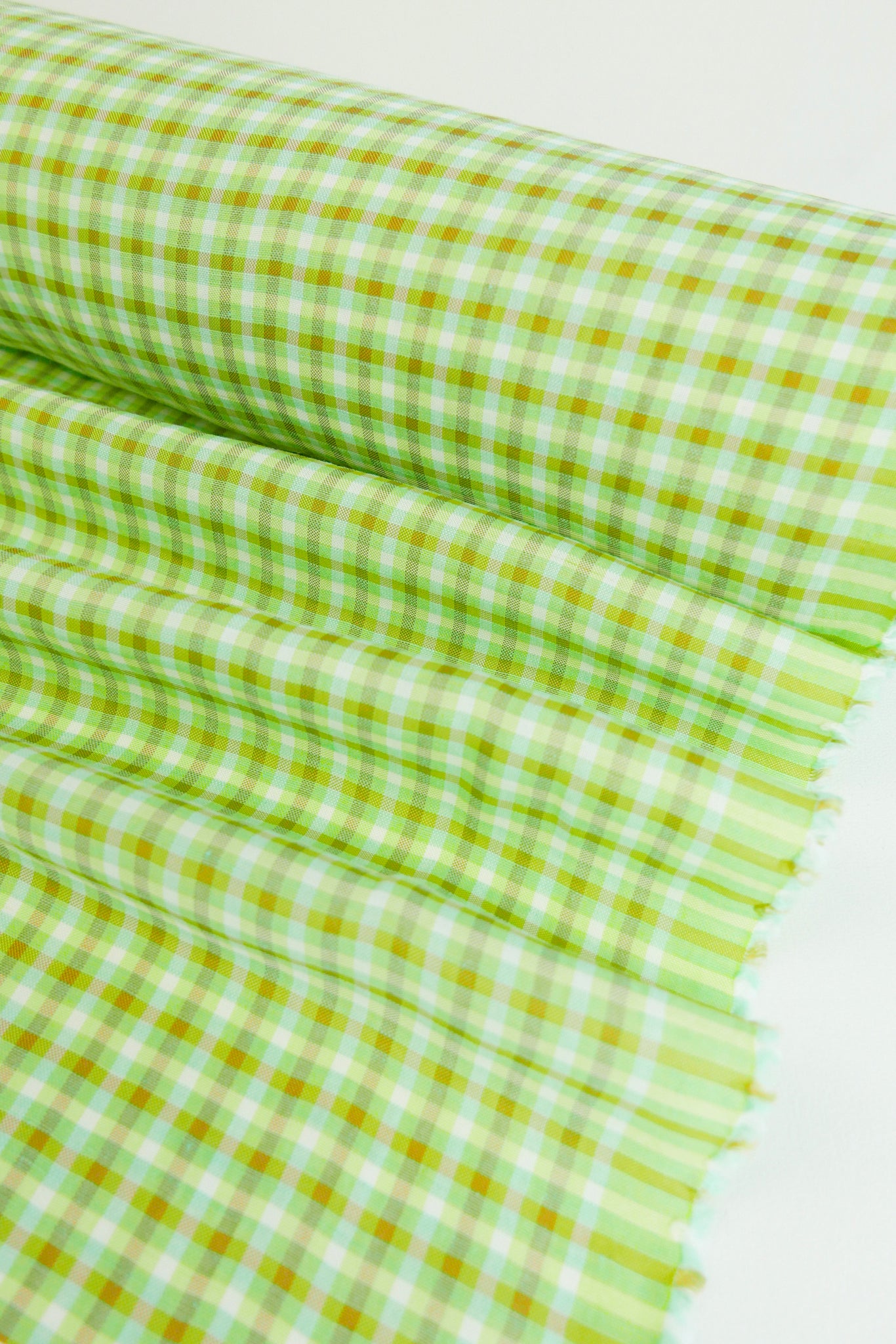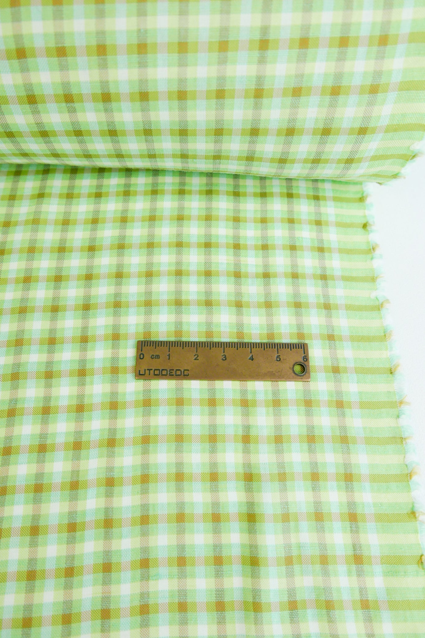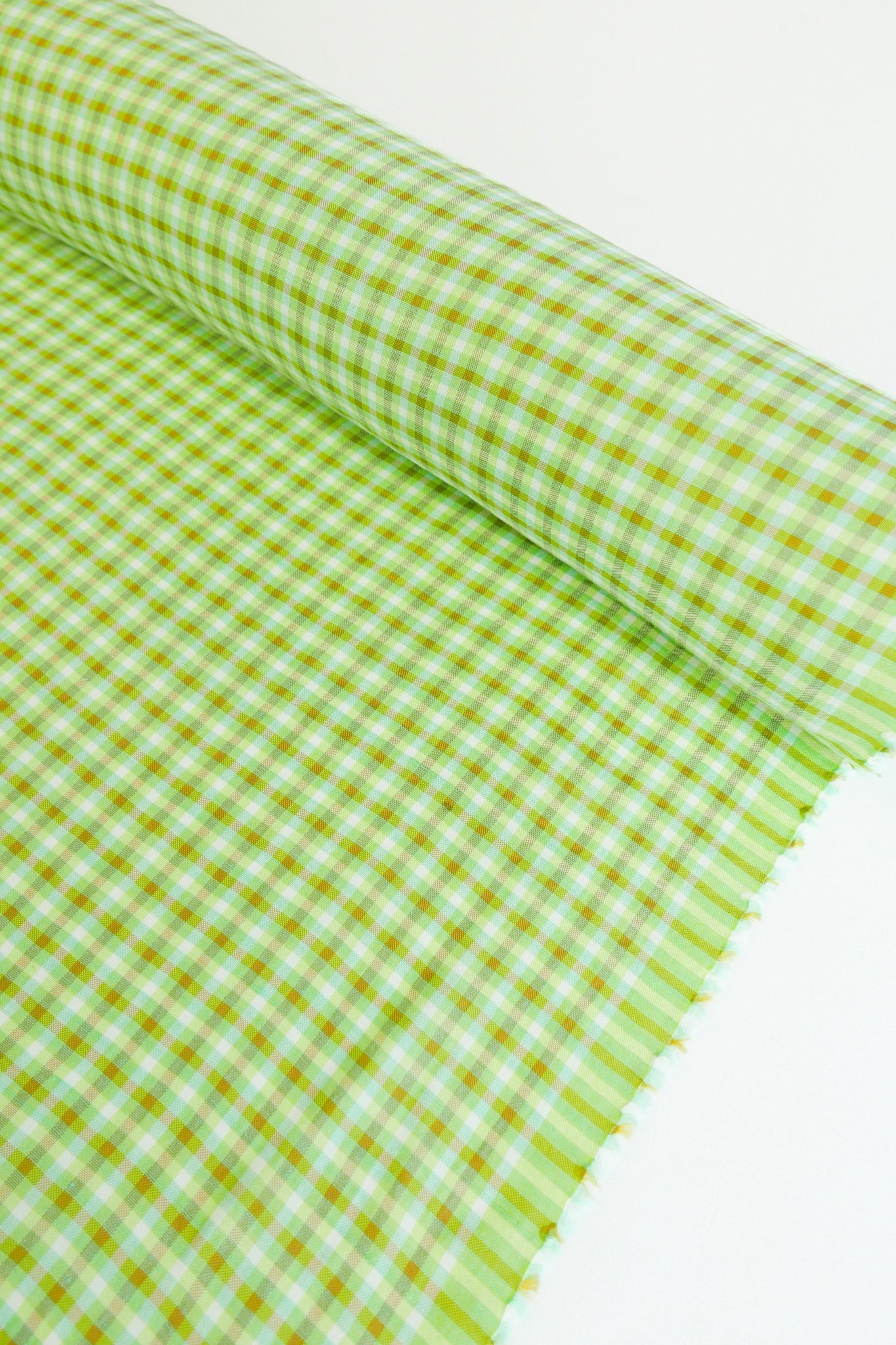 Viker is a textured European seersucker in a yarn-dyed check design in lime green, brown, orange, cream and baby blue. Made from a lightweight and breathable linen rayon blend, this fabric is perfect for year-round wear and doesn't crease as easily as pure linen. With the distinctive look only seersucker can provide, it's easy to care for as it doesn't require ironing, and makes for a versatile fabric ideal for dresses, skirts, and shirts, adding a touch of effortless style to any outfit.