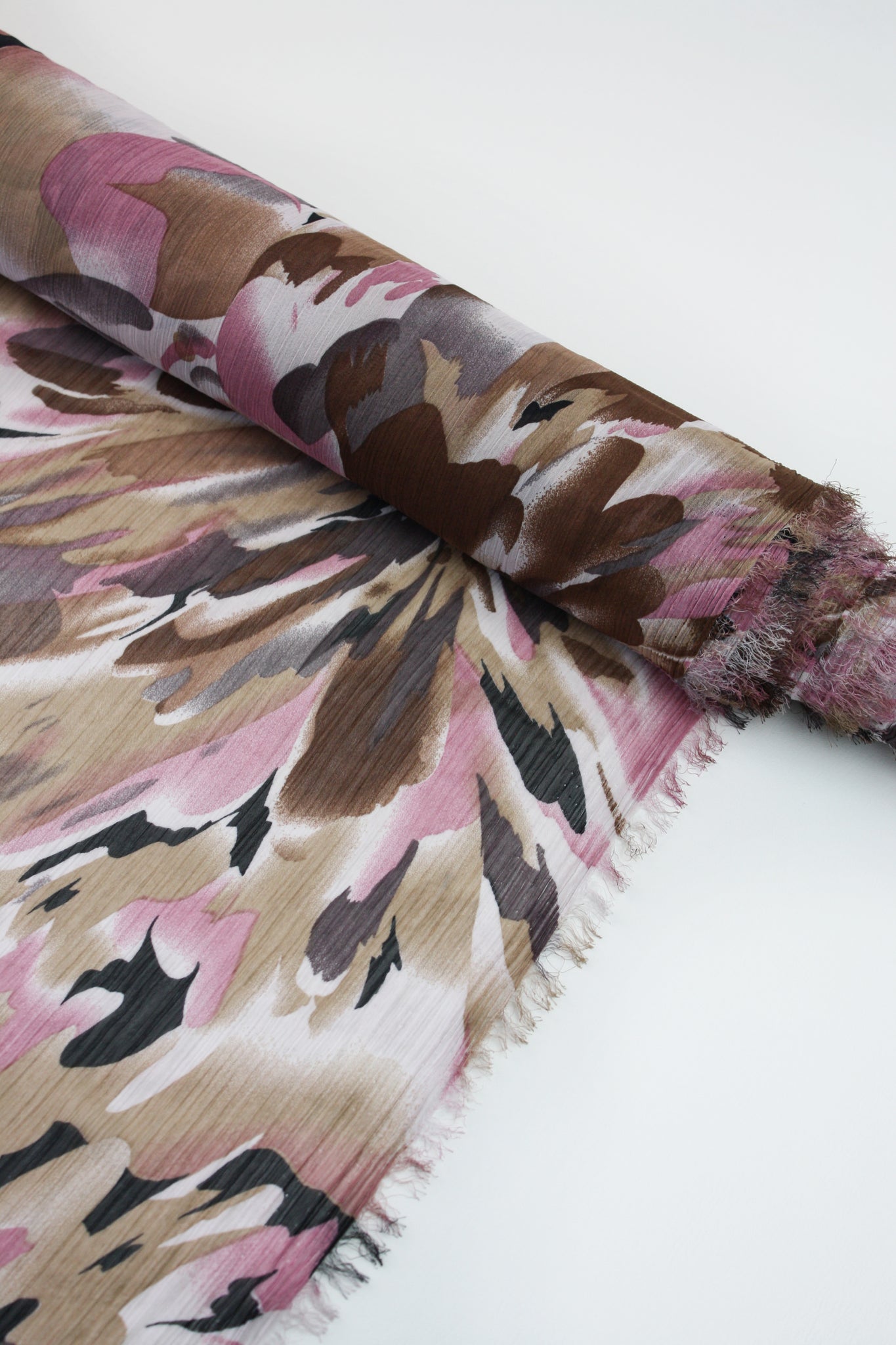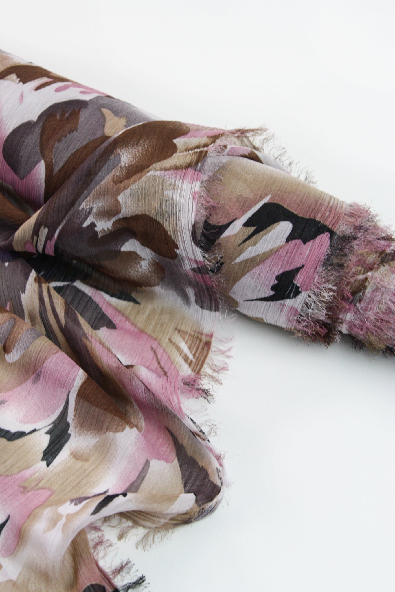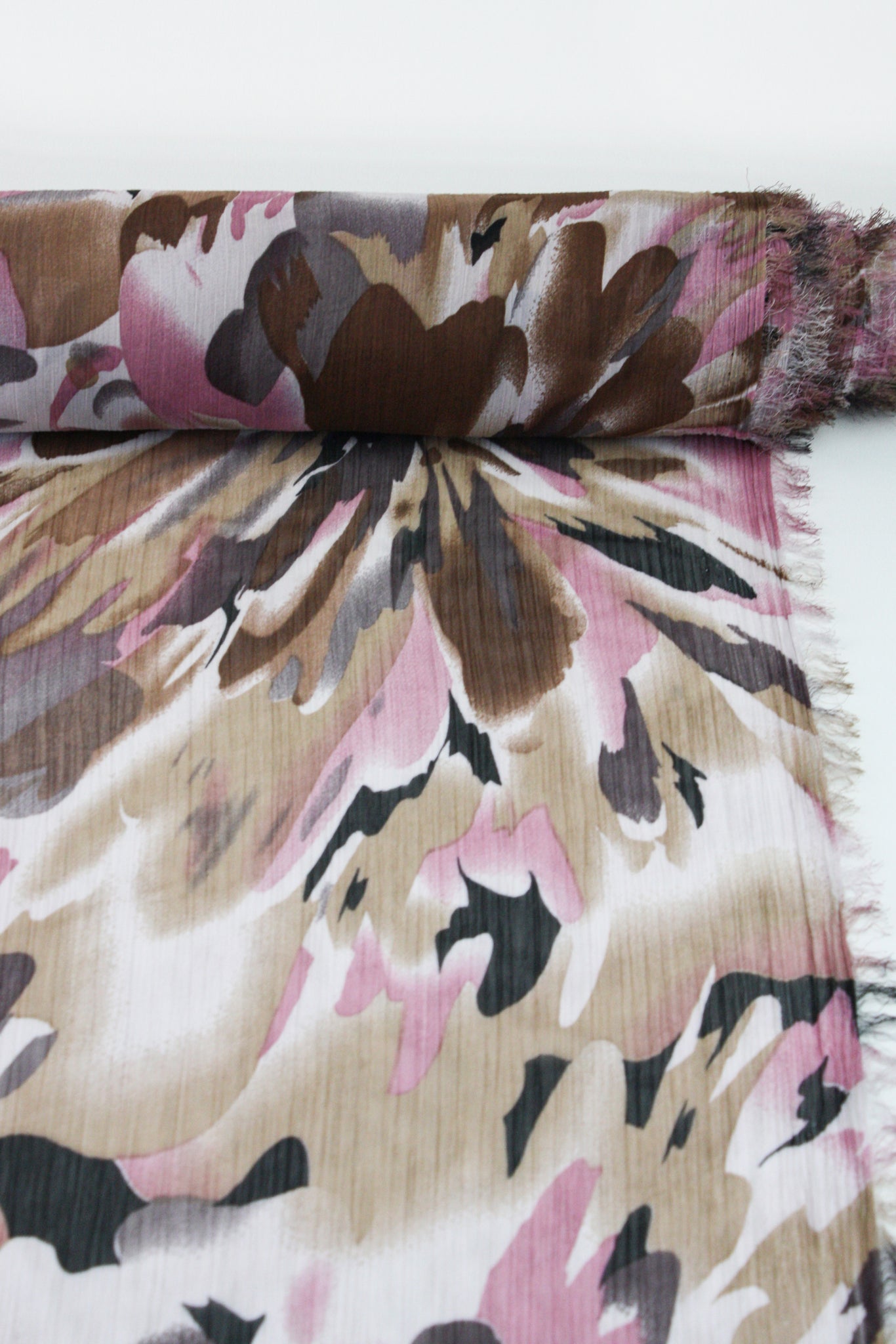 Stami is a beautifully textured printed yoryu chiffon coming in a collection of soft warm colours. Its abstract print is reminiscent of watercolour flowers, or the reflection of leaves in the water. Against an ivory base cloth is a dark brown, mid-tone brown and dusky pink. Extremely lightweight and semi-sheer, it has excellent drape, and loads of texture and is perfect for gathered blouses or lined as a dress or skirt.