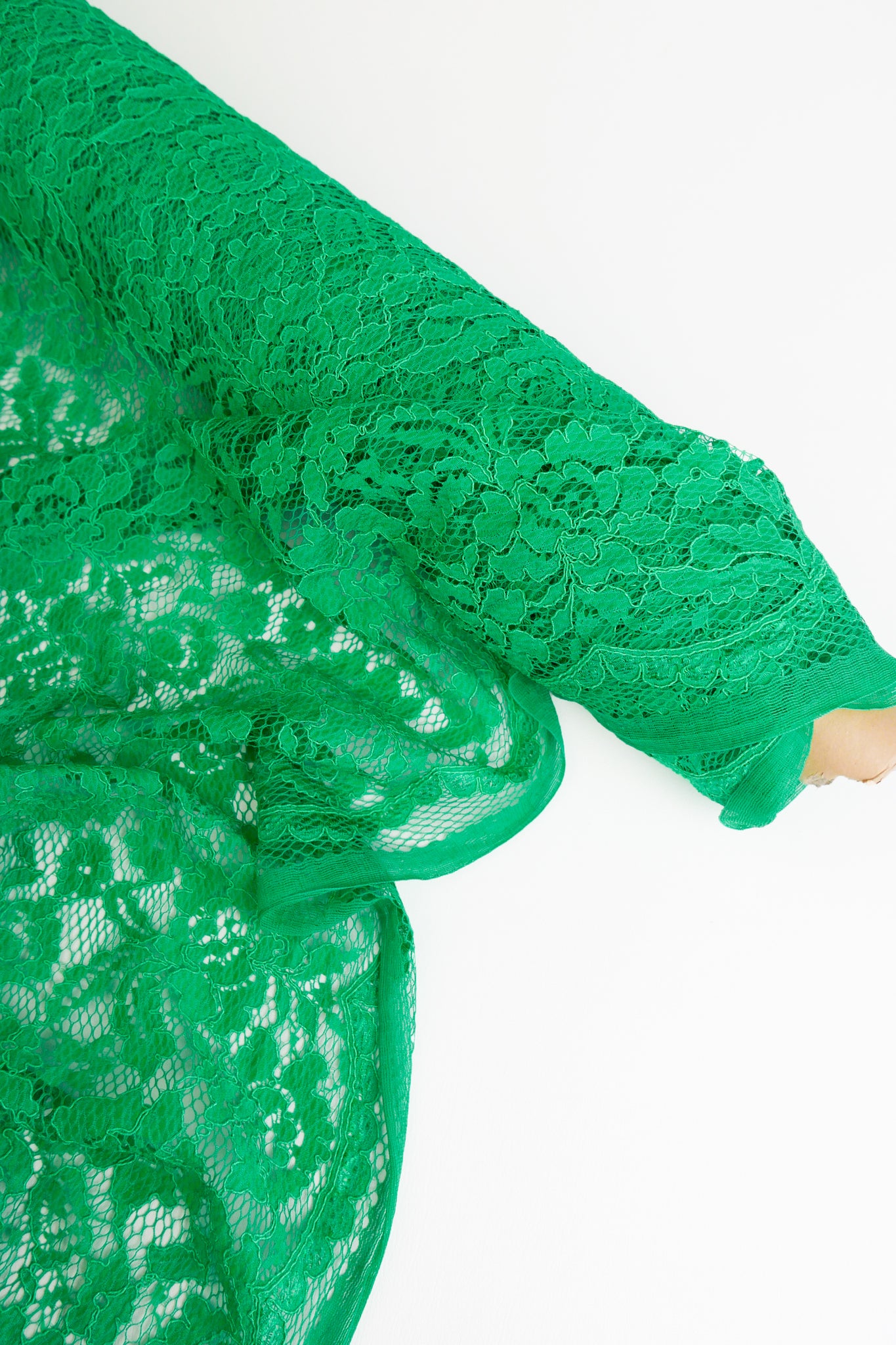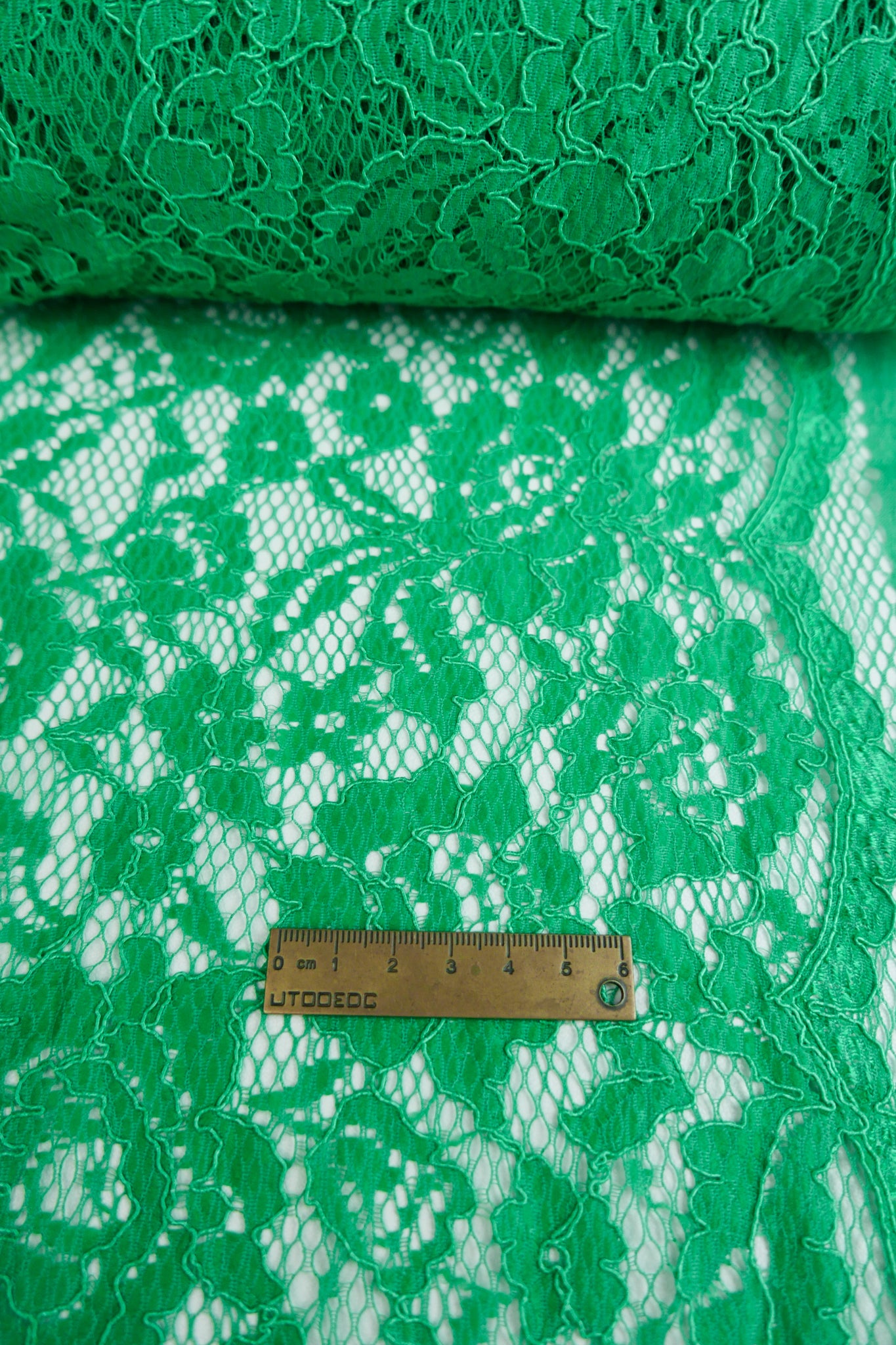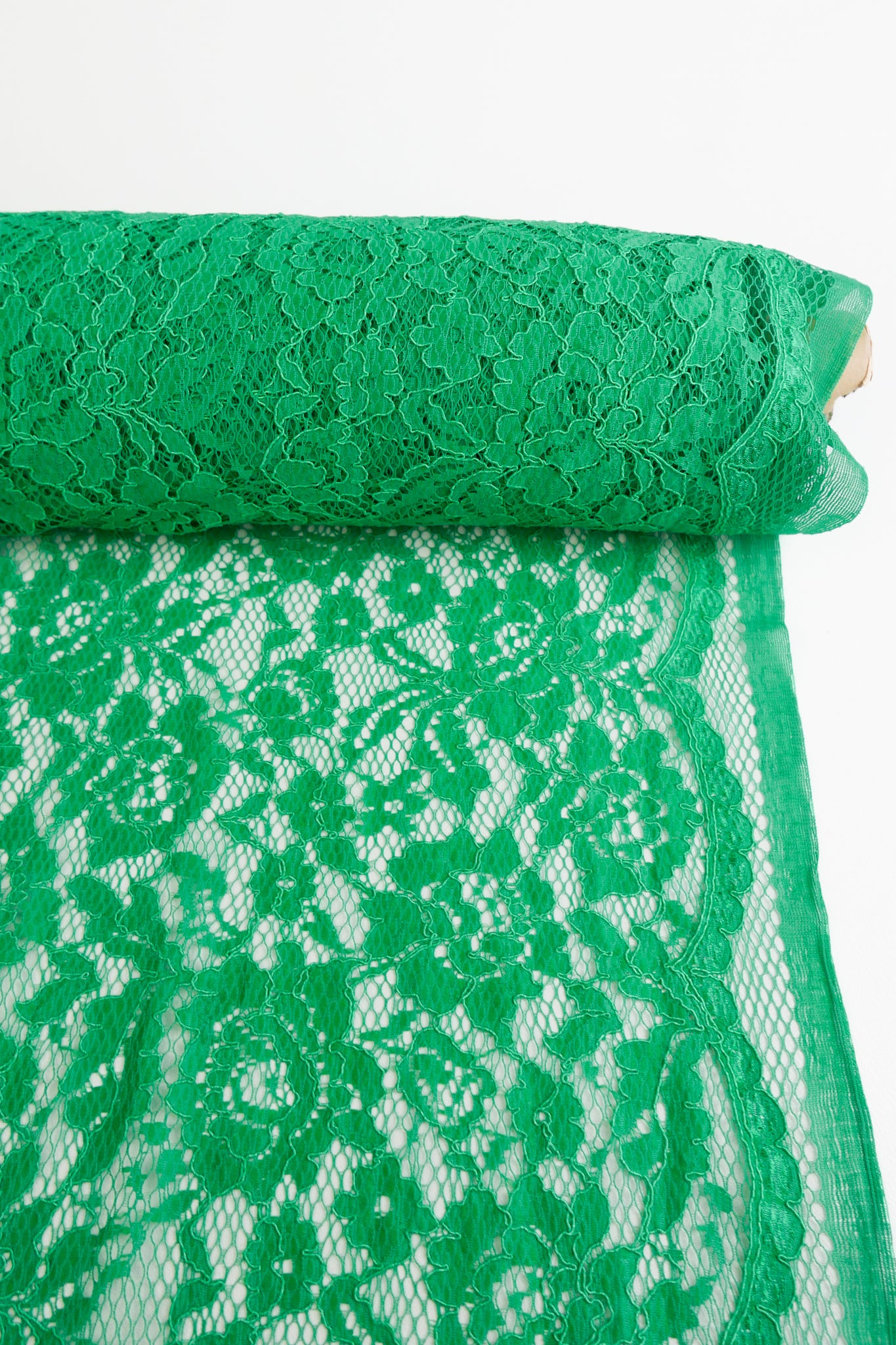 Also called "the Queen of lace", Alençon lace is known for its intricate design with a corded outline set on a netted base. Our Dita lace features a delicate floral design in an emerald colourway. Beautifully tactile, it has mechanical stretch and scalloped edging along one selvedge. Dita would make a stunning layering piece, bridal wear or even a lace slip.