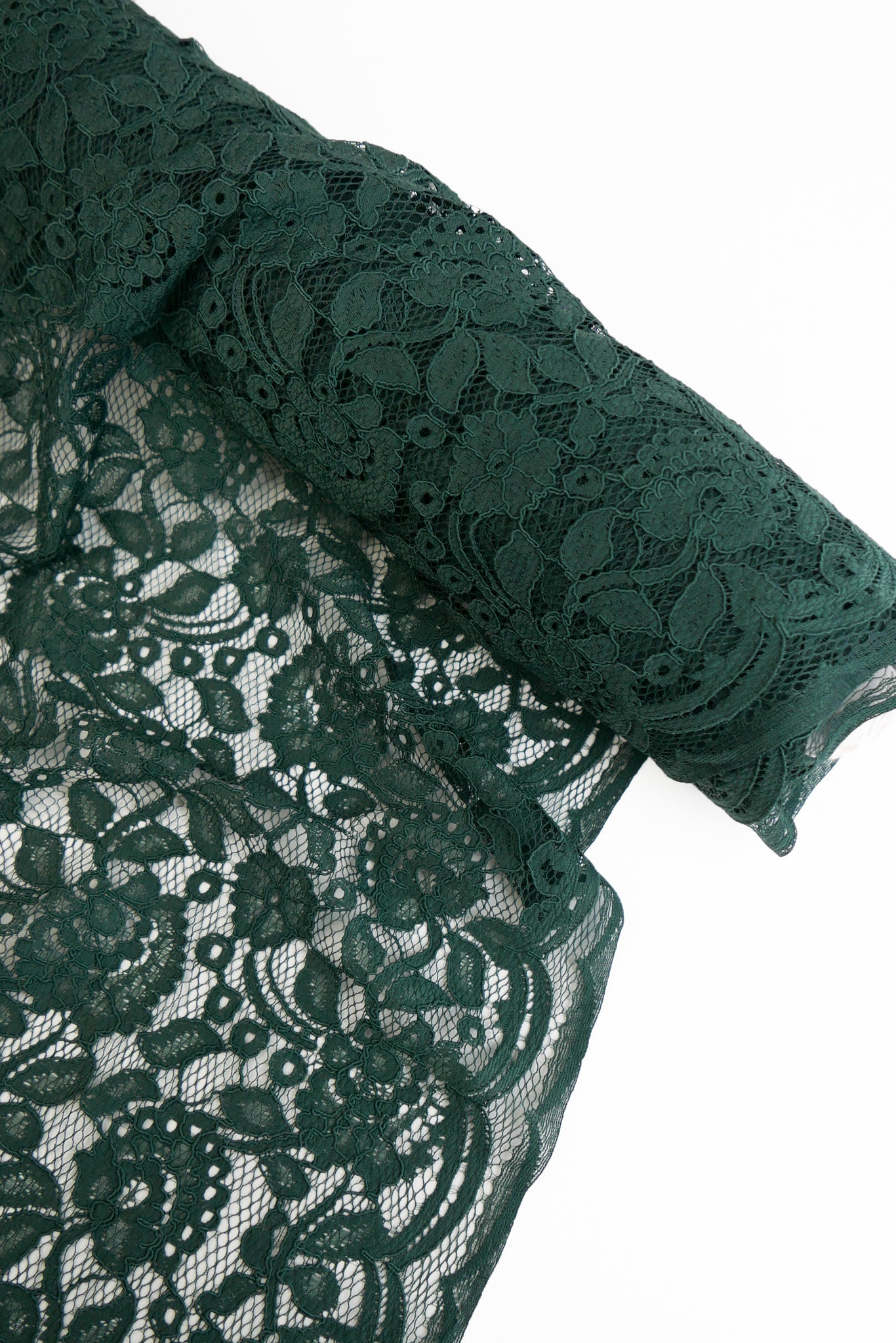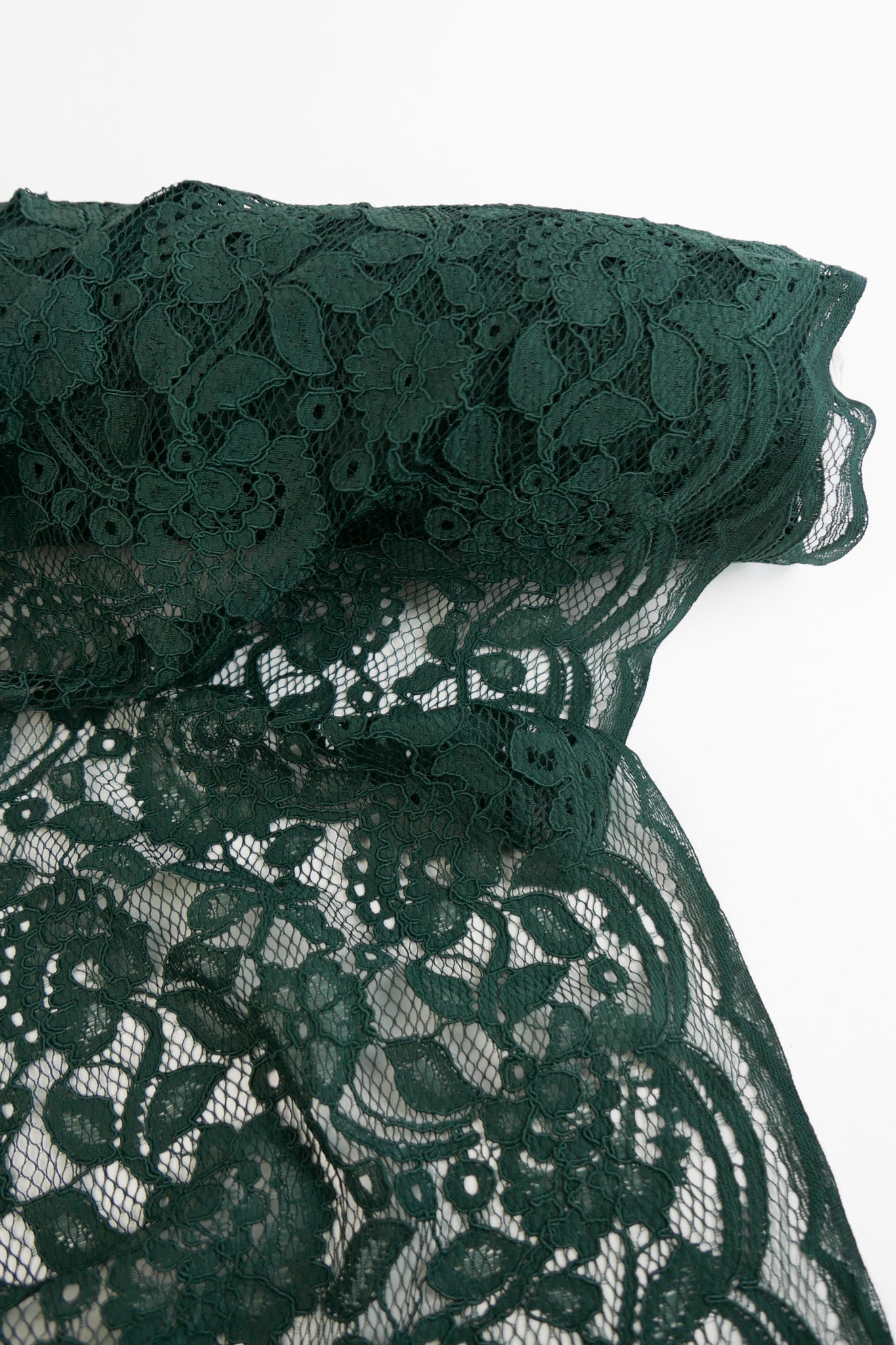 Also called "the Queen of lace", Alençon lace is known for its intricate design with a corded outline set on a netted base. Our Dita lace features a delicate floral design in a pine colourway. Beautifully tactile, it has mechanical stretch and scalloped edging along one selvedge. Dita would make a stunning layering piece, bridal wear or even a lace slip.