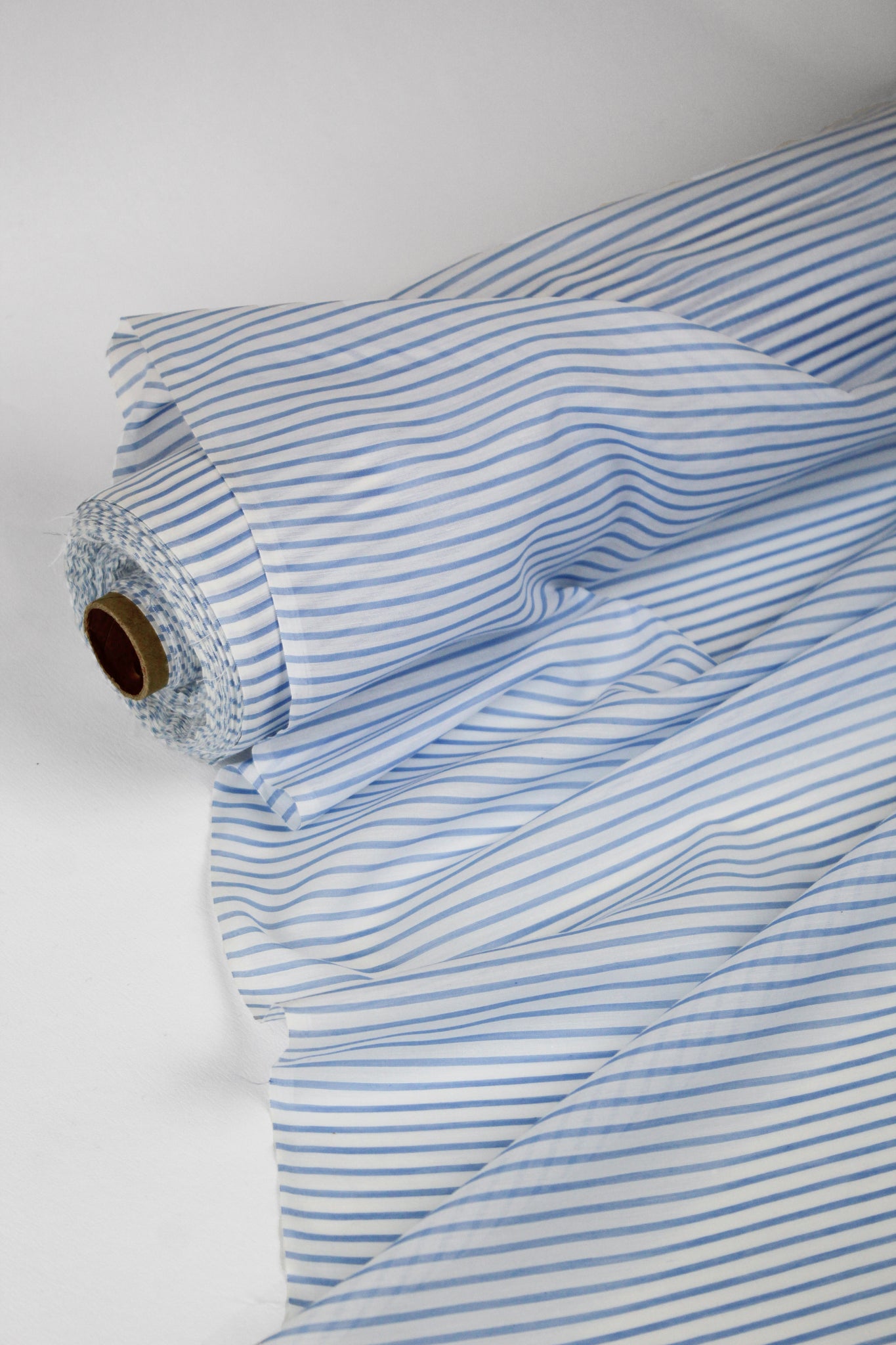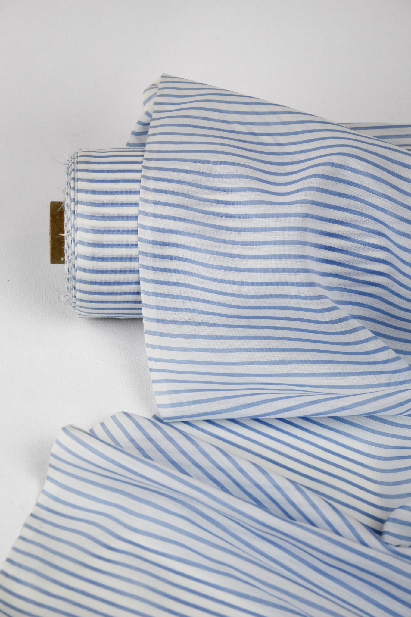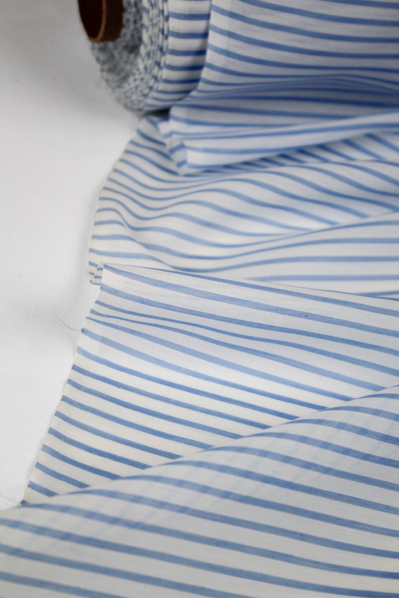 Ramiro is a delightful silk cotton with a yarn dyed stripe in sky blue and off white. It's light and airy with a gentle structure and is semi sheer. It would gather beautifully, and make a stunning blouse or lined skirt.