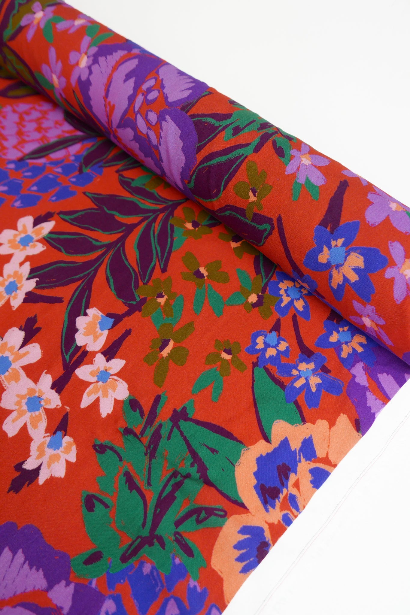 Benson is a soft, French viscose print featuring a vibrant, floral print in multiple bright colours on a rich, blood orange cloth. Lightweight and fully opaque, Benson is supremely soft, has excellent drape and is perfect for gathered blouses or lined as a dress or skirt.