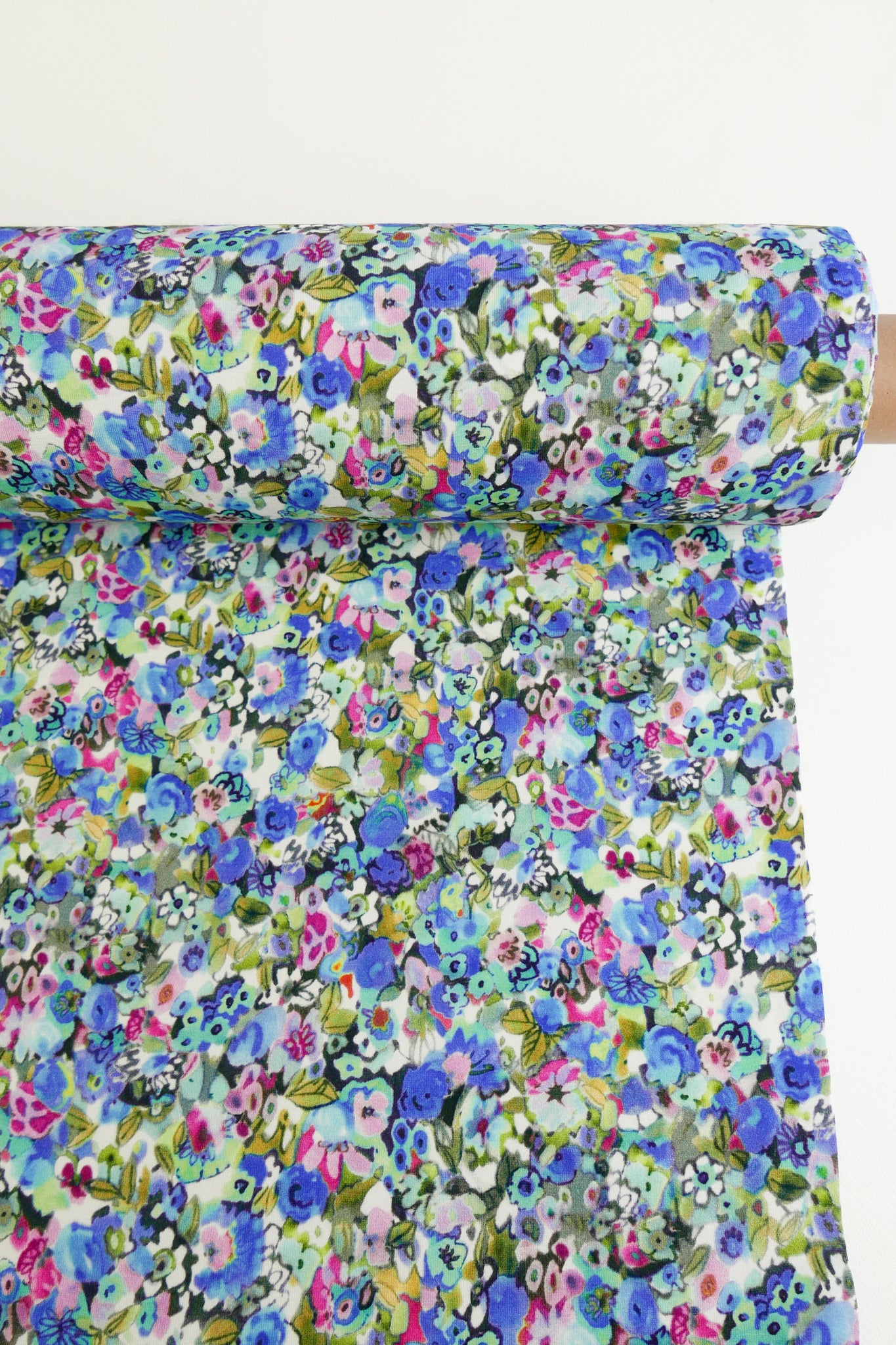 Cezanne is an extravagant printed viscose knit in a cornflower colourway. Lightweight and full of drape, it's perfect to recreate those vintage DVF pieces. It features a vibrant floral print in blue, green, magenta, and more on an off-white base cloth. Anti-pill and anti-curl, Cezanne is completely opaque with four-way stretch. It would make the perfect form-fitting dress, a colourful turtleneck layering piece, a show-stopping bias-cut piece or the cutest lounge set.