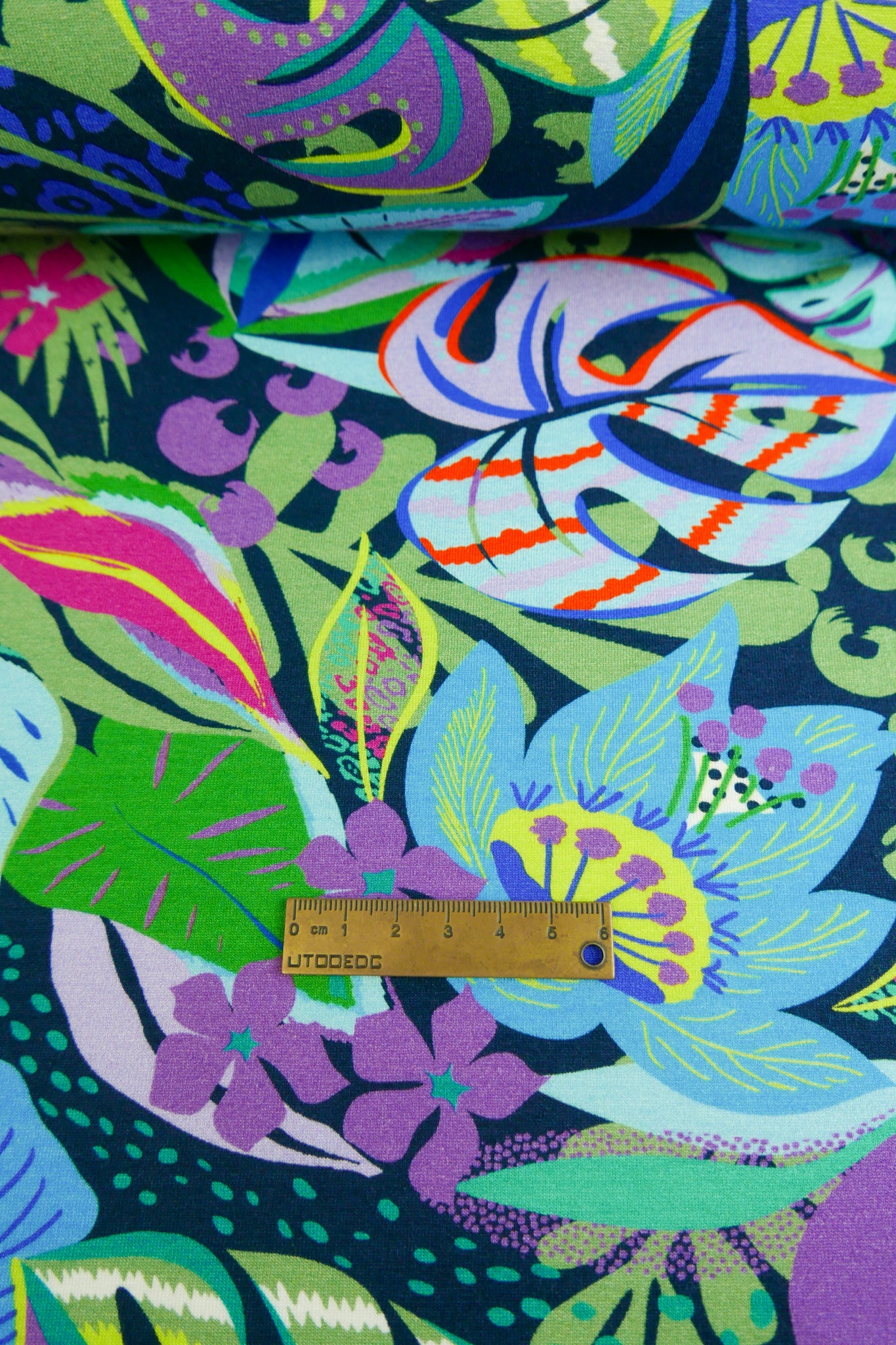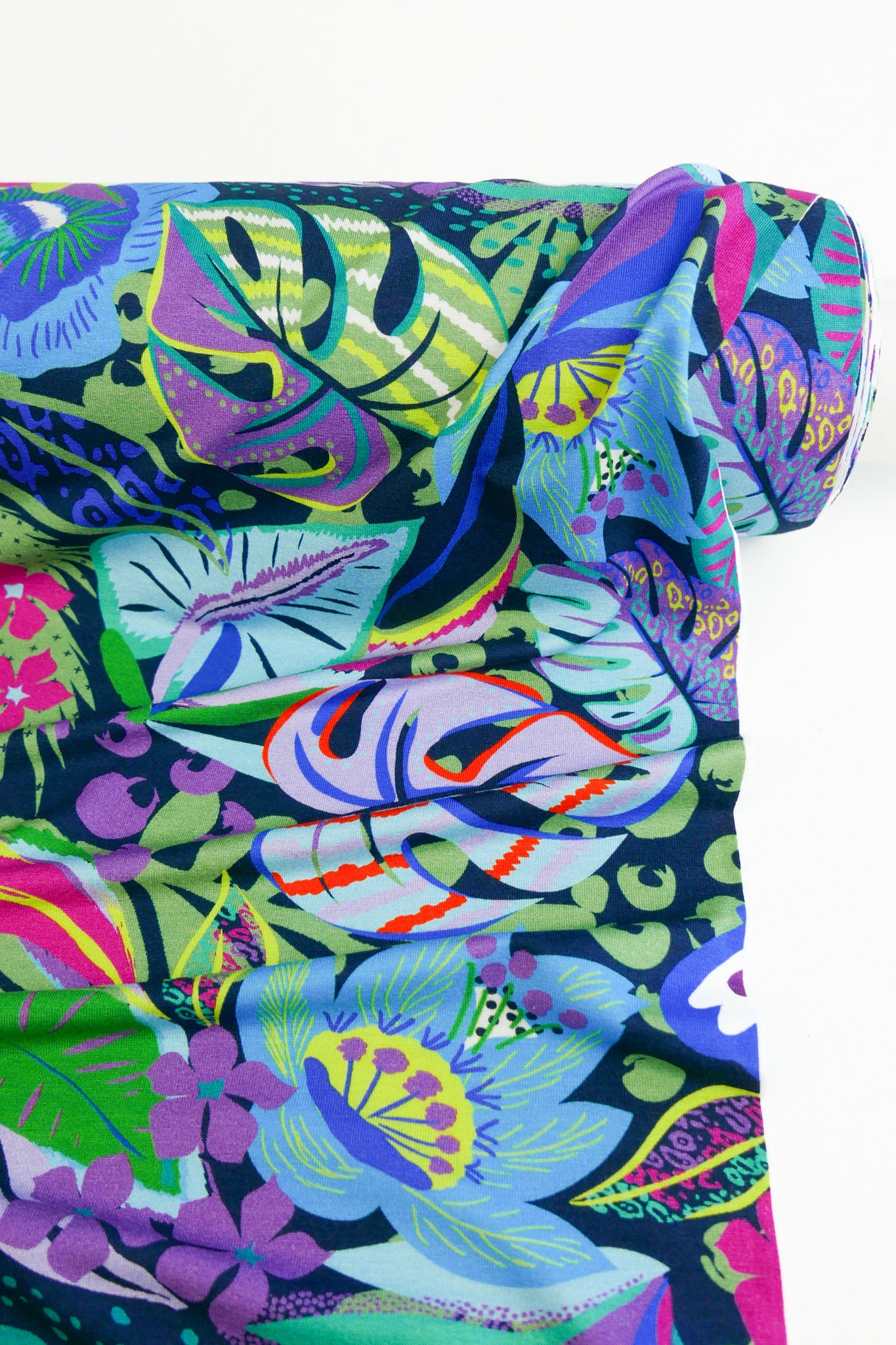 Mia is an extravagant printed viscose knit in a midnight colourway. Lightweight and full of drape, it's perfect to recreate those vintage DVF pieces. It features a vibrant print in green, magenta, violet, and more on a midnight blue base cloth. Anti-pill and anti-curl, Mia is completely opaque with four-way stretch. It would make the perfect form-fitting dress, a colourful turtleneck layering piece, a show-stopping bias-cut piece or the cutest lounge set.