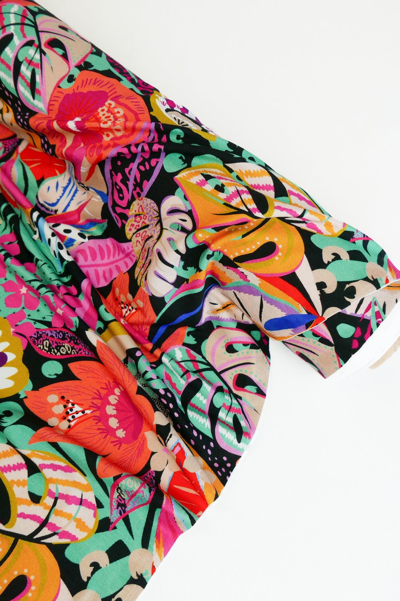 Mia is an extravagant printed viscose knit in an onyx colourway. Lightweight and full of drape, it's perfect to recreate those vintage DVF pieces. It features a vibrant print in pink, magenta, yellow, orange, green and more on a black base cloth. Anti-pill and anti-curl, Mia is completely opaque with four-way stretch. It would make the perfect form-fitting dress, a colourful turtleneck layering piece, a show-stopping bias-cut piece or the cutest lounge set.