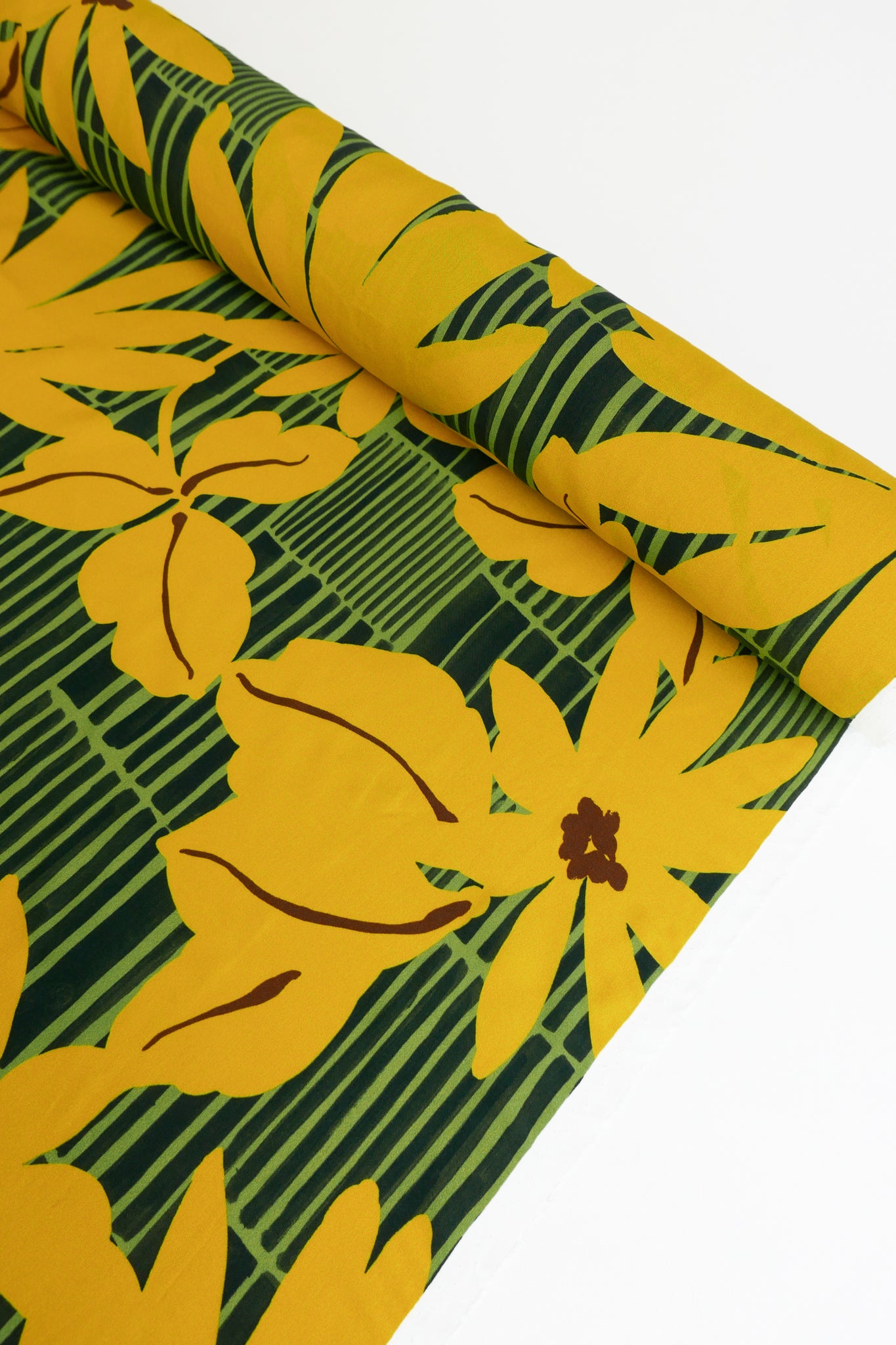 Petunia is a soft, European viscose print featuring a vibrant, large floral print in a cheerful yellow on a green and black cloth. Lightweight and fully opaque, Petunia is supremely soft, has excellent drape and is perfect for gathered blouses or lined as a dress or skirt.