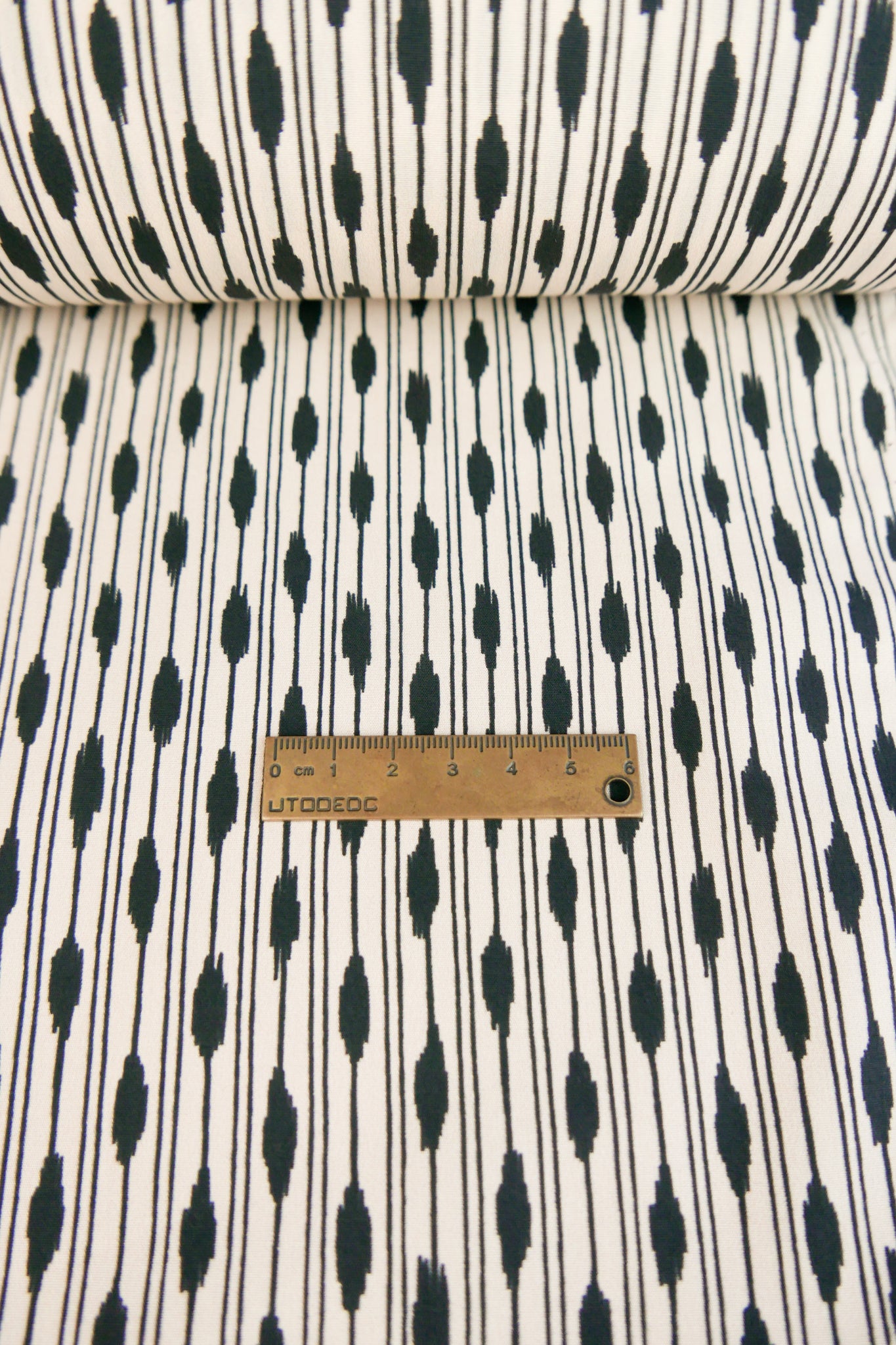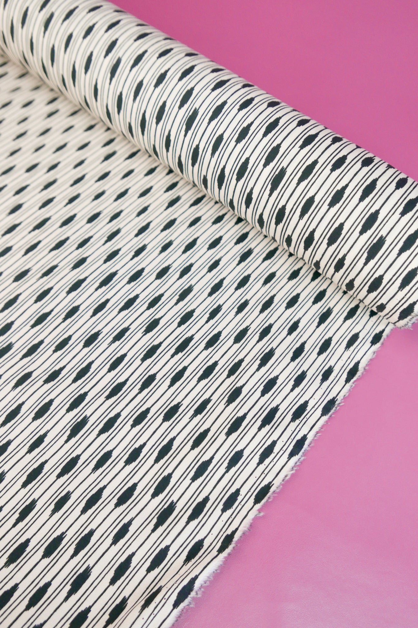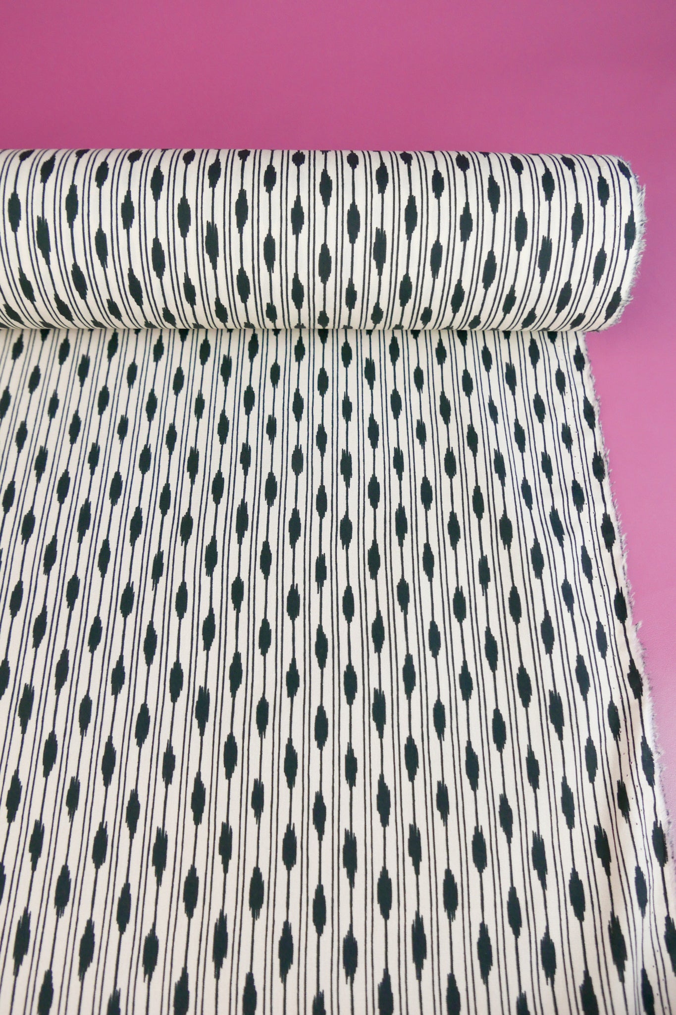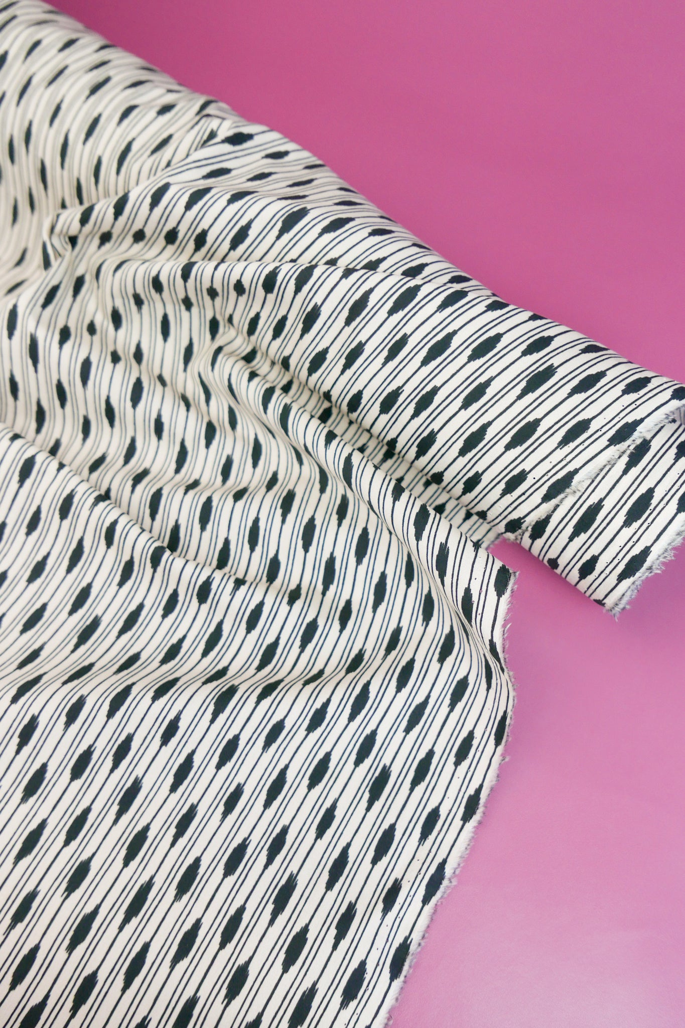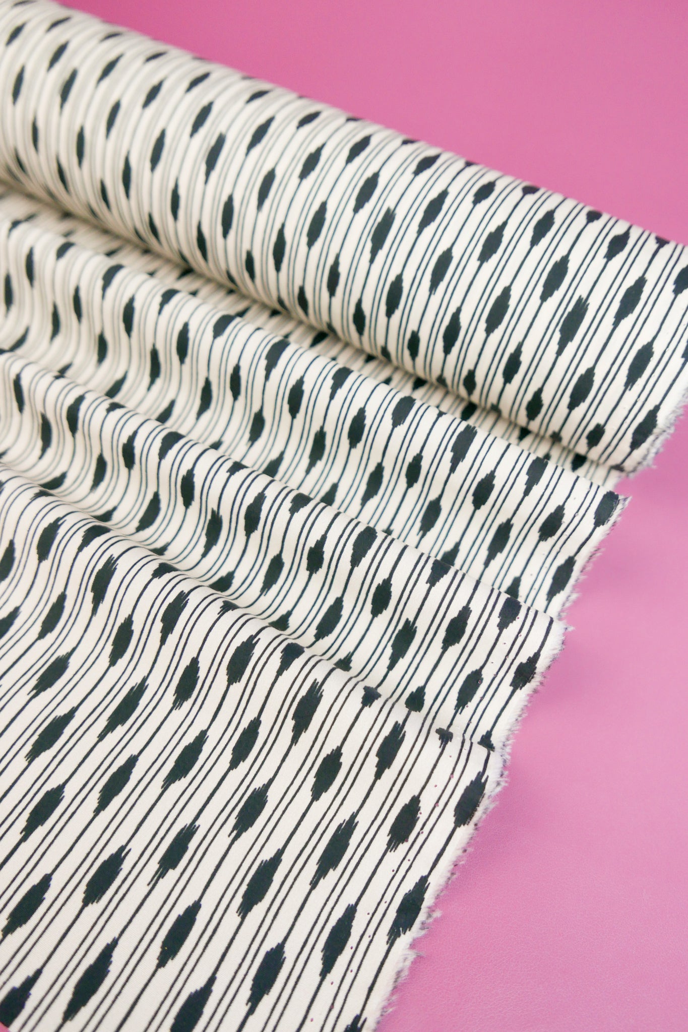 Batik is a crisp printed cotton from Lyon, France, featuring a geometric stripe design in black on an ecru cloth. It's crisp, structured and the ideal shirting weight cotton for summer garments. Completely opaque, Batik would make up well as a shirt, skirt, trousers, dress and even striking bed wear.