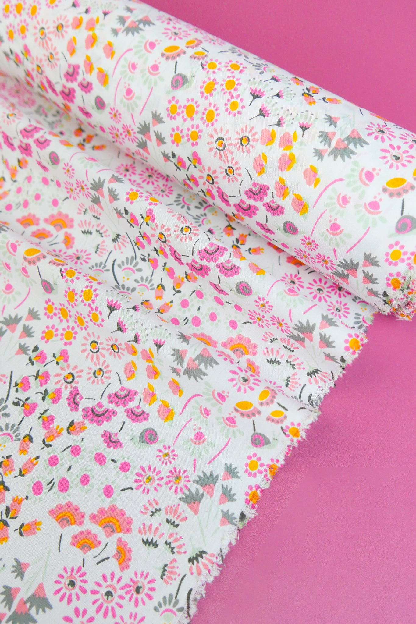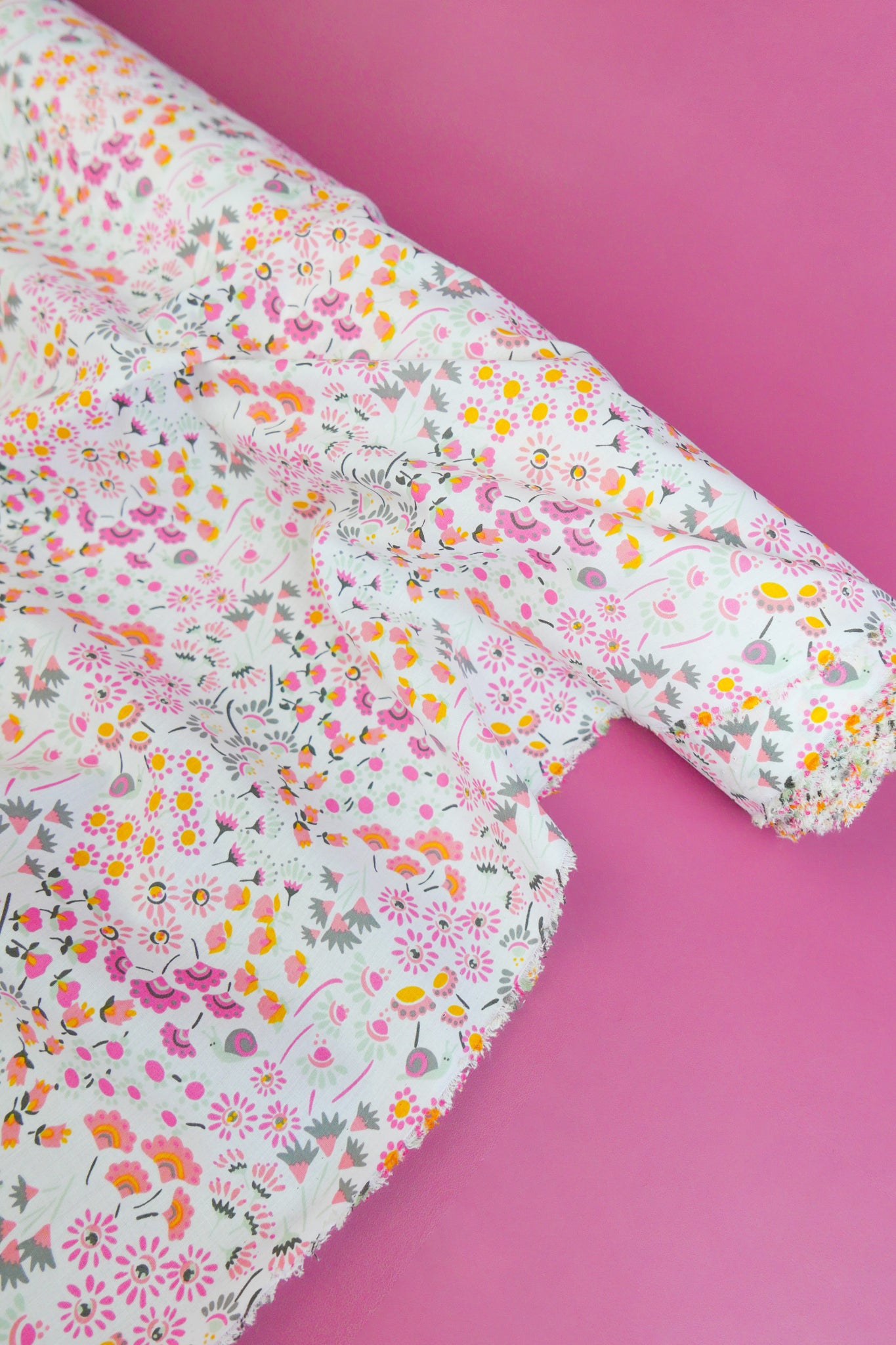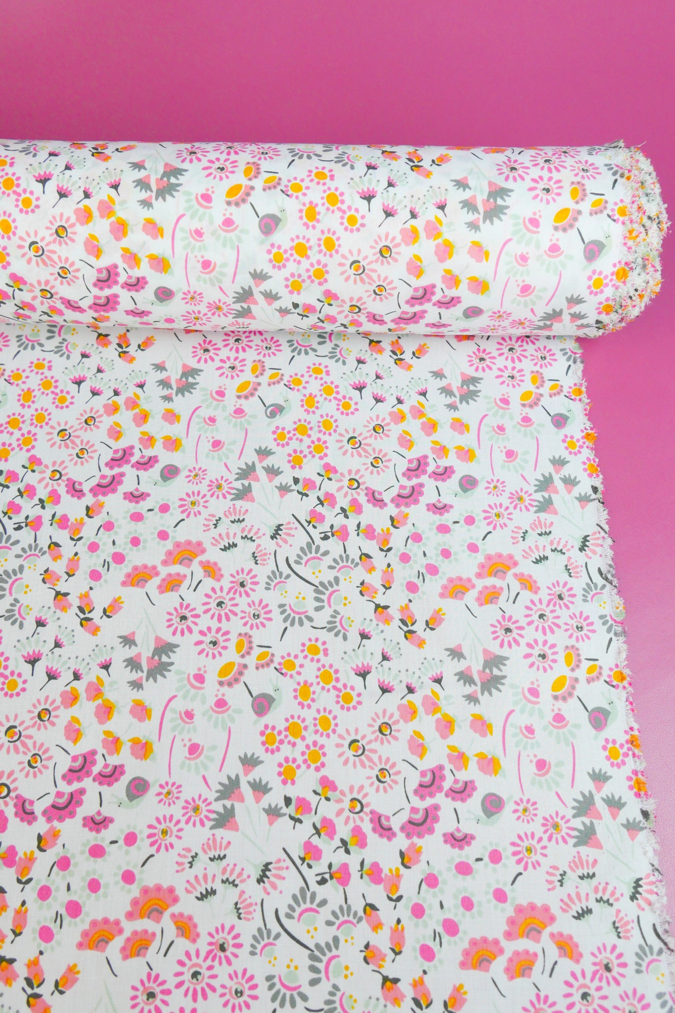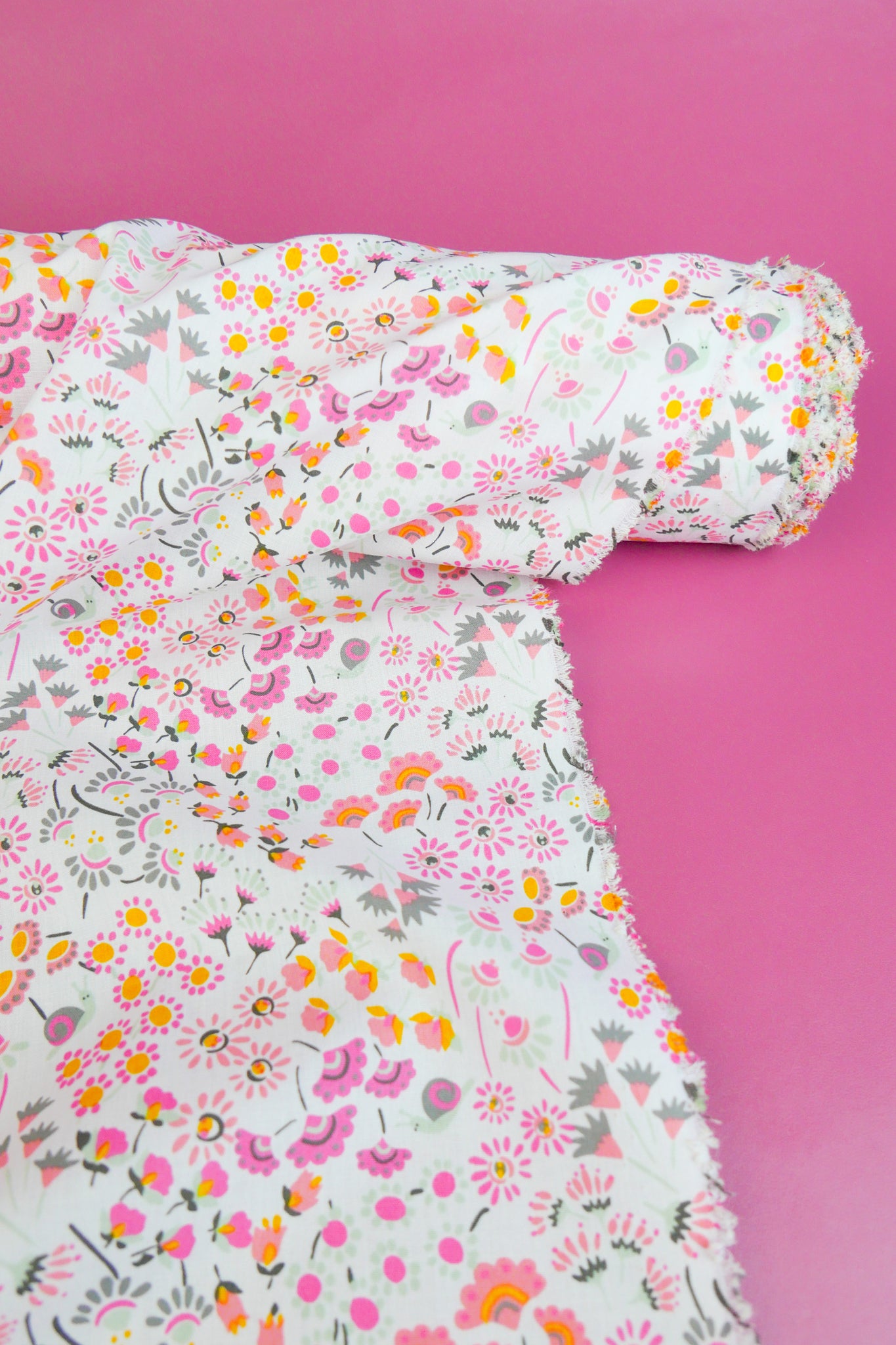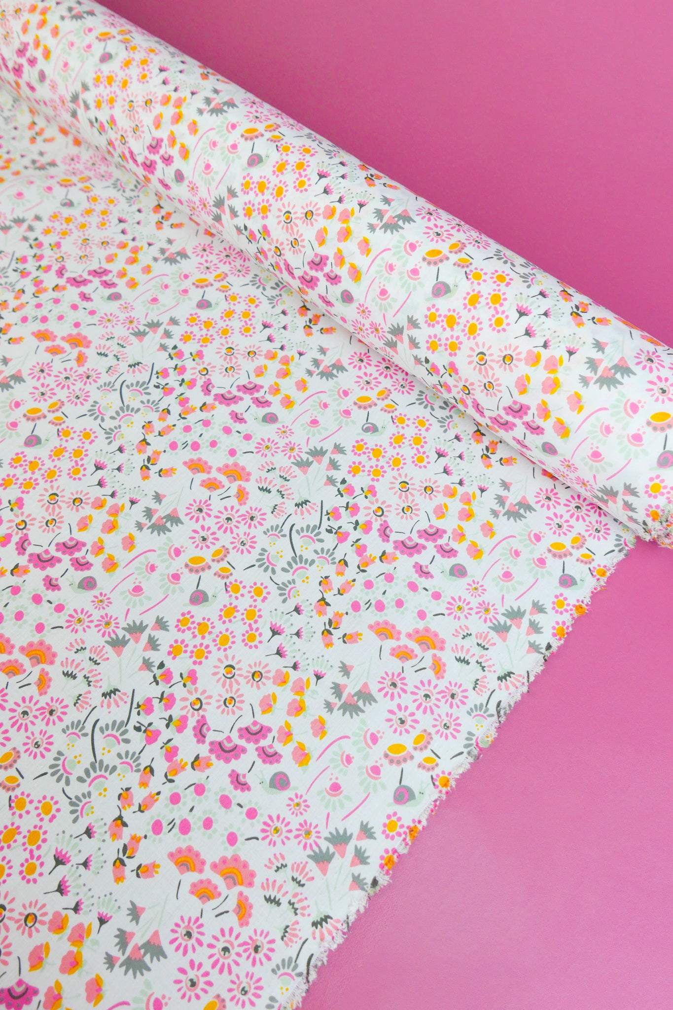 Spring is a crisp printed cotton featuring a fun floral design in shades of pink, orange, soft green and charcoal on an off-white cloth. It's crisp, structured and the ideal shirting weight cotton for summer garments. Mostly opaque, Spring would make up well as a shirt, skirt, trousers, dress and even striking bed wear.