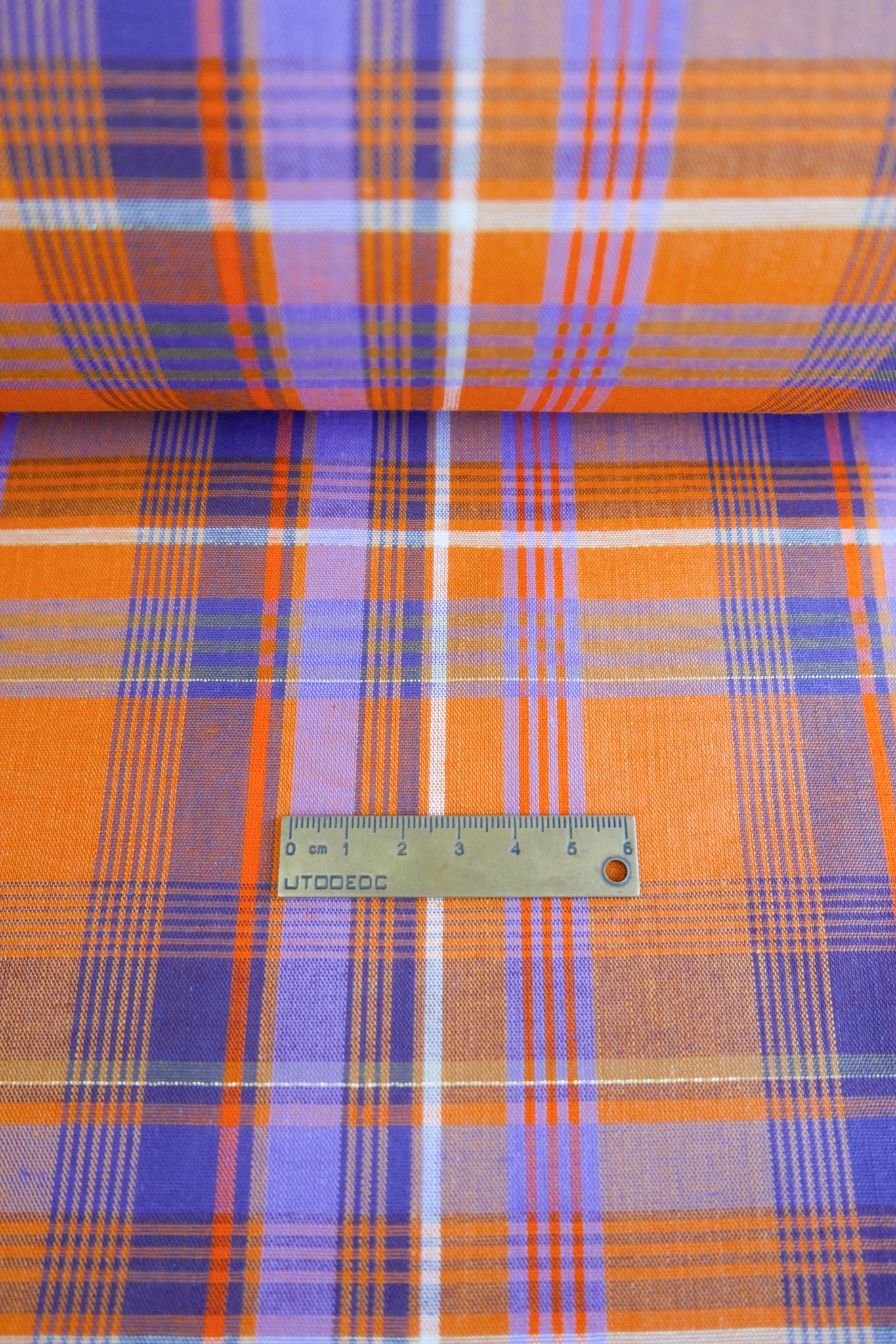 Madras is a zesty yarn-dyed linen with a vibrant check design in tangerine, lavender, aubergine and off-white with glittering lurex throughout. Madras Check is special as it is yarn dyed, which means the yarn is coloured before being woven rather than top dyed. This gives it a true colour which fades a lot less over time and ensures deeper, richer colours. Lovely and midweight, it's completely opaque and holds plenty of structure. Madras Check would make a perfect skirt, dress or shirt.