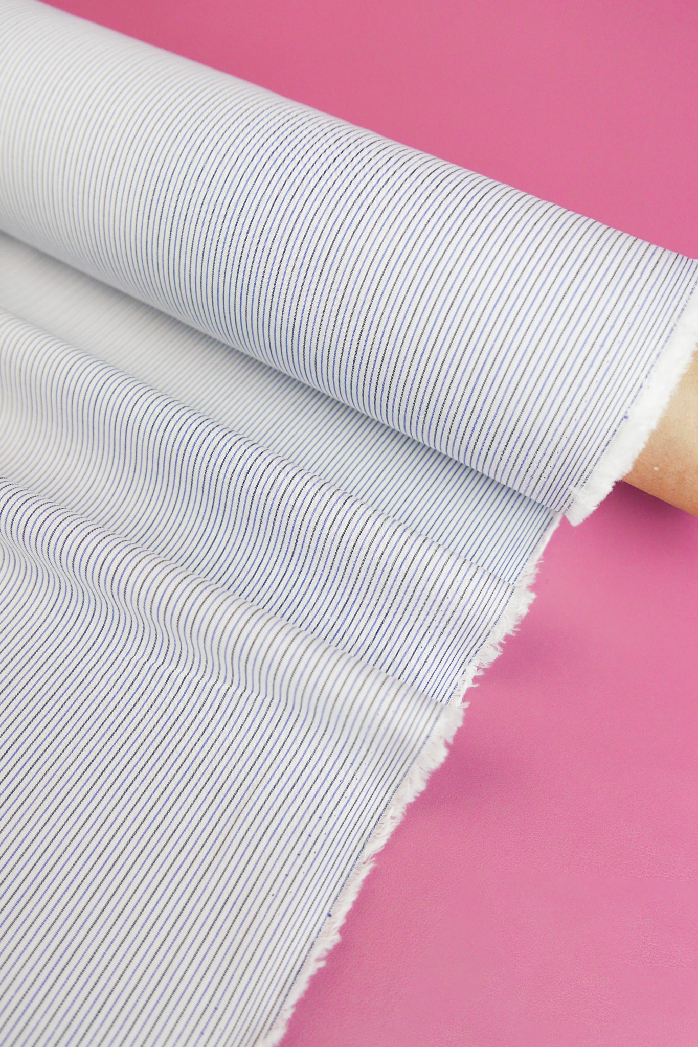 Aidan is a pure cotton shirting coming in a classic yarn-dyed stripe design in sky blue and black on an off-white cloth. Lightweight and completely opaque, Aidan holds good structure, and will make into beautiful silhouettes with gathers, puffs and volume. This yarn-dyed cotton would make a beautiful shirt, summer-weight pant, skirt or dress.