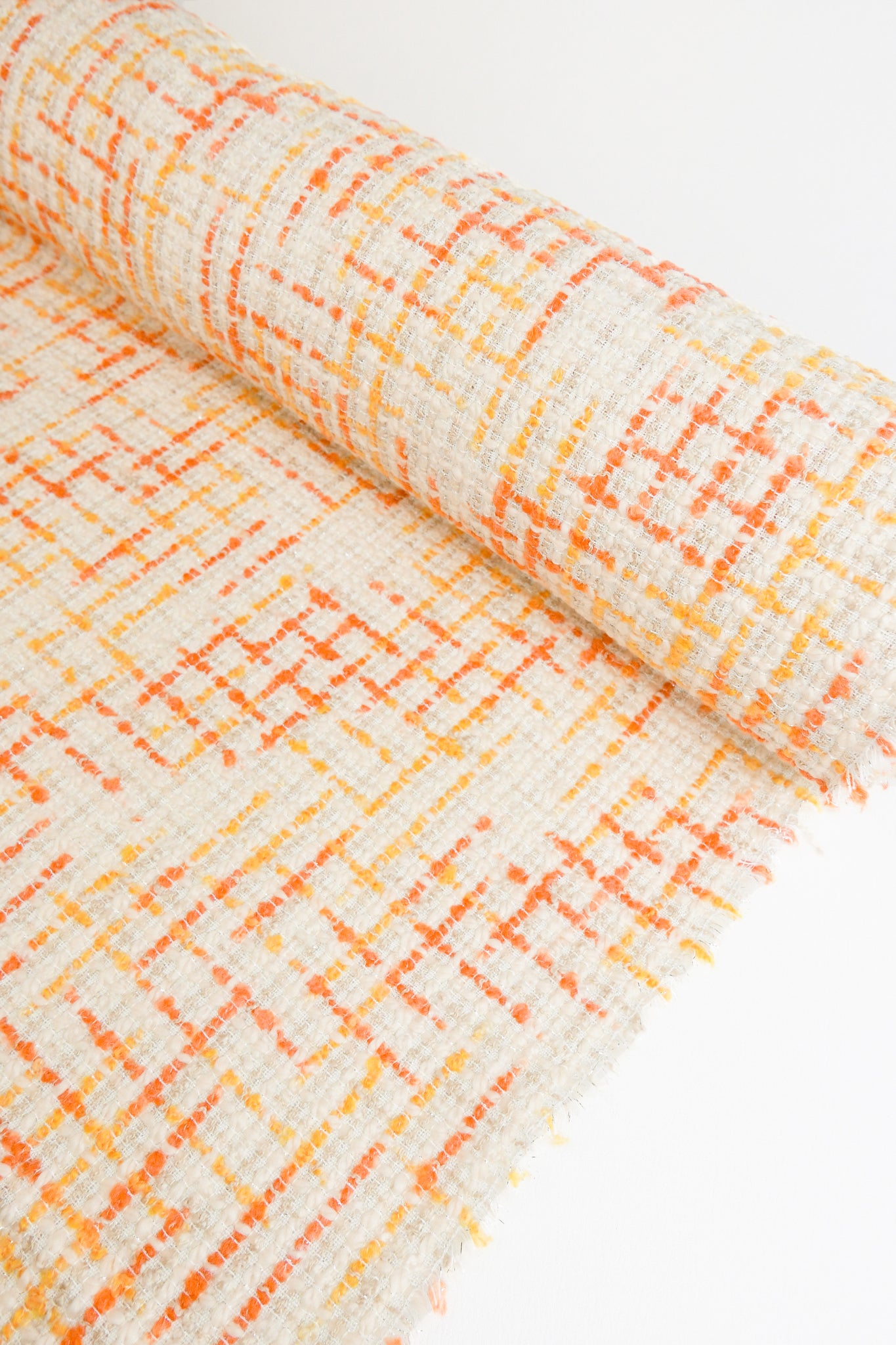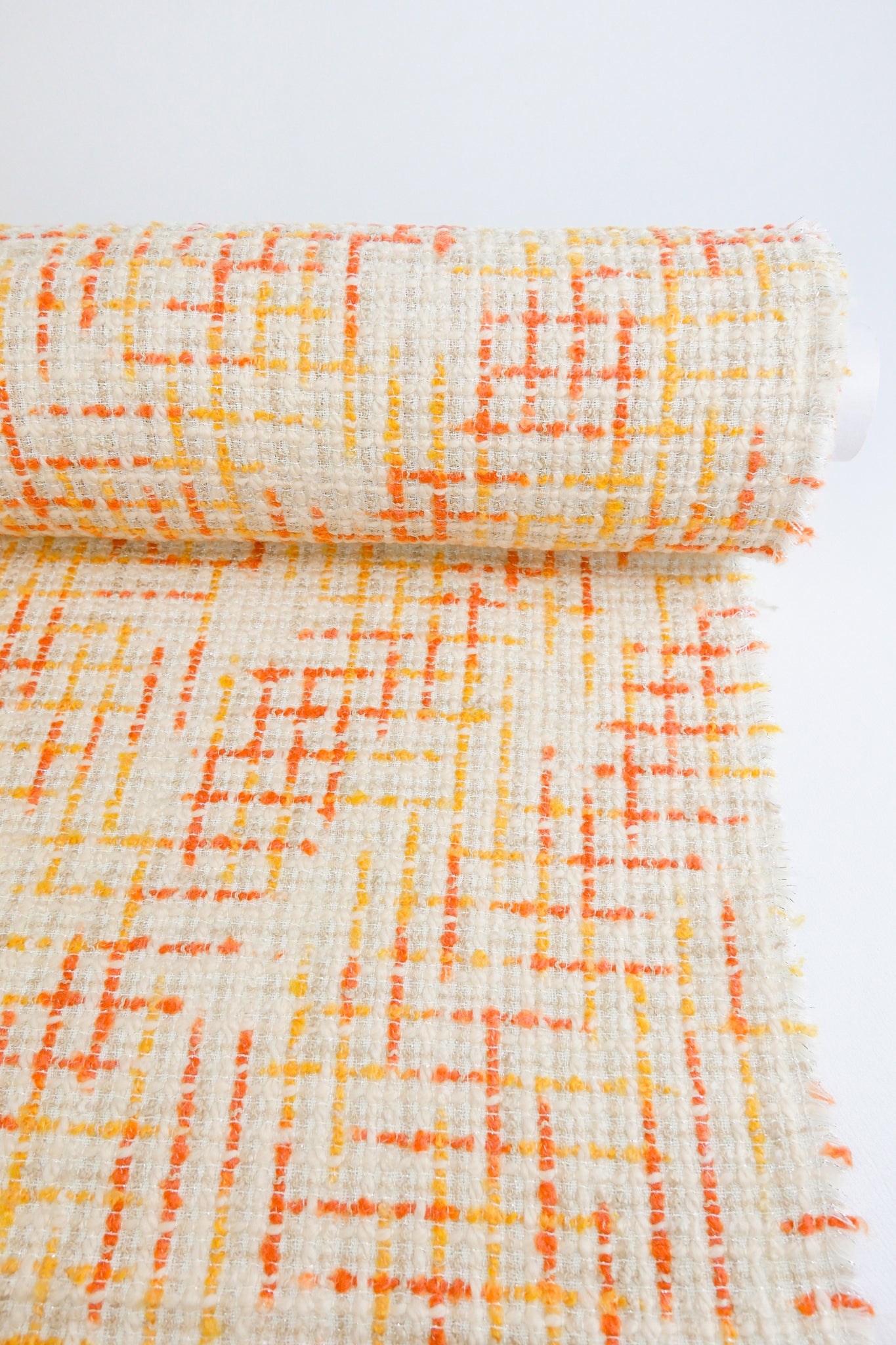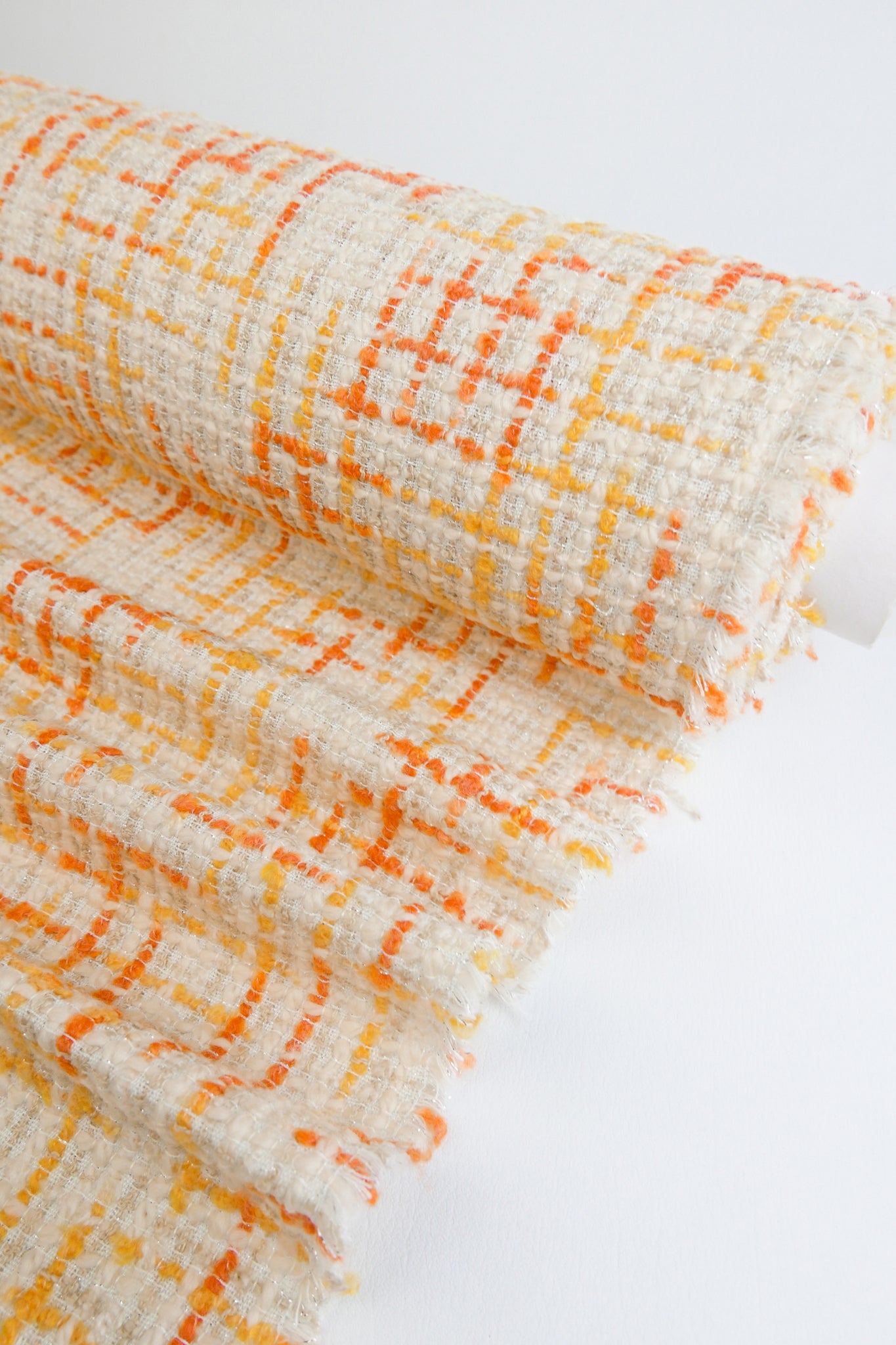 An exceptional fabric, wool tweeds like this are hard to come by. Diana is a timeless bouclé with a beautifully tactile handfeel, woven from a mix of yarns in tangerine, yellow, pearl, and off-white with silver lurex throughout, making it truly unique. Heavyweight and holding good structure, Diana would make into long-wearing jackets, coats, dresses, skirts and trousers.