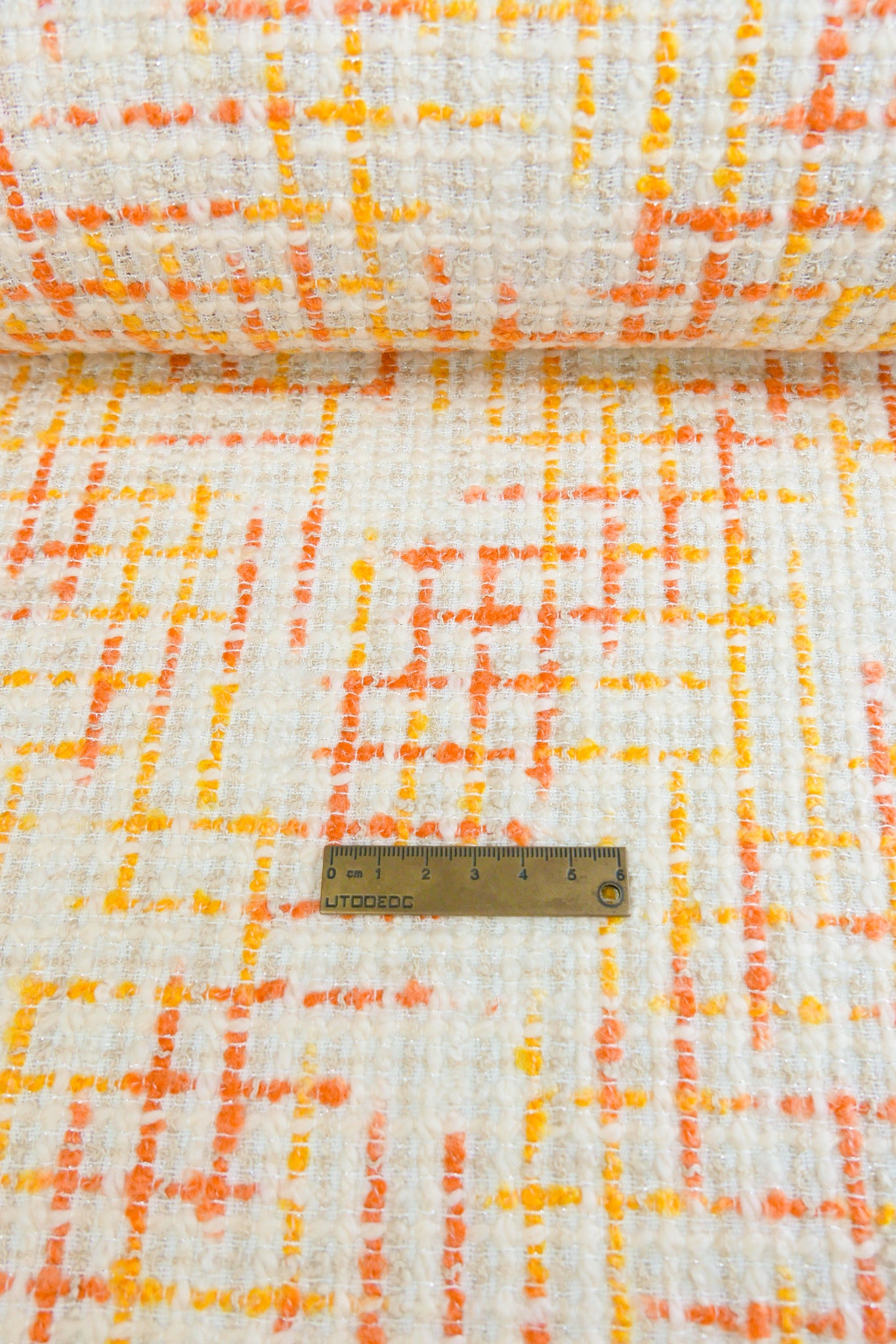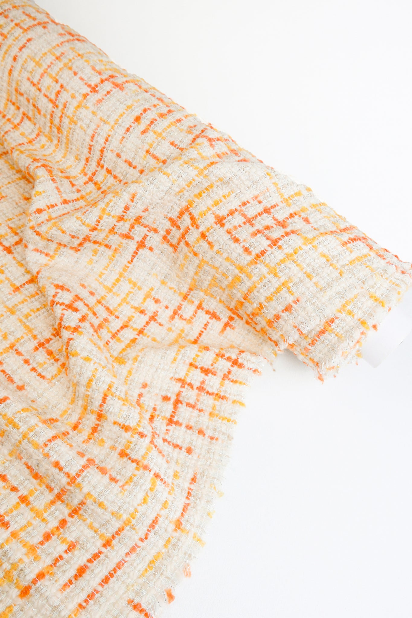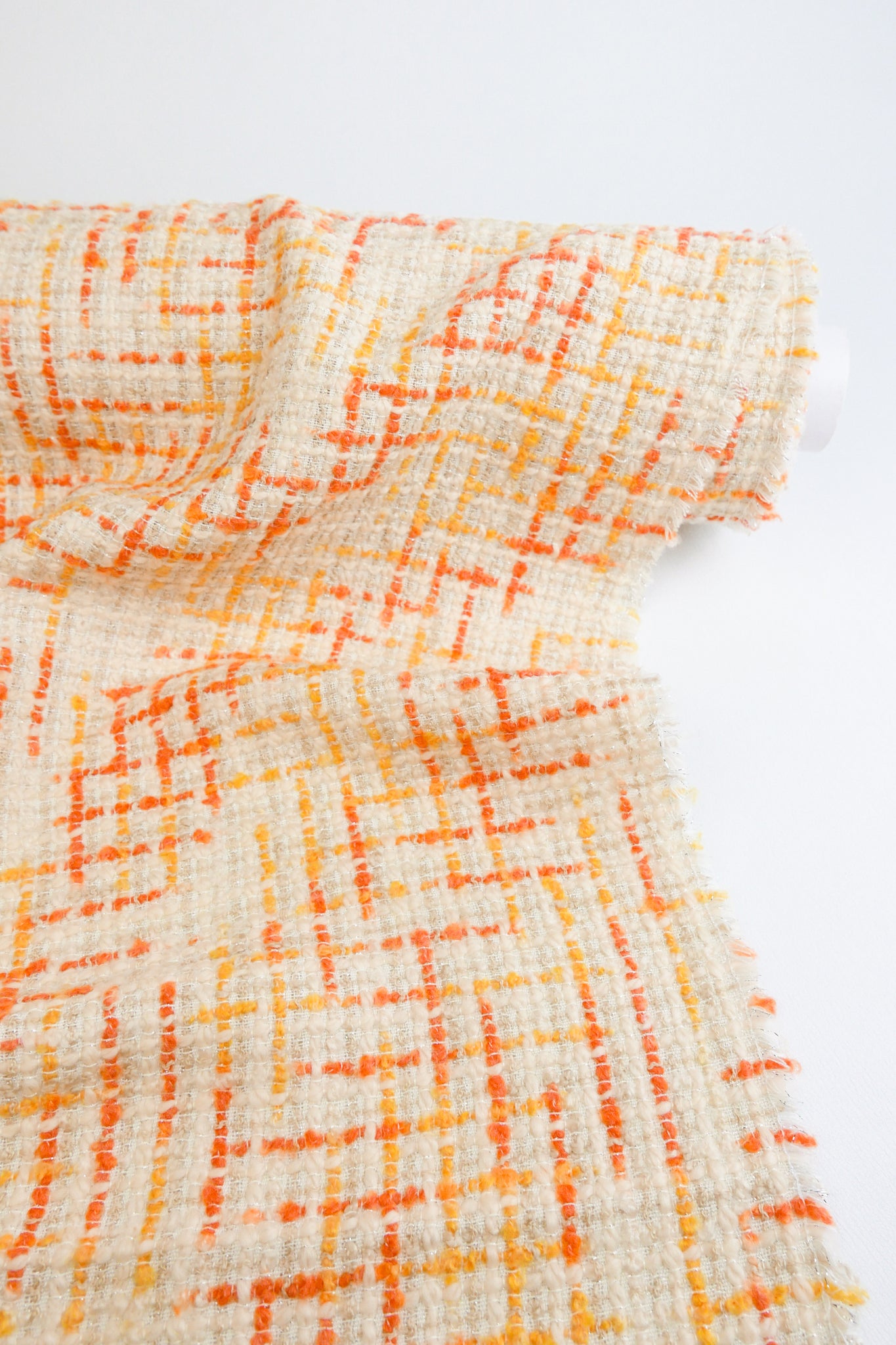 An exceptional fabric, wool tweeds like this are hard to come by. Diana is a timeless bouclé with a beautifully tactile handfeel, woven from a mix of yarns in tangerine, yellow, pearl, and off-white with silver lurex throughout, making it truly unique. Heavyweight and holding good structure, Diana would make into long-wearing jackets, coats, dresses, skirts and trousers.