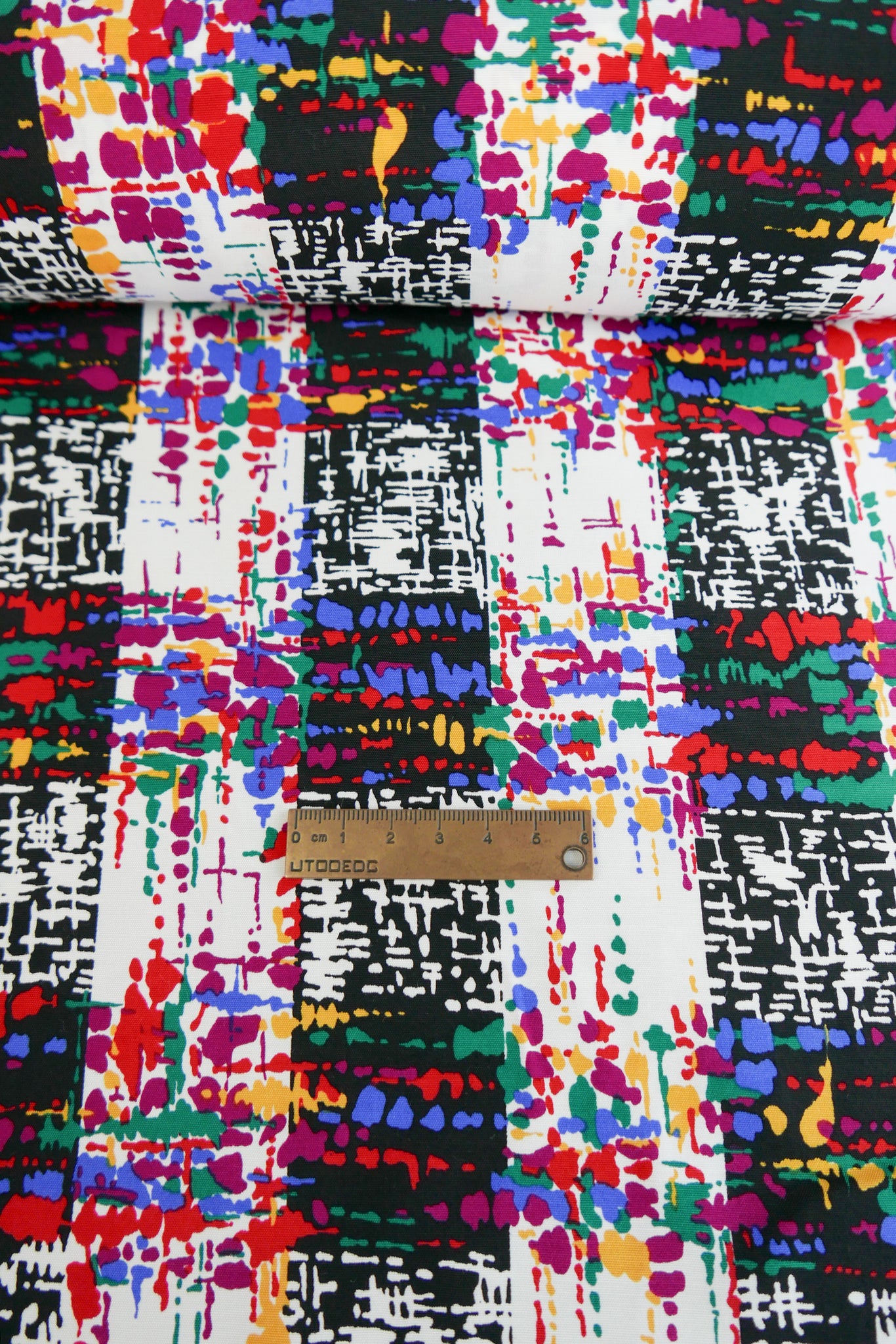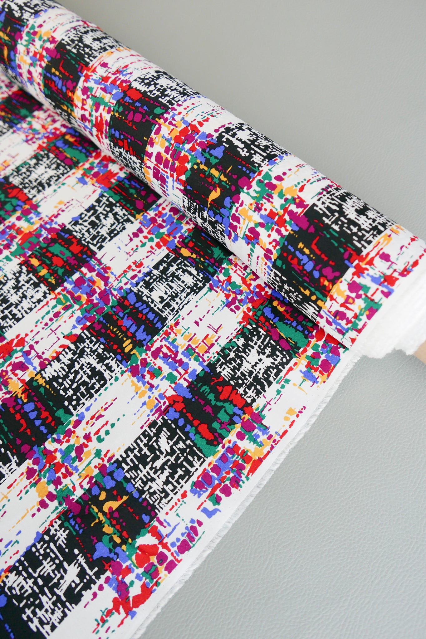 Multi Coda is a striking printed viscose with a nostalgic check print in black and off-white with bright burgundy, green, yellow and blue throughout. Fully opaque and with a soft handle it requires no lining, making for perfect trans-seasonal pieces. Lightweight and with beautiful drape, it is perfect for pleats or gathers and would make into a divine dress, blouse, skirt or sarong.