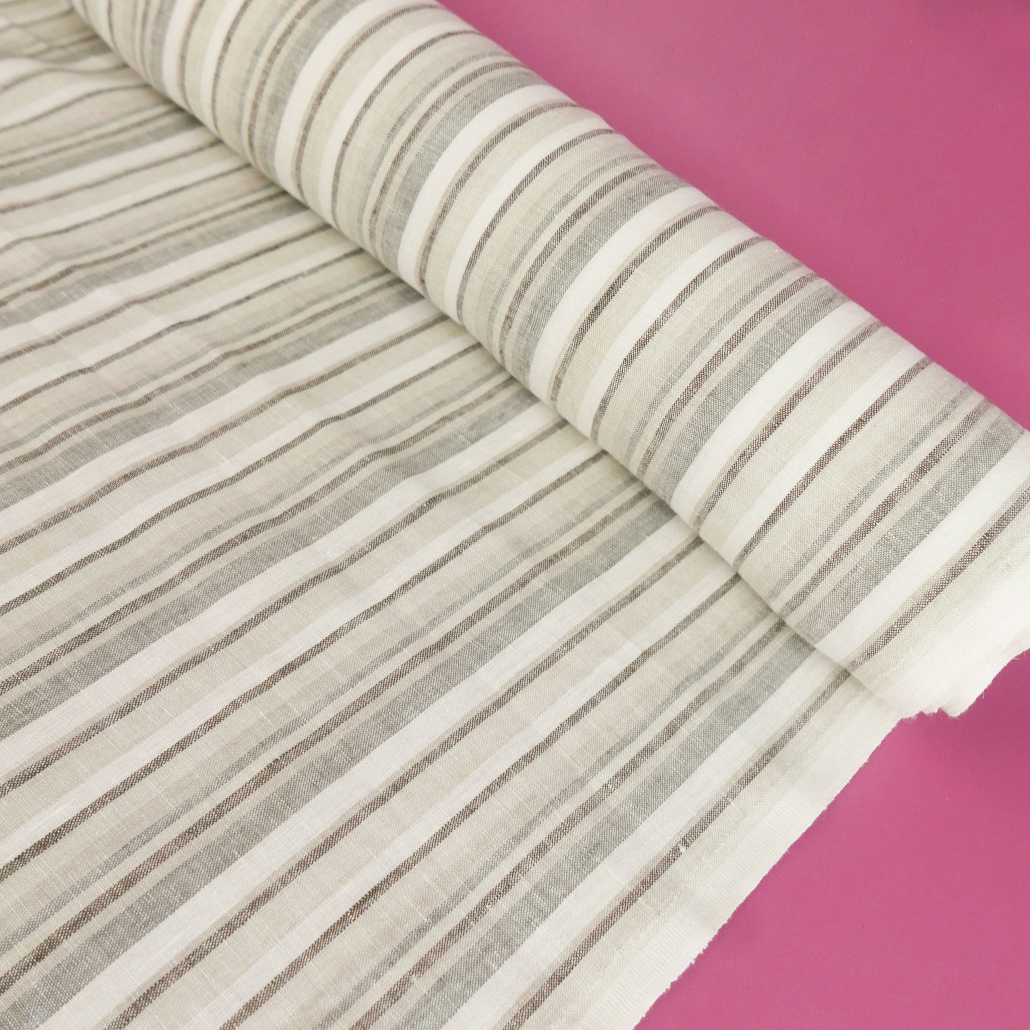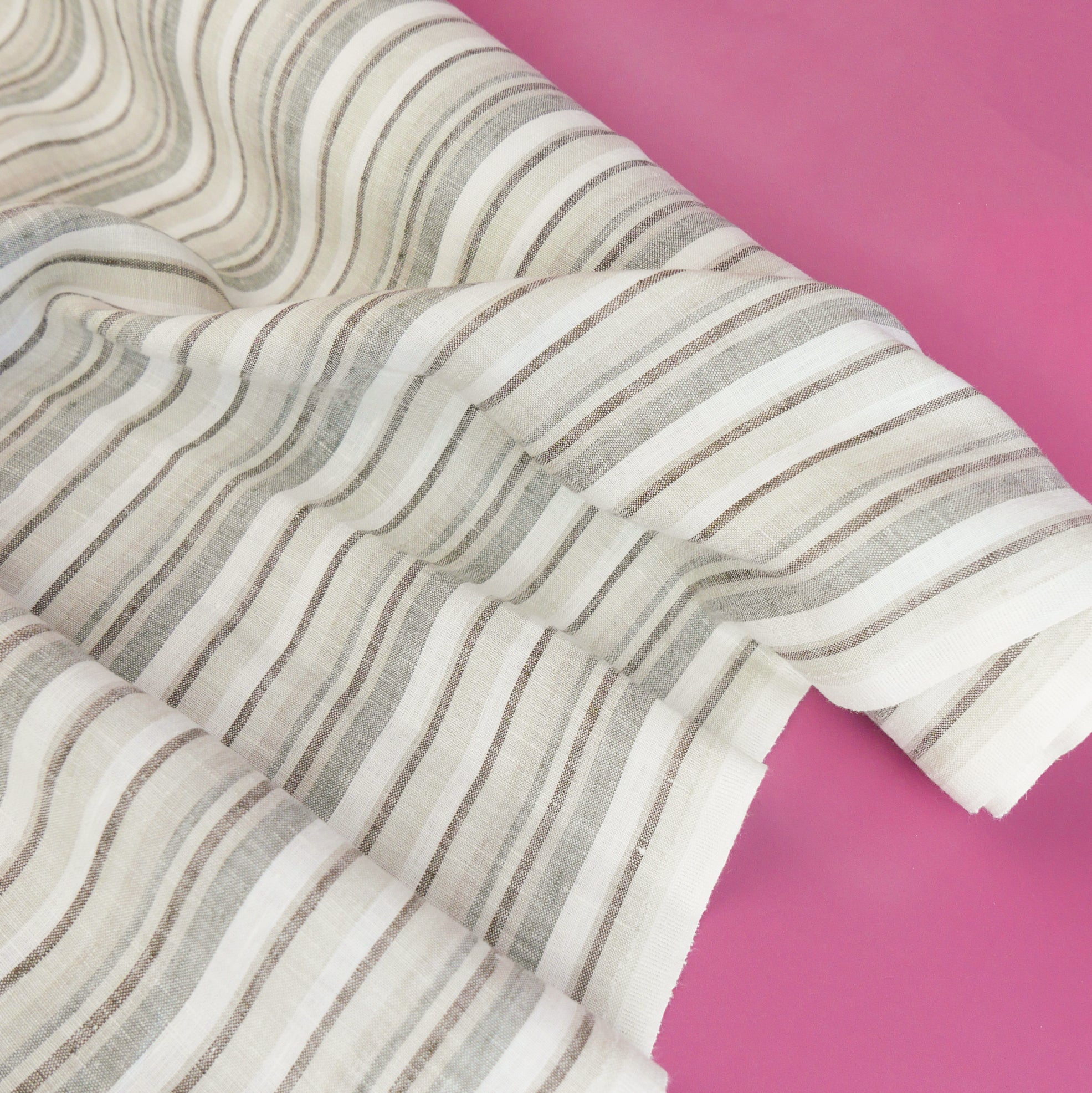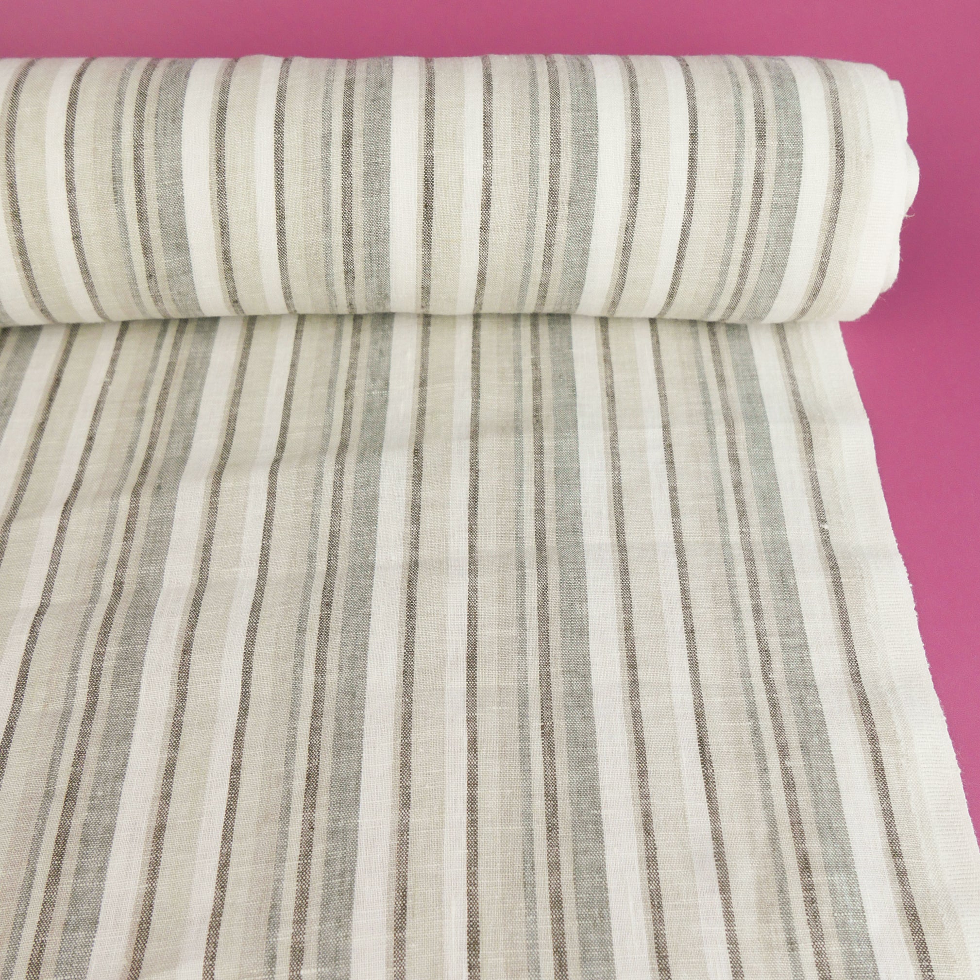 Helene is a beautiful pure linen with a stripe design in shades of brown on an off-white cloth. Helene is special as it is yarn dyed, which means the yarn is coloured before being woven rather than top dyed. This gives it a true colour which fades a lot less over time and ensures deeper, richer colours. Lovely and midweight, it's completely opaque and holds plenty of structure. Helene would make a perfect skirt, dress or shirt.