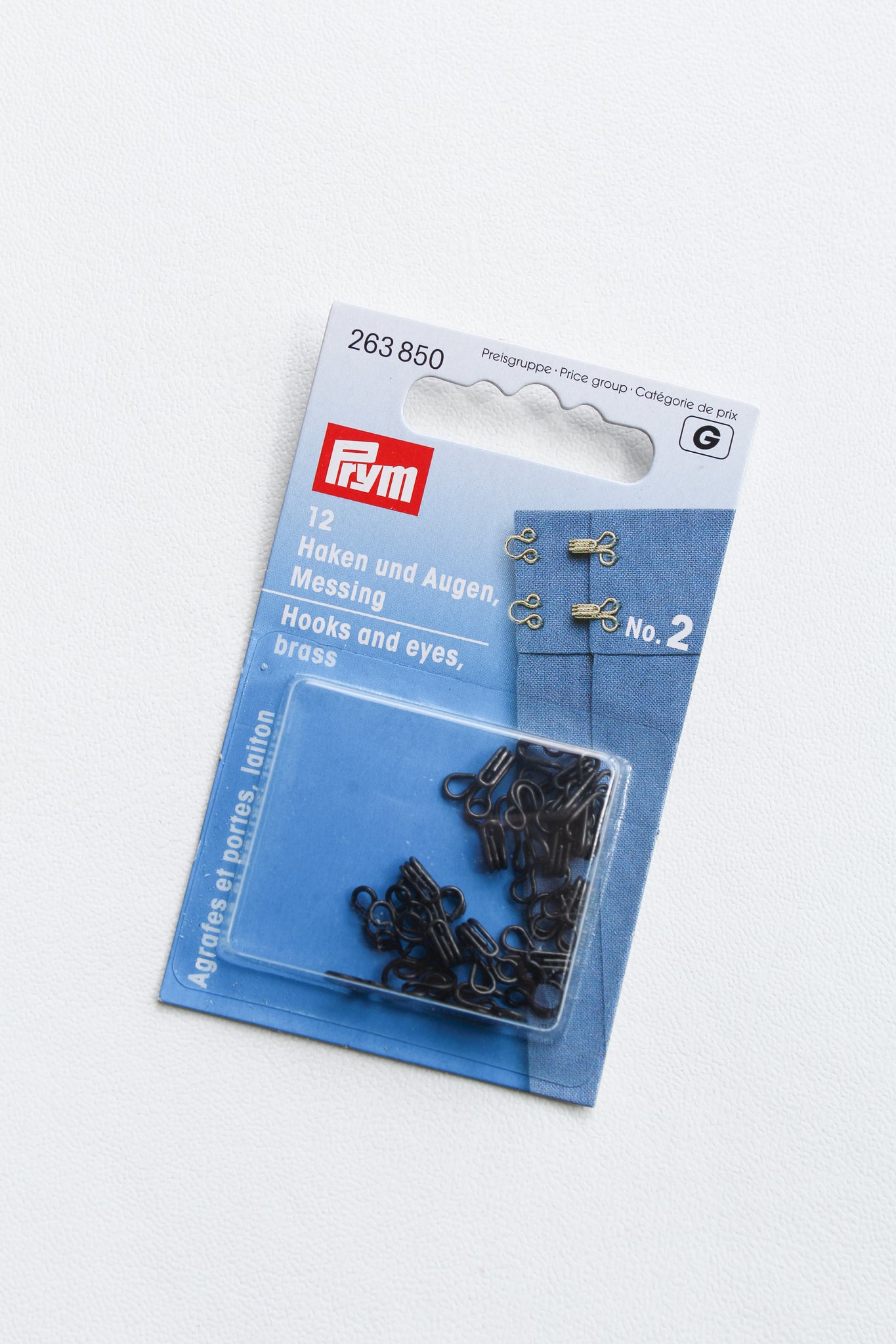Prym sew on brass hook and eyes in black, size No. 2, suitable for light to medium weight garments. Perfect for blouses, shirts and dresses.