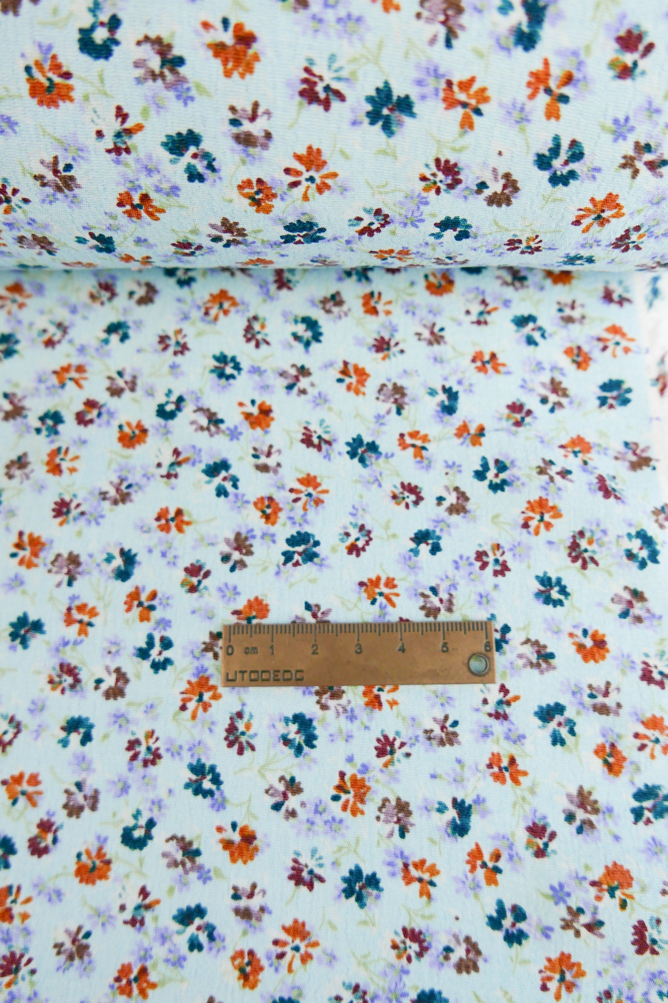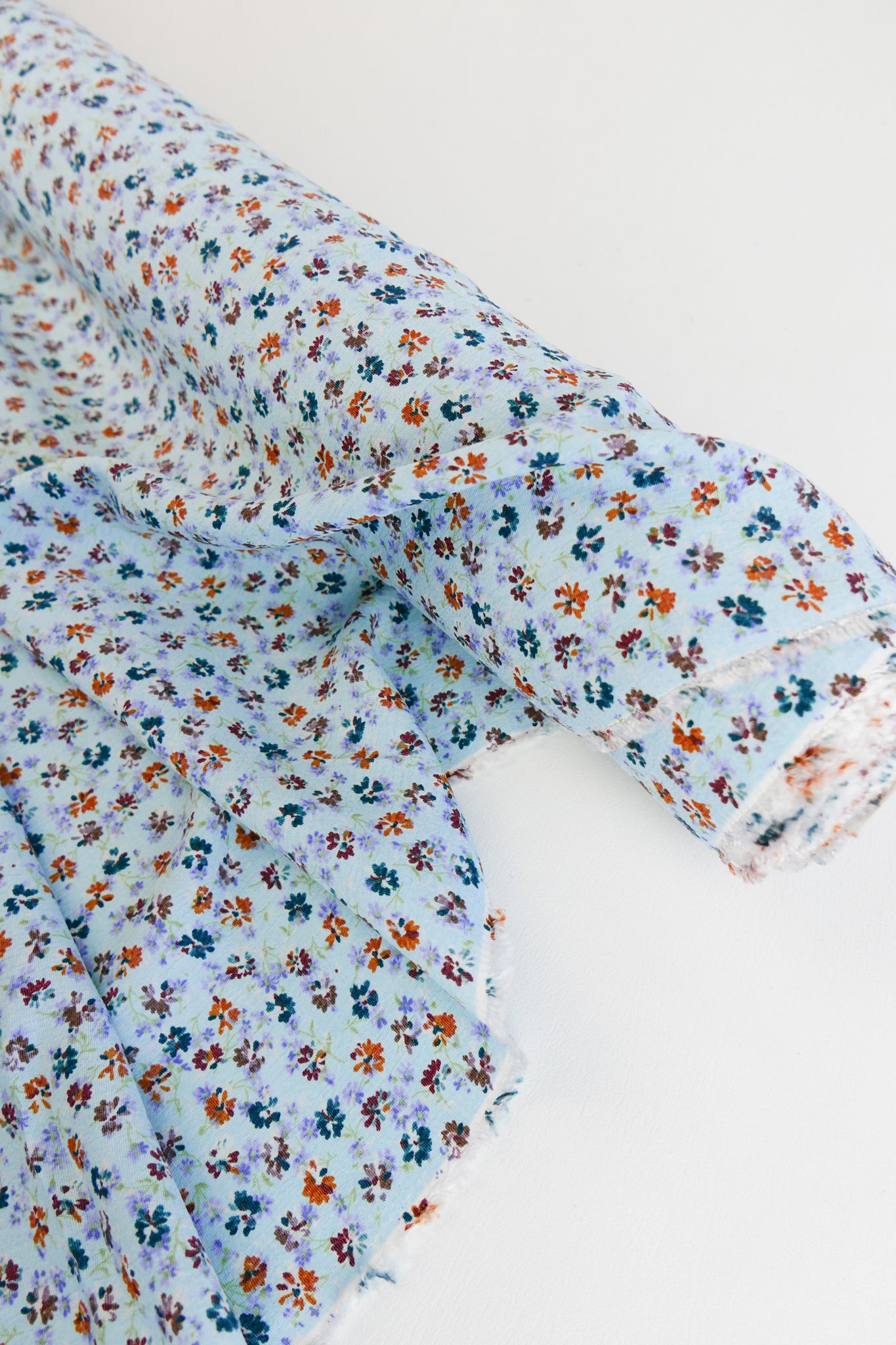 Hydrangea is a pretty viscose crepe, featuring a printed floral design on a powder blue base. It is lightweight and fully opaque, and being a crepe it has a beautiful soft textured hand feel and won't crease easily. Hydrangea will hold detailed frills well, making for perfect statement tops, dresses, flowy pants or skirts.