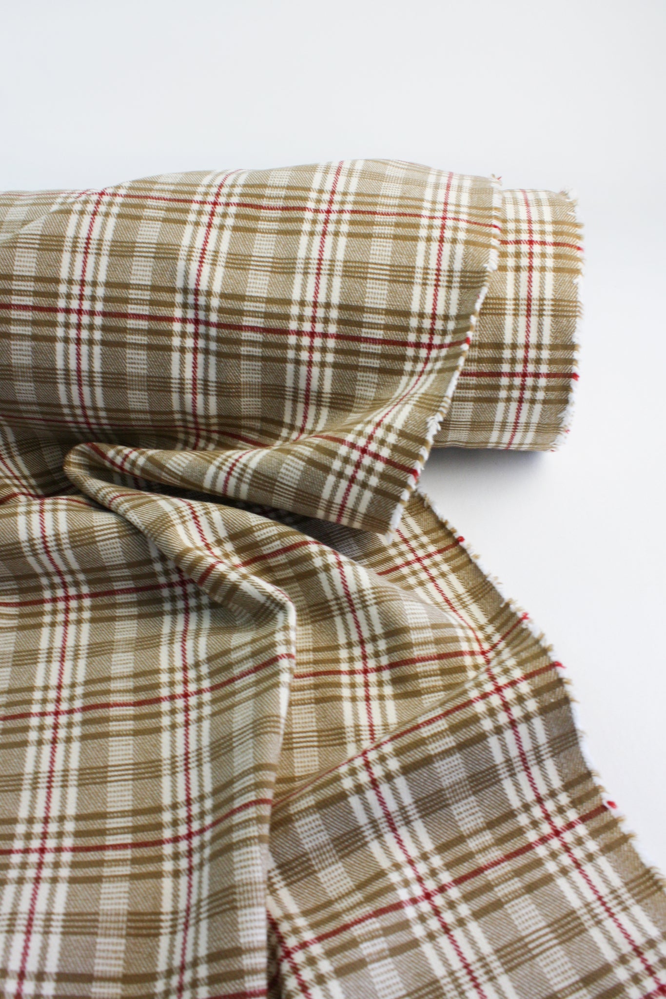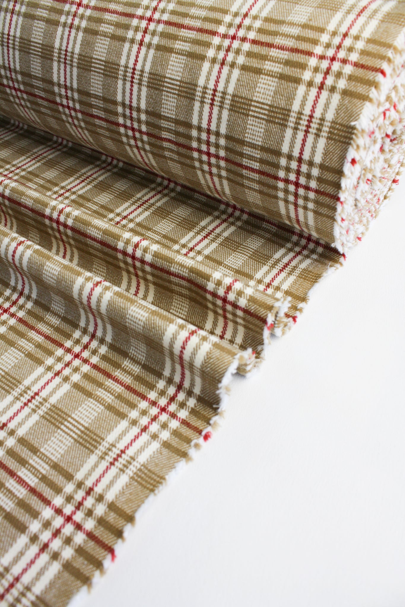 Livia is a fabulous Japanese-made high stretch wool suiting similar to a ponte, perfectly midweight with a double-faced check design in brass and ivory with accents of a windowpane check in red. Completely opaque, it has ample two-way stretch ideal for trans-seasonal slip-on pieces. Gentle against the skin, it holds soft structure, perfect for layering pieces such as jackets, tops, dresses and leggings.