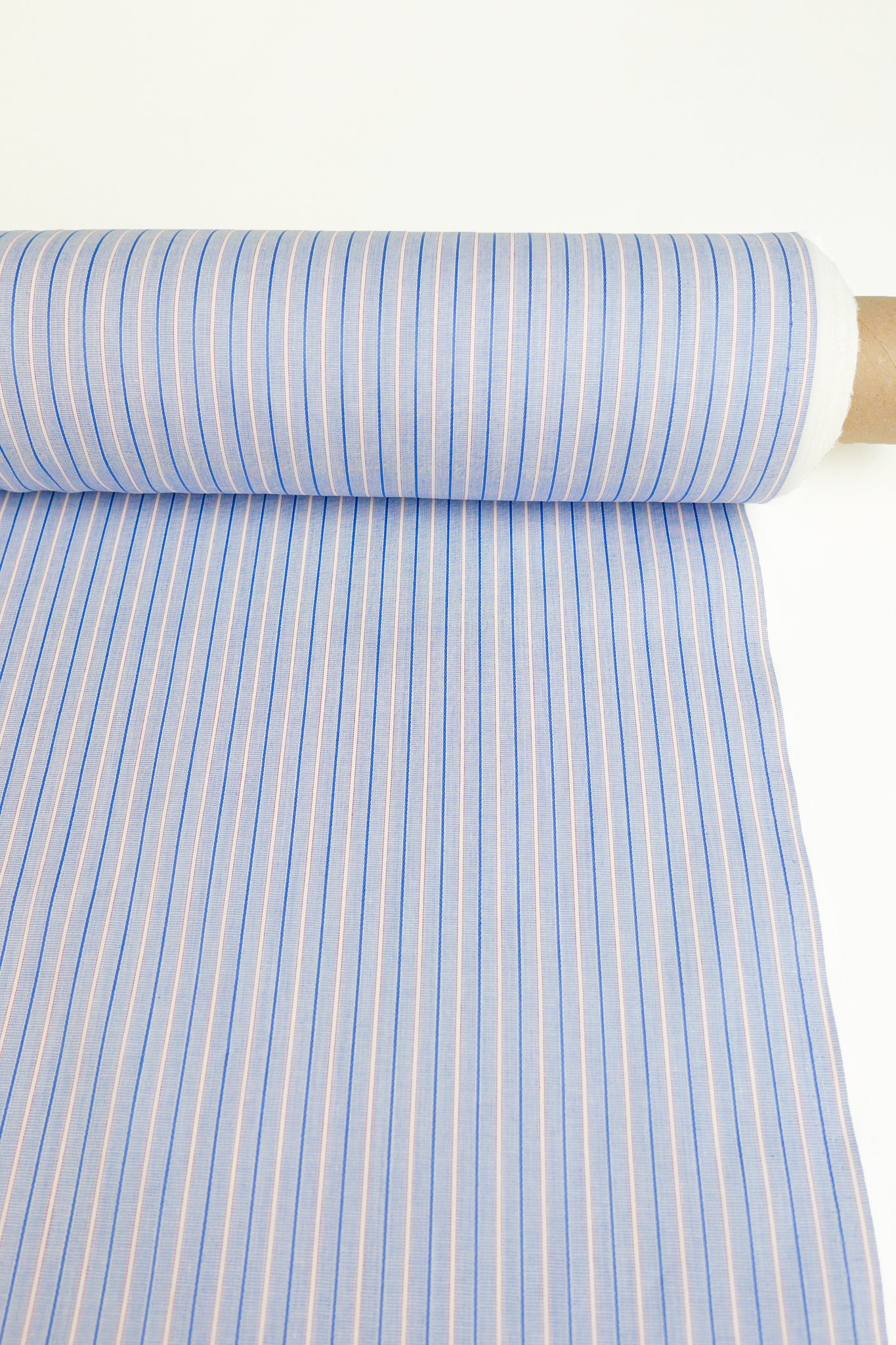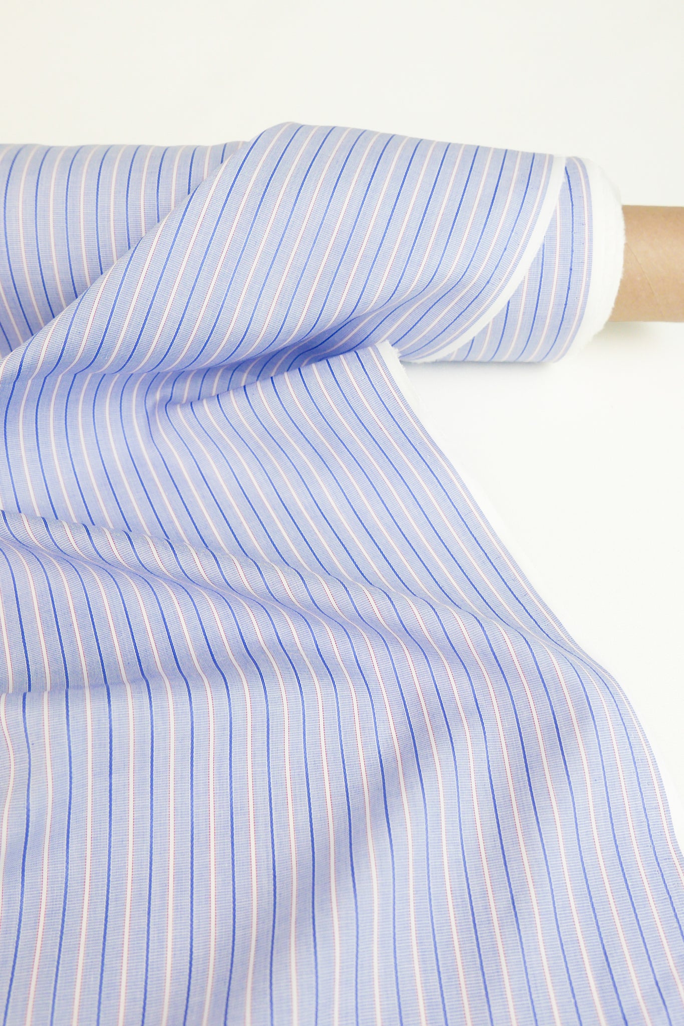 Matilda is 100% American Supima cotton yarn, woven together by the finest shirting manufacturers in Japan. It comes in a classic yarn-dyed stripe design in sky blue and red on an off-white cloth. Lightweight and completely opaque, Matilda holds good structure, and will make into beautiful silhouettes with gathers, puffs and volume. This yarn-dyed cotton would make a beautiful shirt, summer-weight pant, skirt or dress.