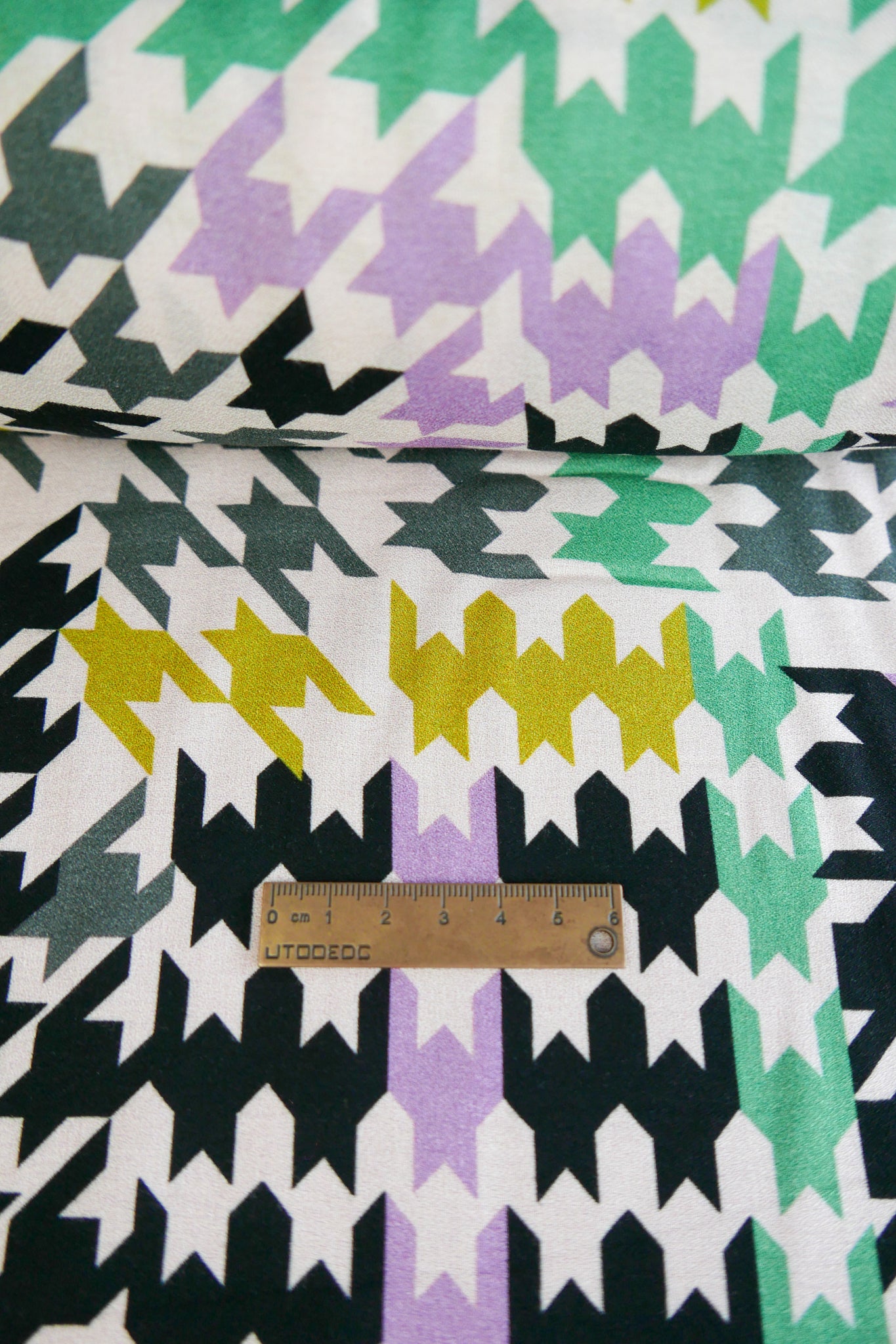 Nadira is a pretty viscose crepe featuring a houndstooth print in lavender. Lightweight and mostly opaque, it has a beautiful, soft, textured handfeel and won't crease easily. Nadira will hold detailed frills well, making for perfect statement tops, dresses, flowy pants or skirts.