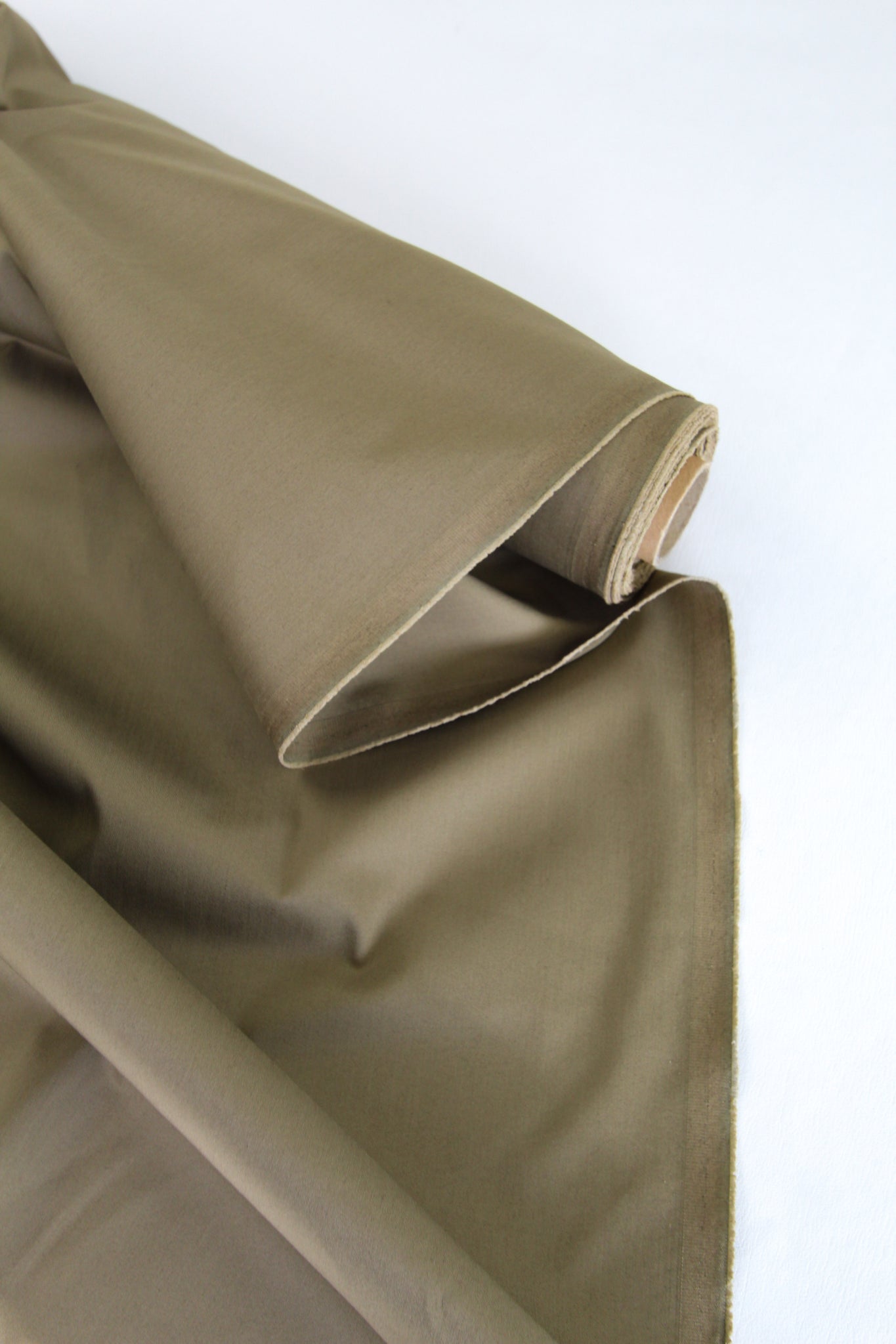 Pallegrino is a stretch cotton with a fine twill weave, coming in a tonal antique gold with a subtle metallic finish. It is crisp and structured with a natural stretch, and works well as a shirting or lighter pant weight.