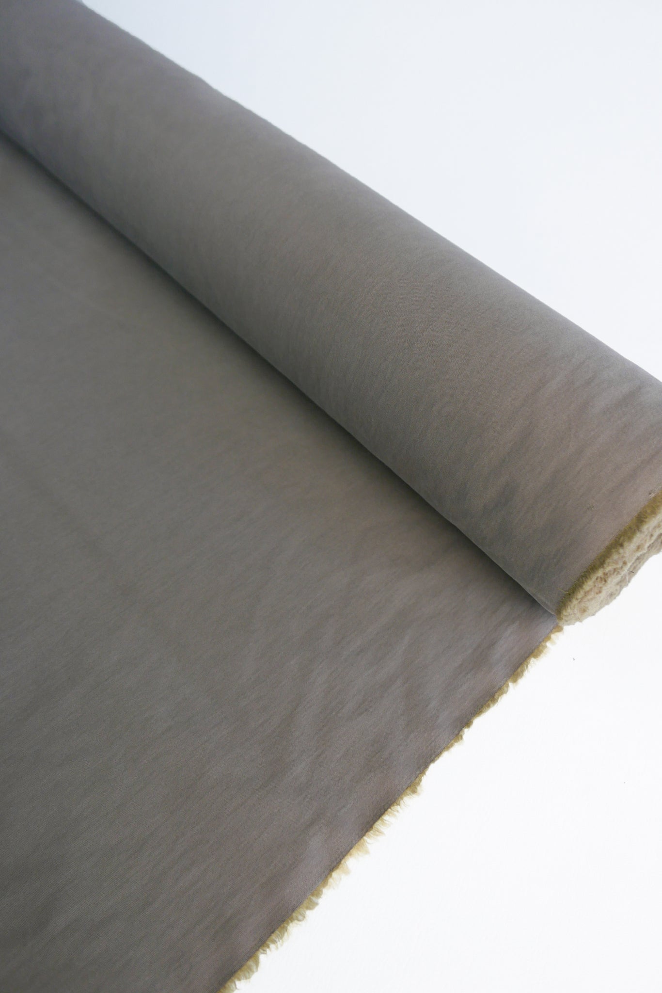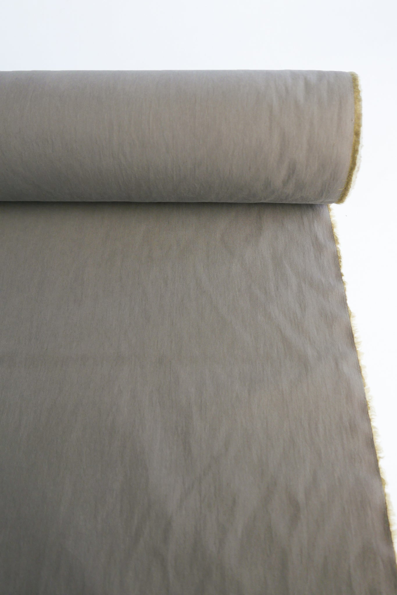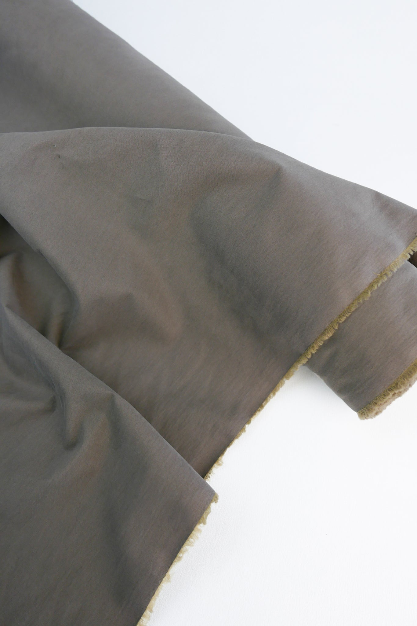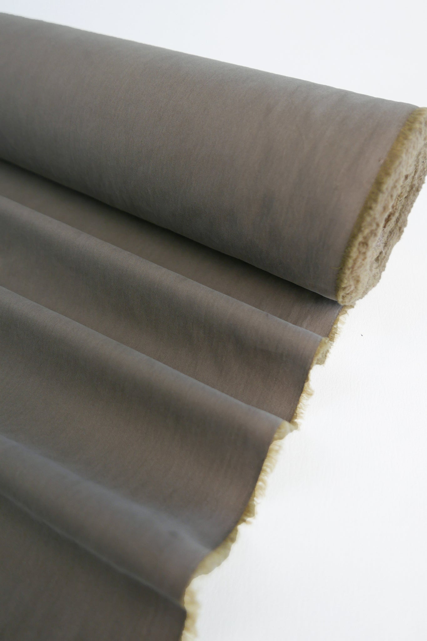 This typewriter cotton shirting is a very fine and densely woven cotton poplin coming in a mushroom colourway. It is particularly interesting, as the yarn has been sand-washed, giving it a softer hand feel and a peachy finish. It is highly durable and breathable. Fully opaque and holding good structure, it is perfect for a wide range of garments and occasions. This includes things like structured overshirts or dresses, trousers, waistcoats and trench coats.
