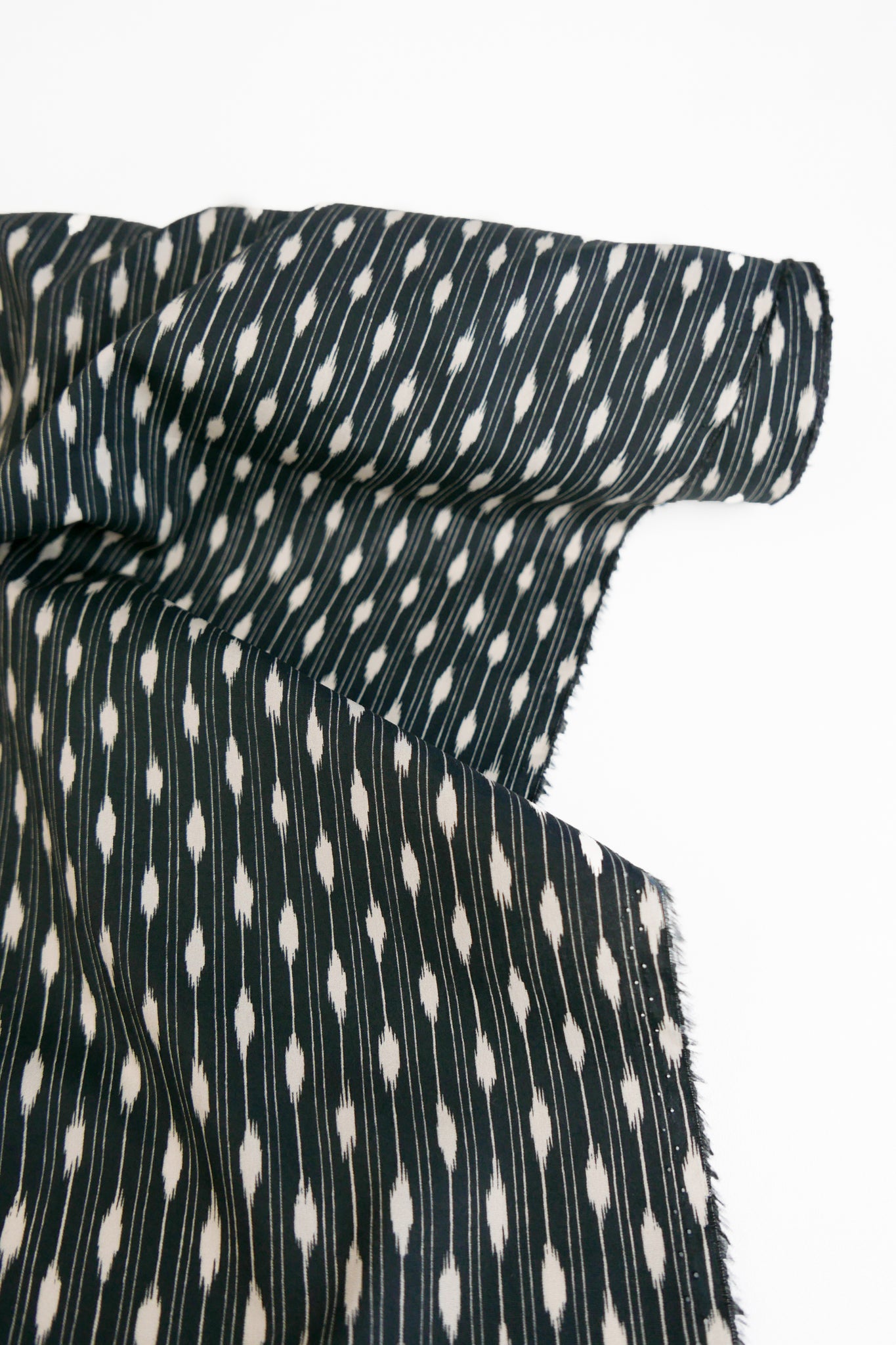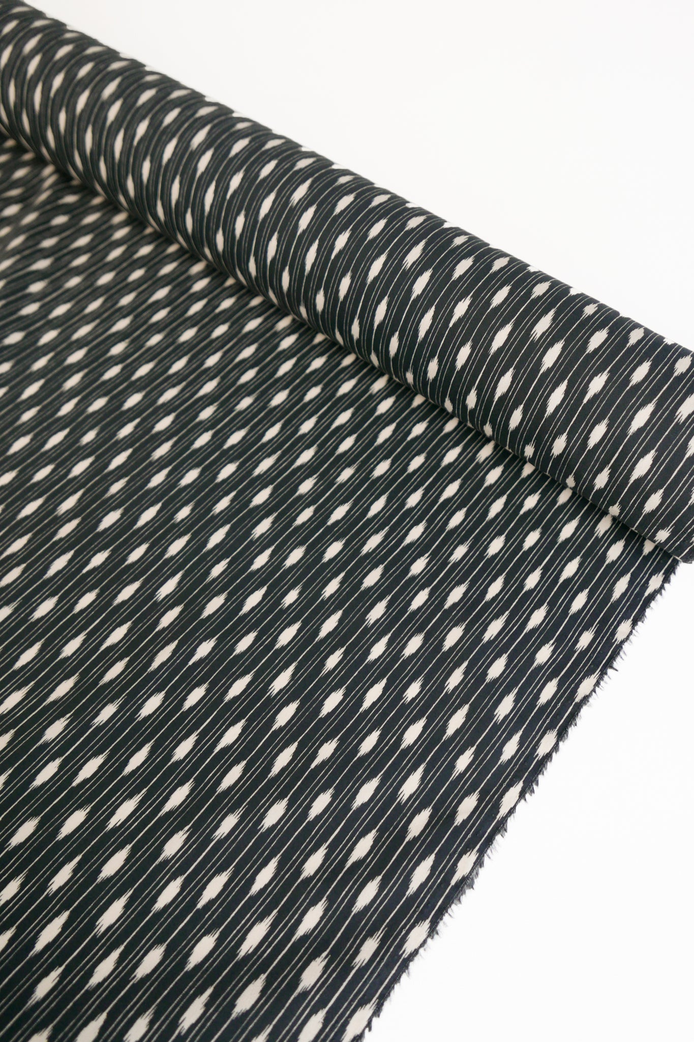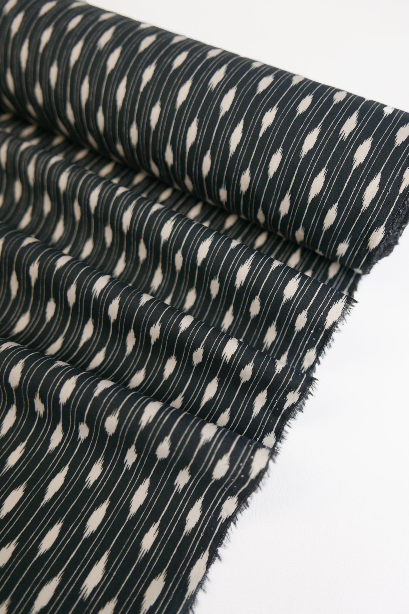 Batik is a crisp printed cotton from Lyon, France, featuring a geometric stripe design in ecru on a black cloth. It's crisp, structured and the ideal shirting weight cotton for summer garments. Completely opaque, Batik would make up well as a shirt, skirt, trousers, dress and even striking bed wear.