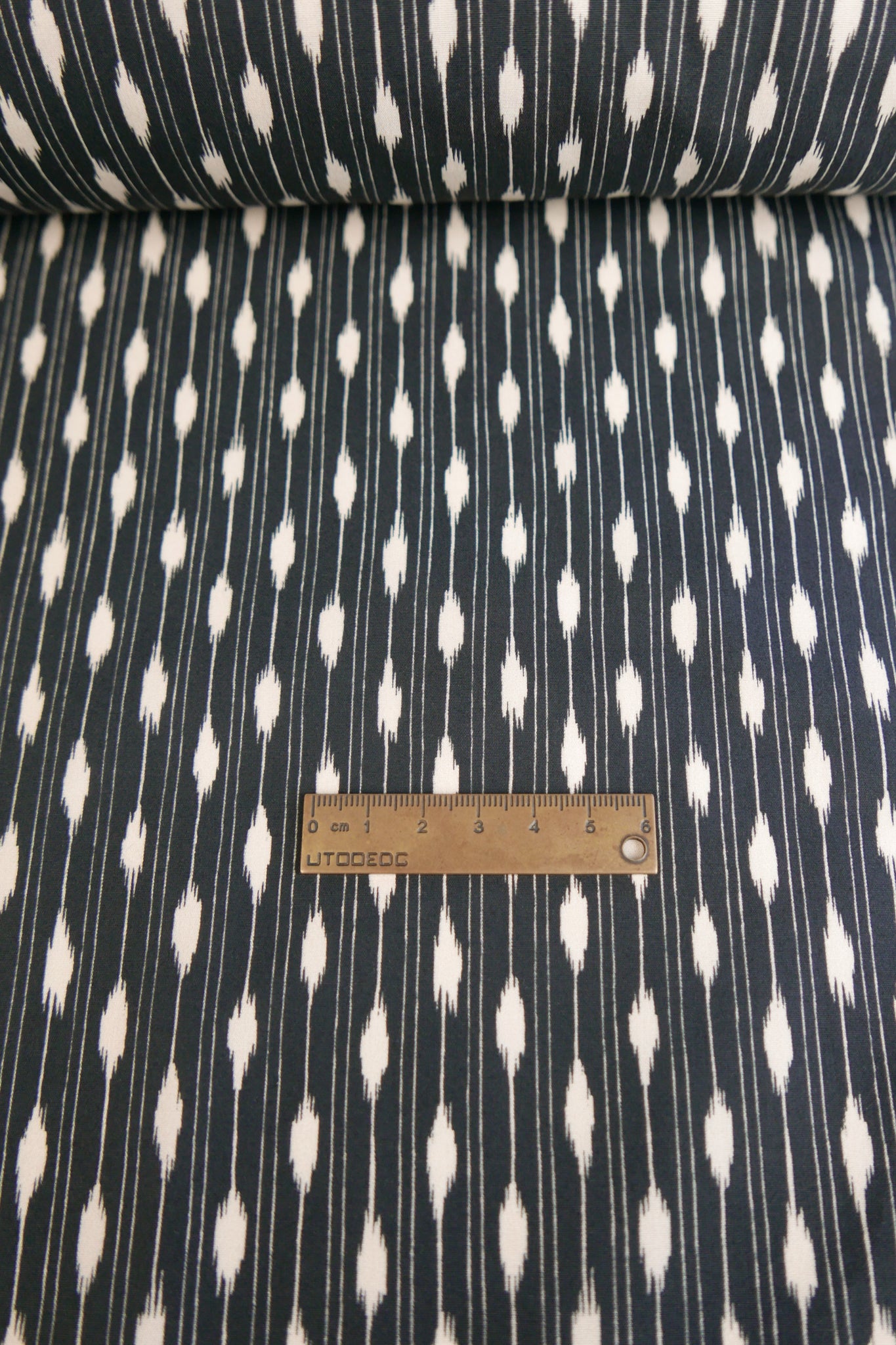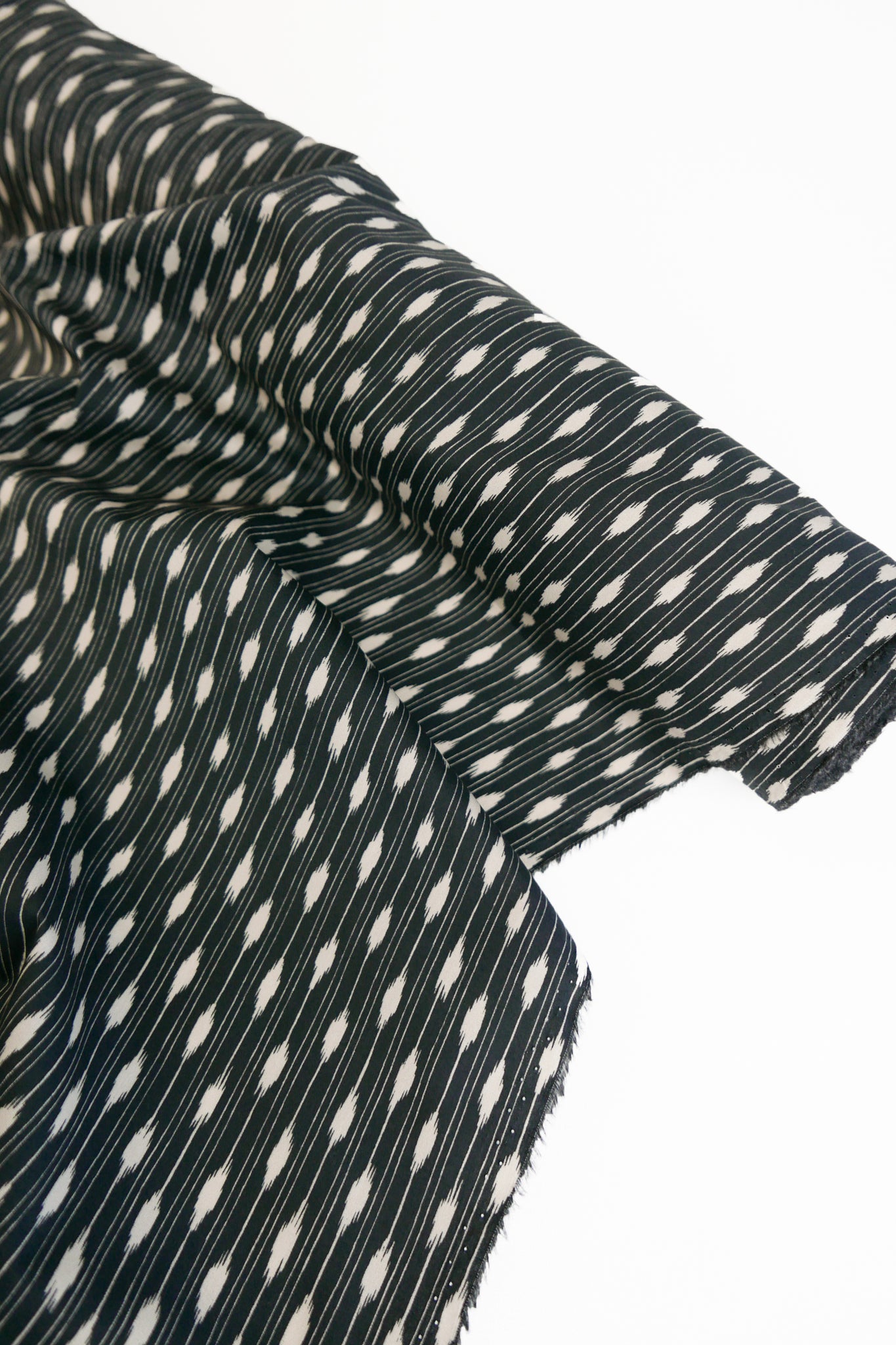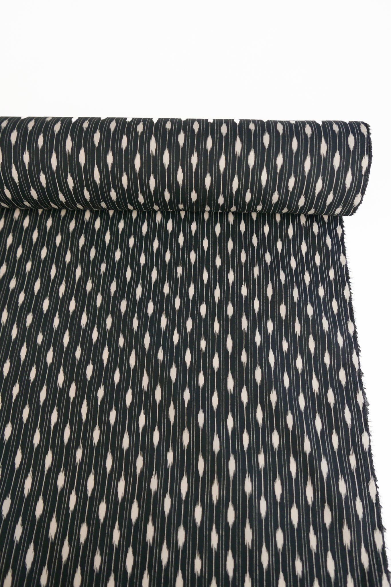 Batik is a crisp printed cotton from Lyon, France, featuring a geometric stripe design in ecru on a black cloth. It's crisp, structured and the ideal shirting weight cotton for summer garments. Completely opaque, Batik would make up well as a shirt, skirt, trousers, dress and even striking bed wear.