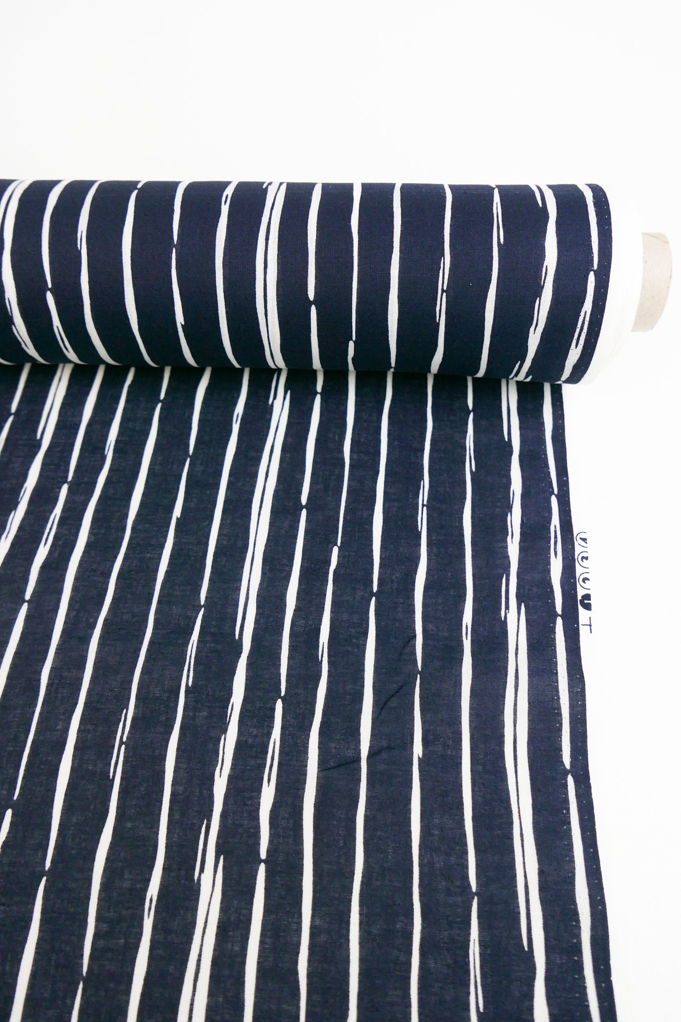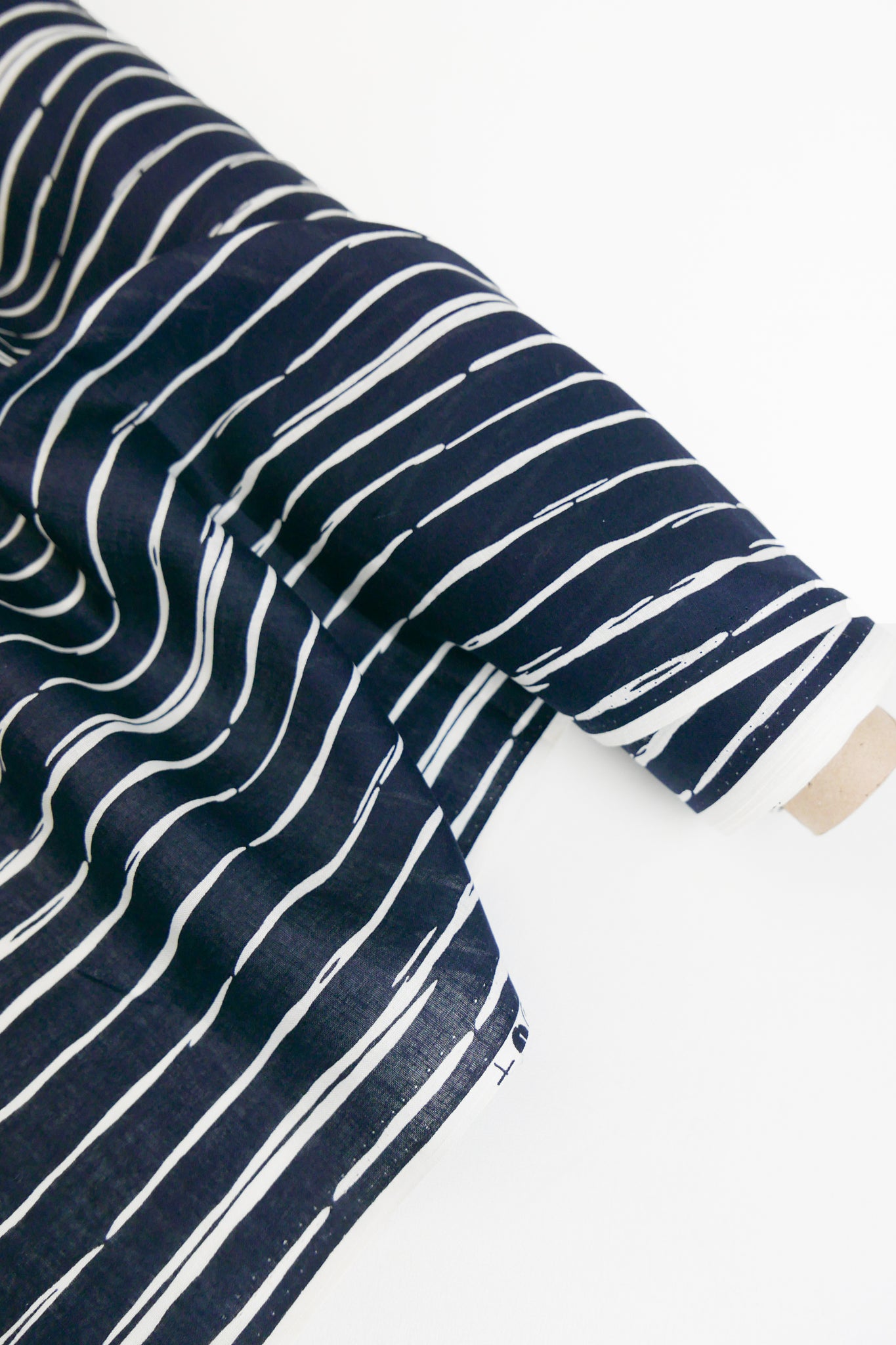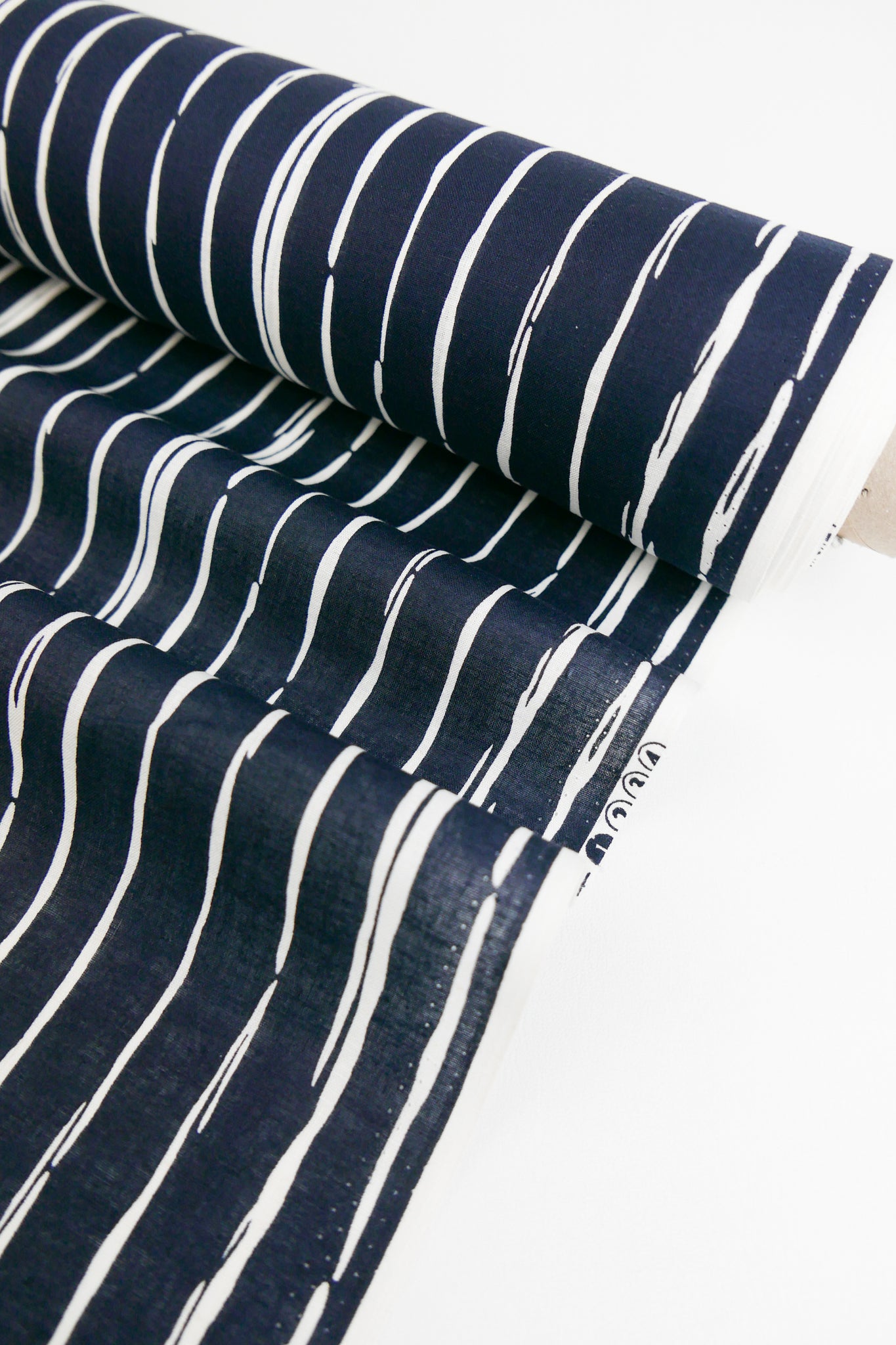 Christopher is a fun, printed linen cotton featuring a brushstroke stripe design in off-white against a navy cloth. Lightweight, it has a soft, smooth finish and holds structure beautifully, and being a blend, it doesn't crease as easily as pure linen. Completely opaque, it's the perfect weight for shirts, dresses, summer pants and skirts that you won't want to take off.