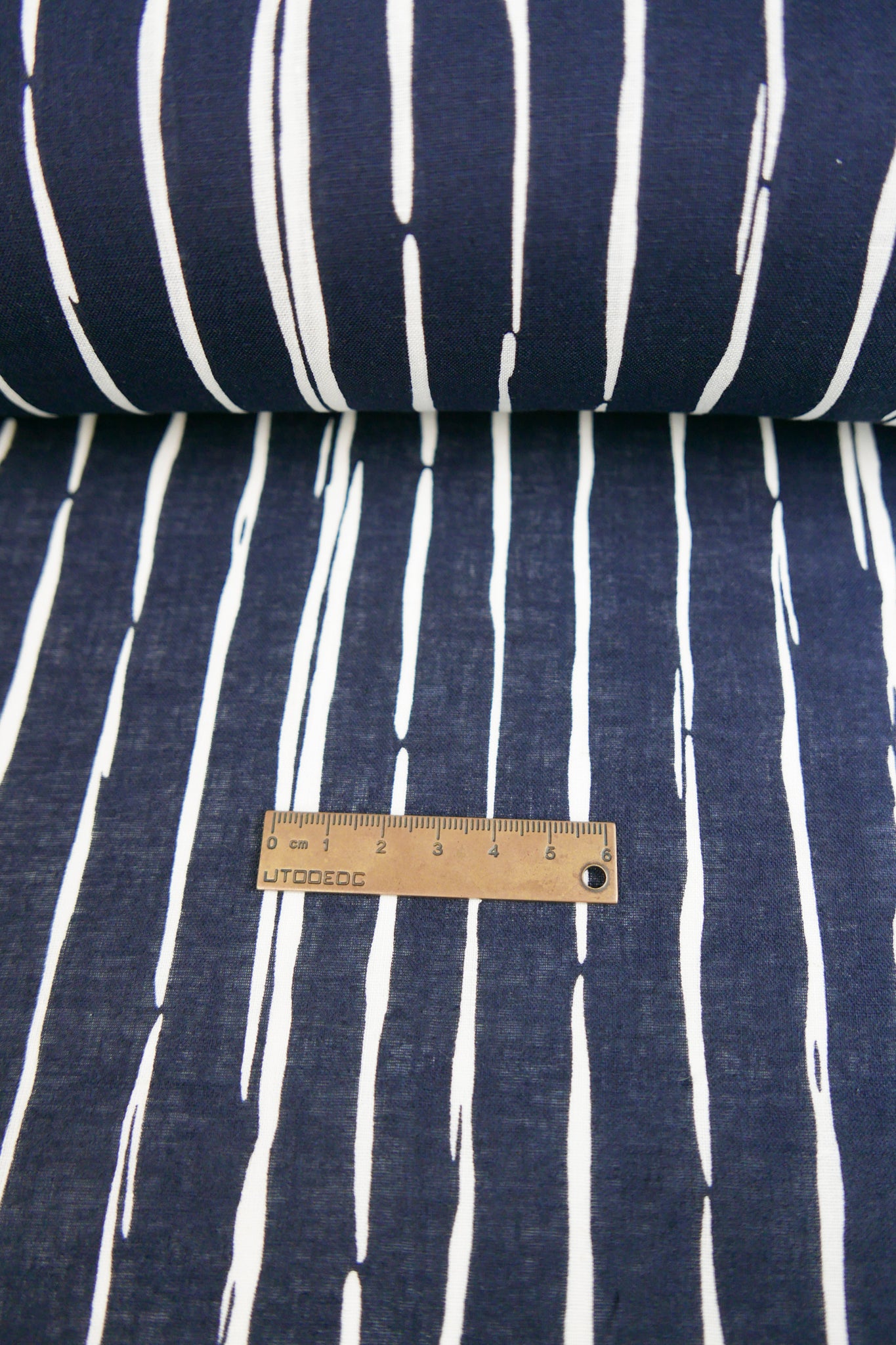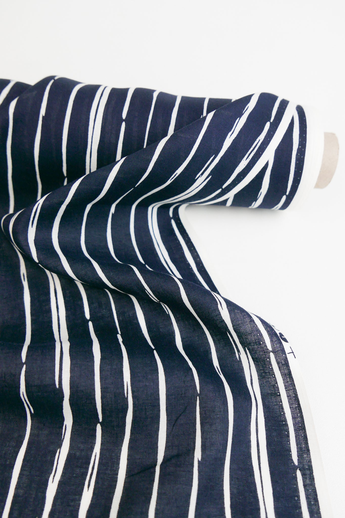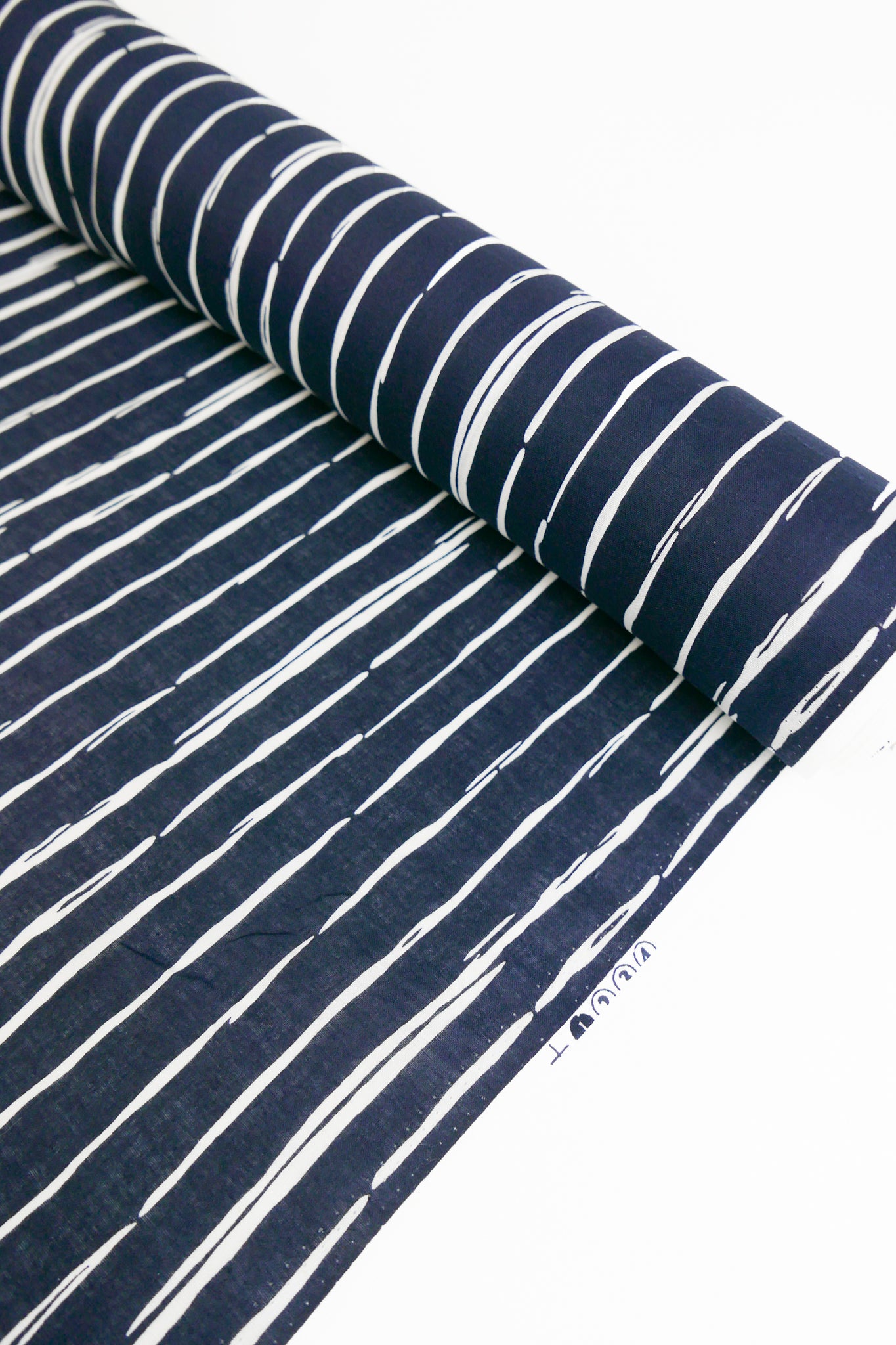 Christopher is a fun, printed linen cotton featuring a brushstroke stripe design in off-white against a navy cloth. Lightweight, it has a soft, smooth finish and holds structure beautifully, and being a blend, it doesn't crease as easily as pure linen. Completely opaque, it's the perfect weight for shirts, dresses, summer pants and skirts that you won't want to take off.