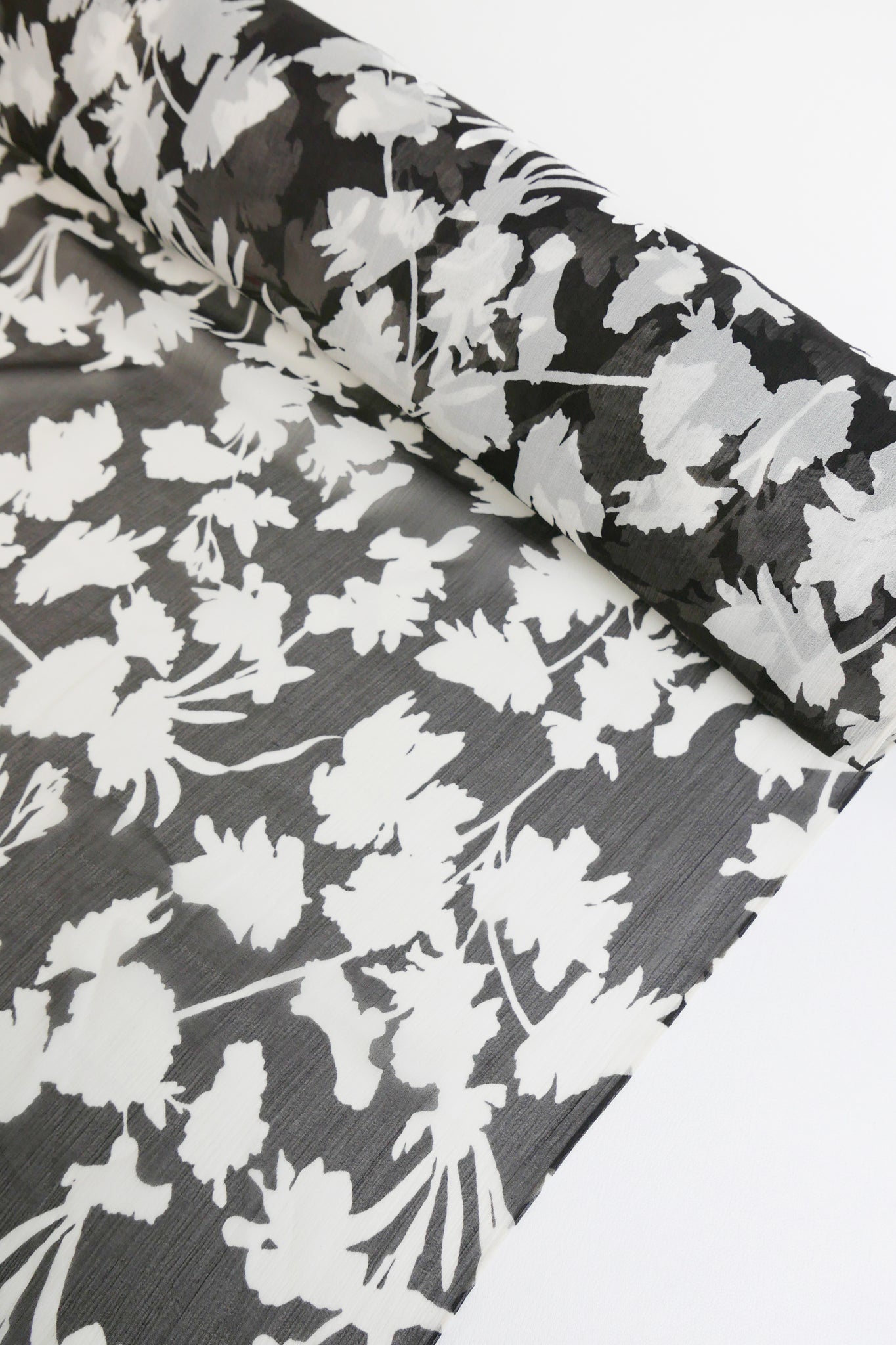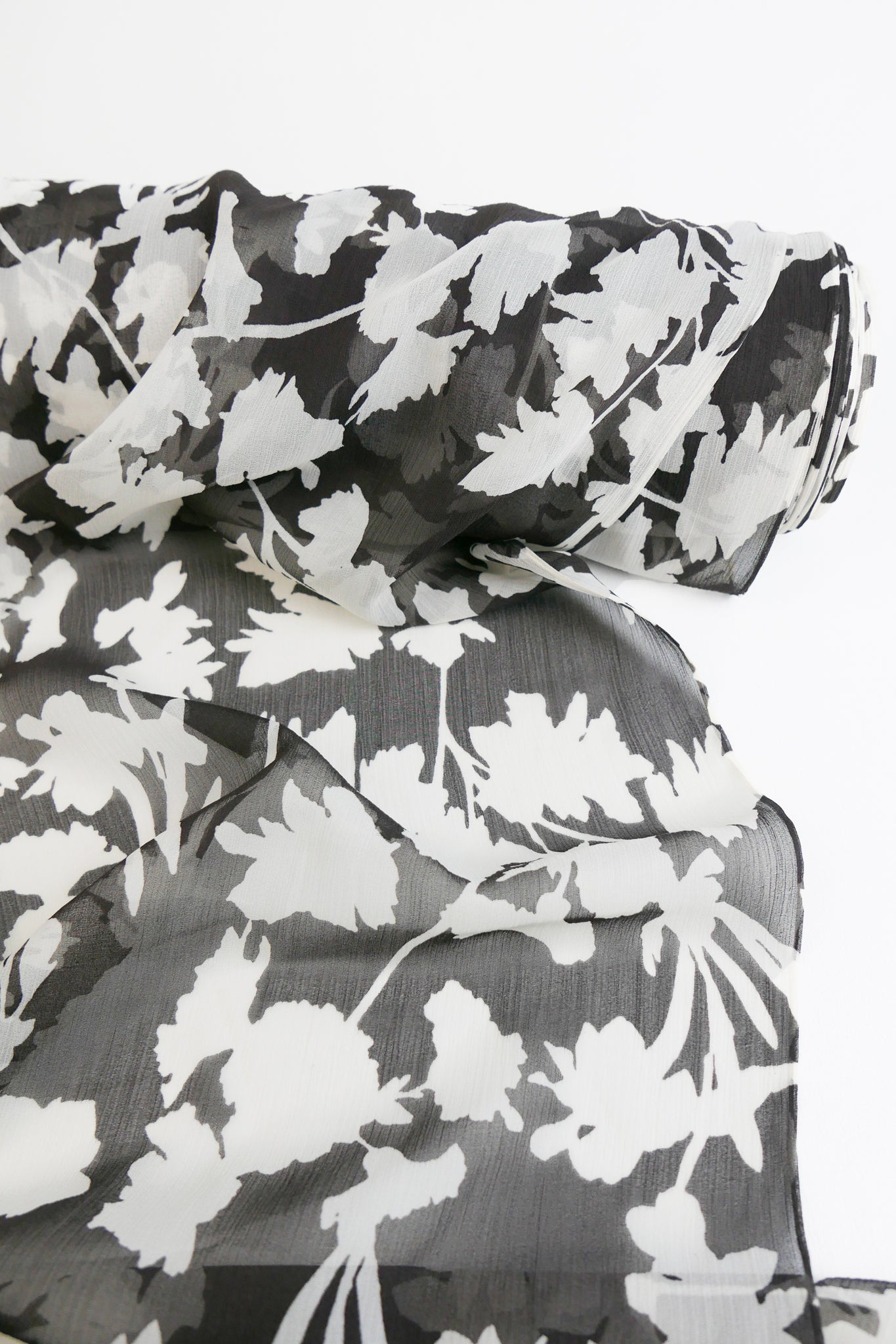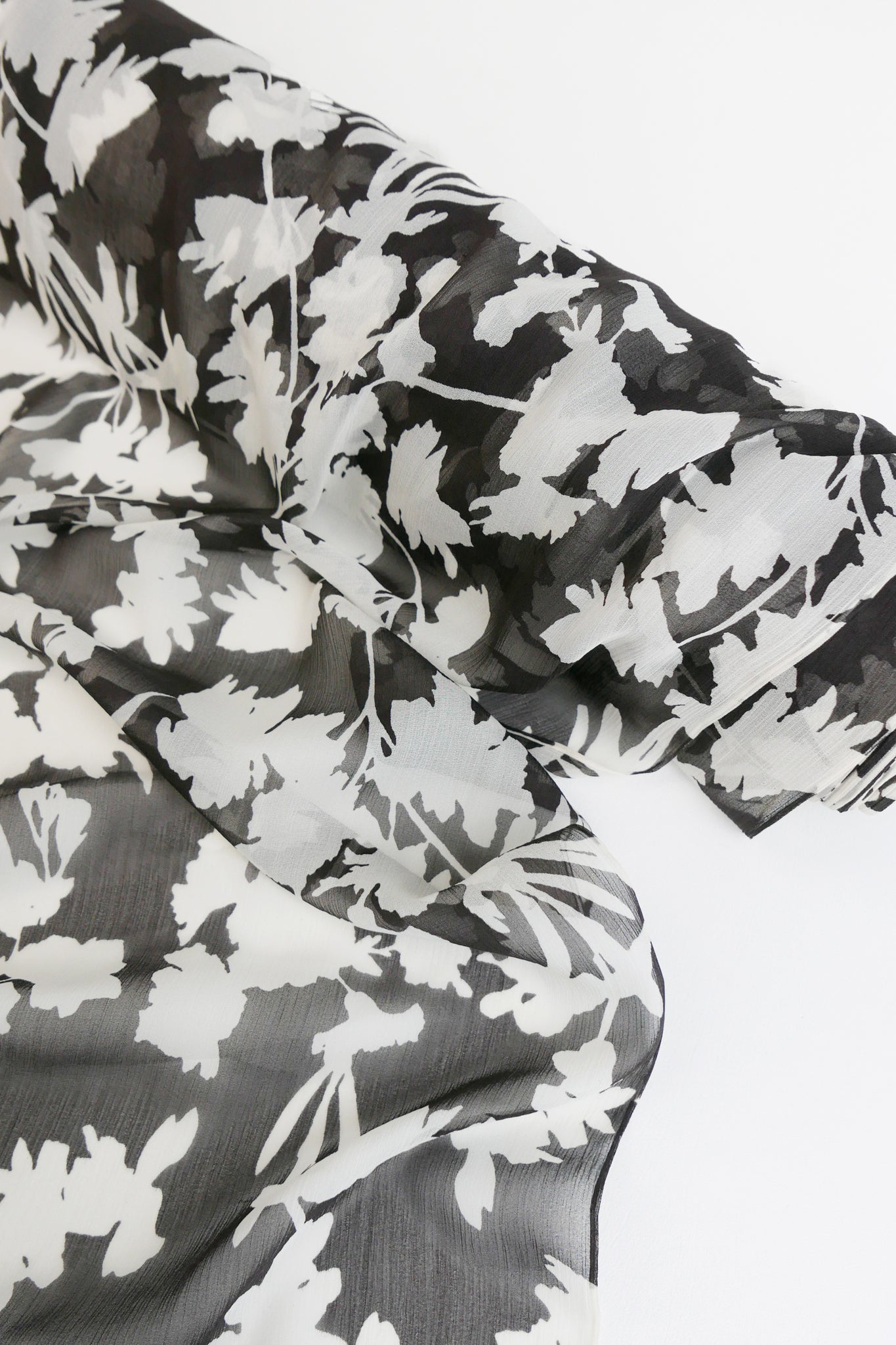 This beautiful silk georgette is super fine and delicate, and features a floral print in black and off-white with a tactile crinkled texture. Lightweight, super floaty and sheer, it's the perfect blouse weight, or line your summer skirts and dresses for a super luxe feel.