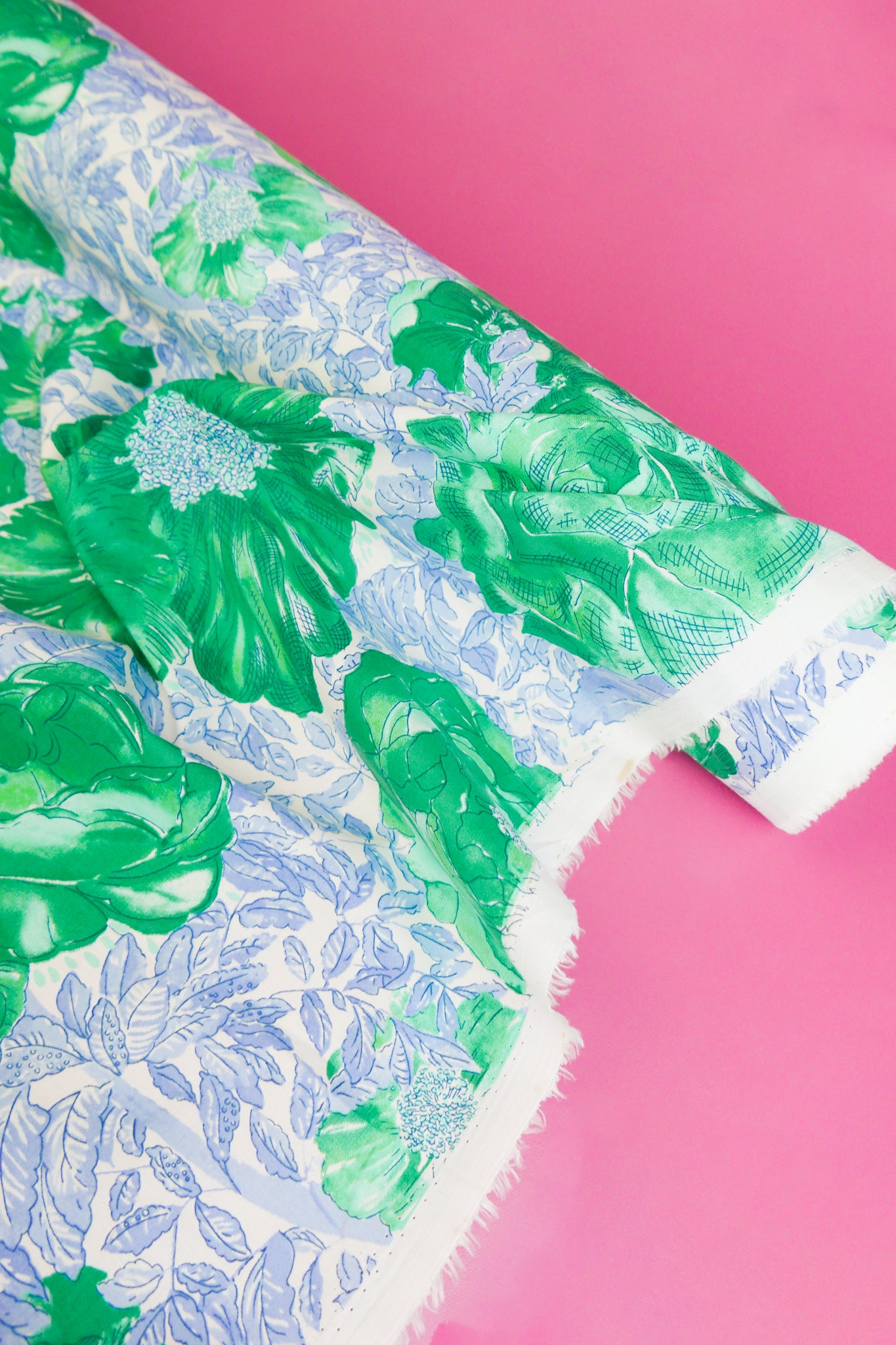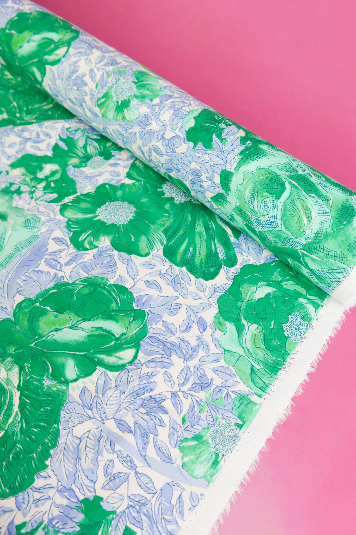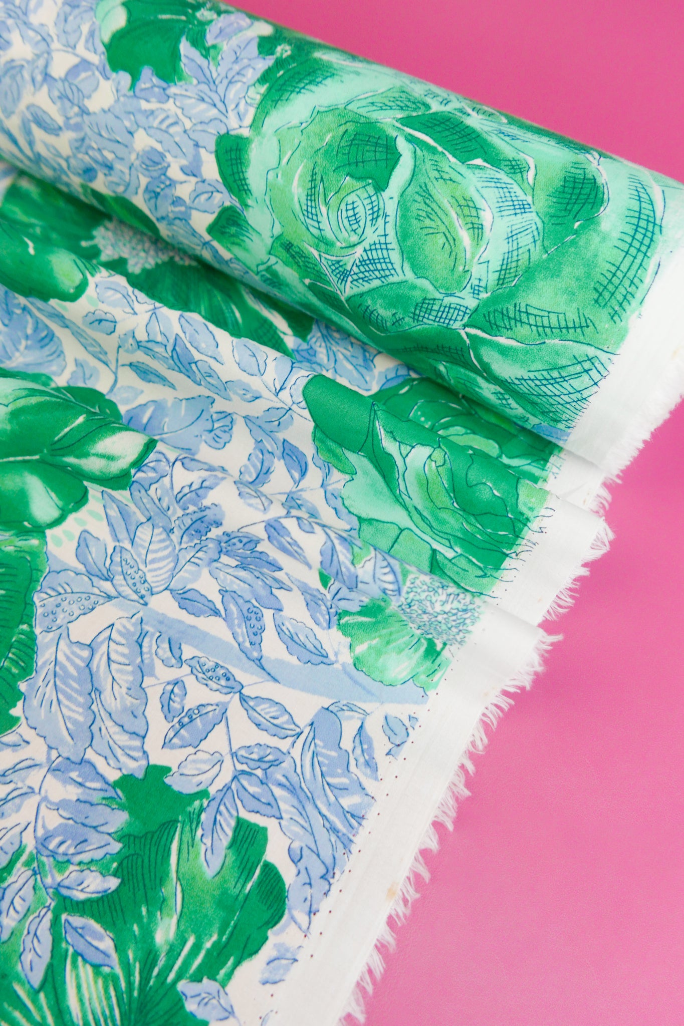 A luxurious essential to any wardrobe, this cotton voile features a beautiful floral print in emerald green and blue on an off-white cloth. 100% cotton, it is lightweight and has a supremely soft hand feel. Mostly opaque and holding soft structure, it would make into the perfect dress, shirt, skirt, or luxurious lining.