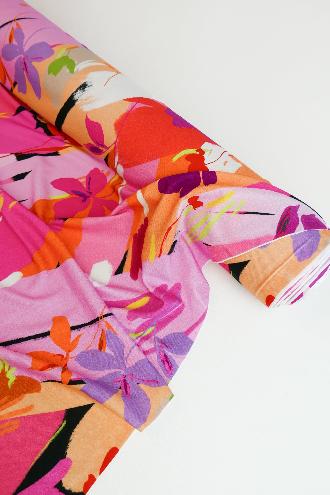 Paloma is an extravagant printed viscose knit in a rose quartz colourway. Lightweight and full of drape, it's perfect to recreate those vintage DVF pieces. It features a vibrant print in various shades of pink, orange, and purple on an off-white base cloth. Anti-pill and anti-curl, Paloma is completely opaque with four-way stretch. It would make the perfect form-fitting dress, a colourful turtleneck layering piece, a show-stopping bias-cut piece or the cutest lounge set.