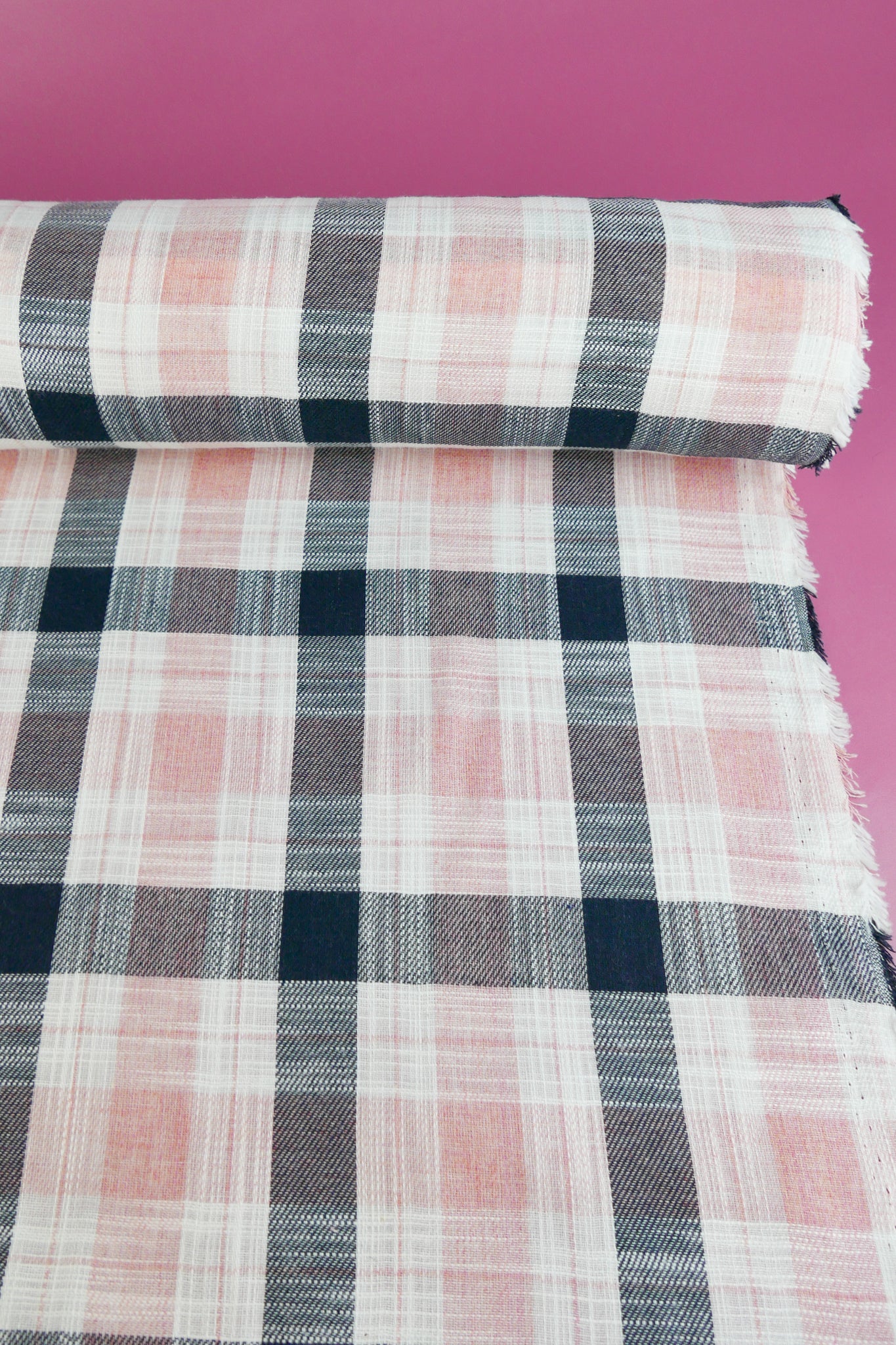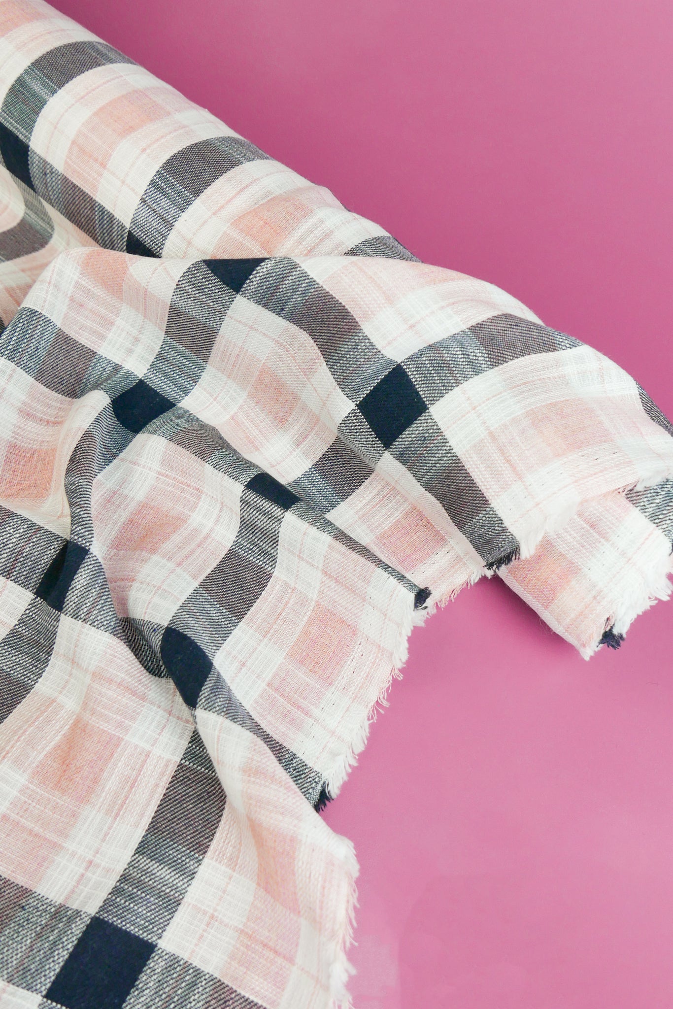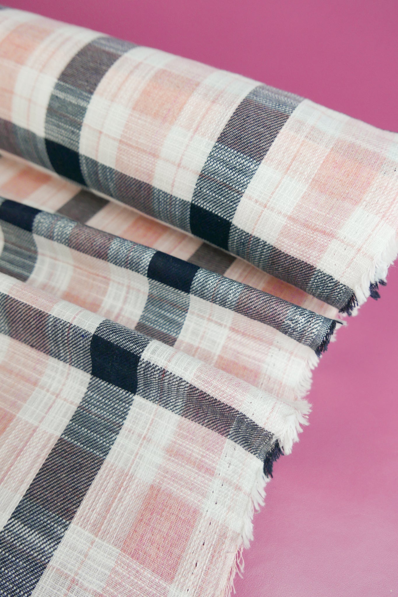 Roberta is a beautiful midweight linen gauze with slubs throughout, coming in a yarn-dyed check in rose, navy and off-white. Loosely woven and semi-opaque, it has a summery, everyday quality to it with good structured drape. Perfect for summer-weight dresses, blouses and skirts.