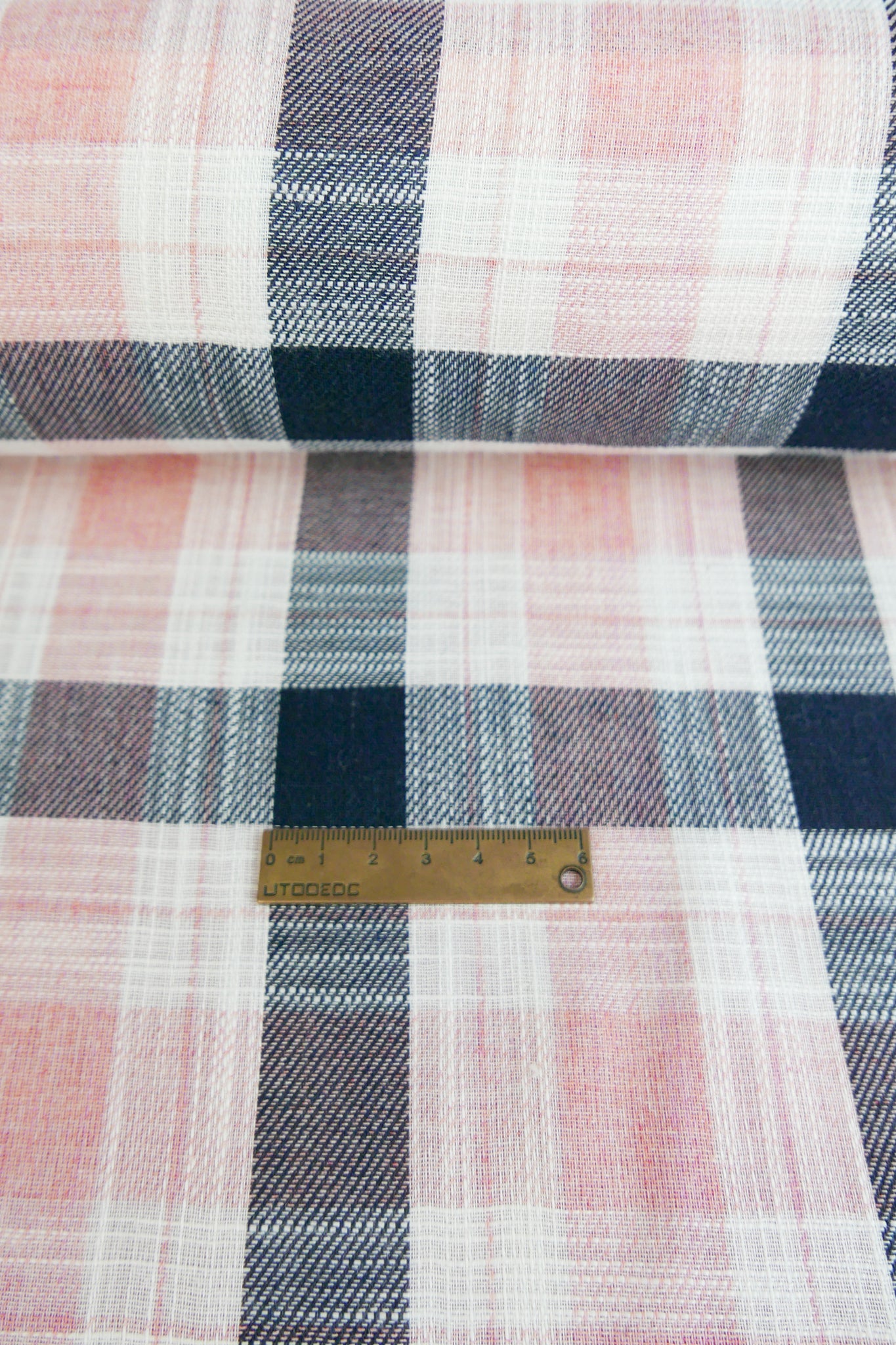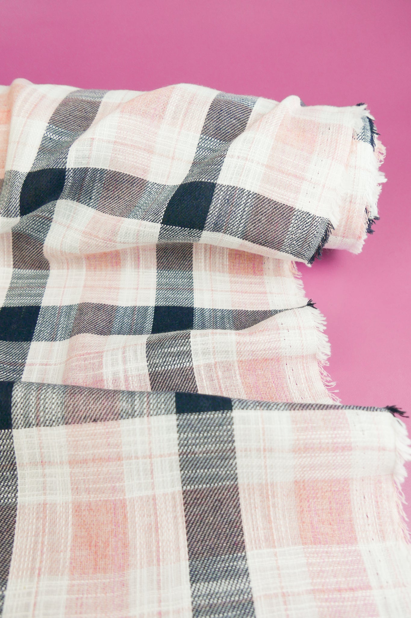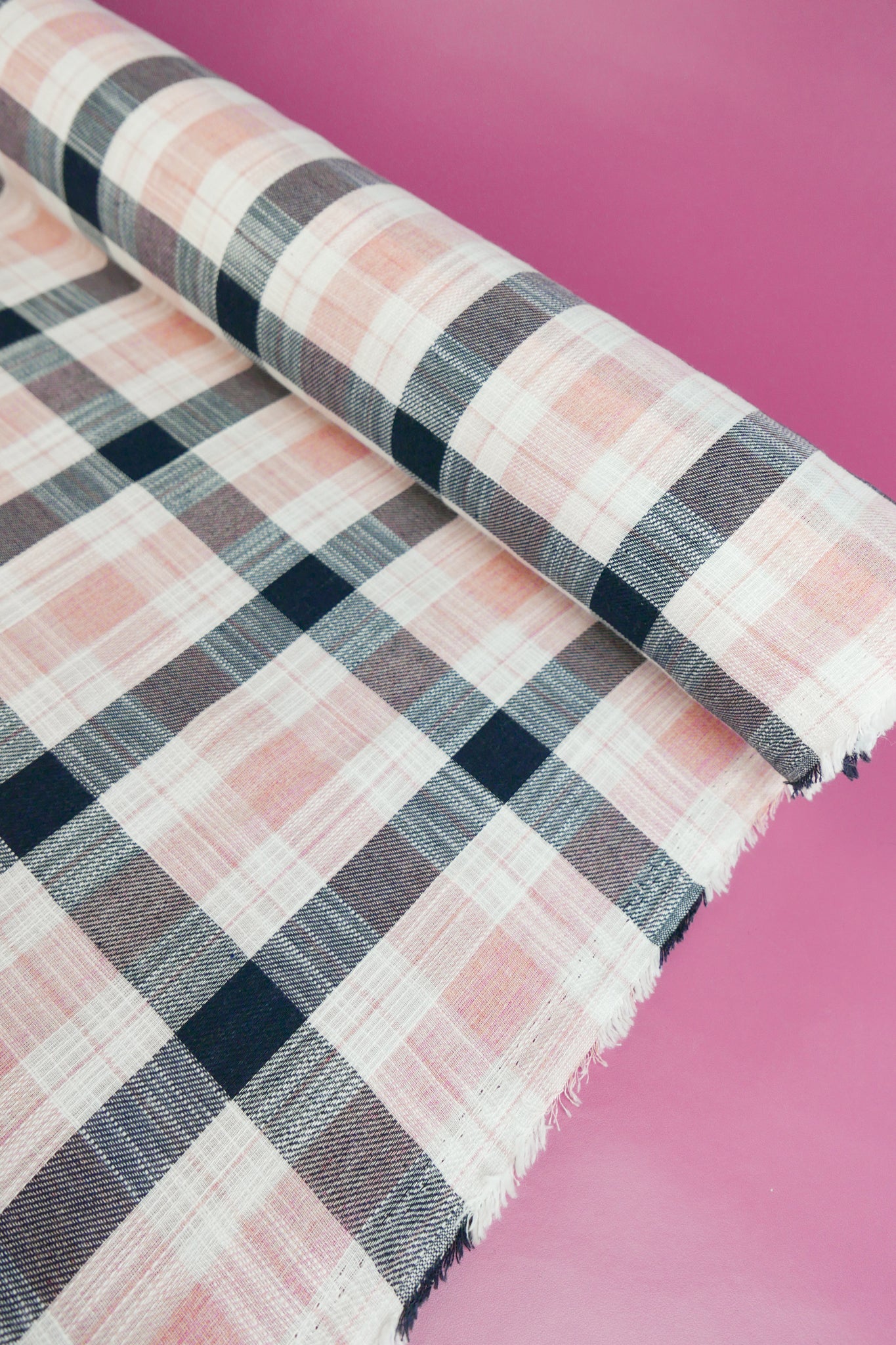 Roberta is a beautiful midweight linen gauze with slubs throughout, coming in a yarn-dyed check in rose, navy and off-white. Loosely woven and semi-opaque, it has a summery, everyday quality to it with good structured drape. Perfect for summer-weight dresses, blouses and skirts.